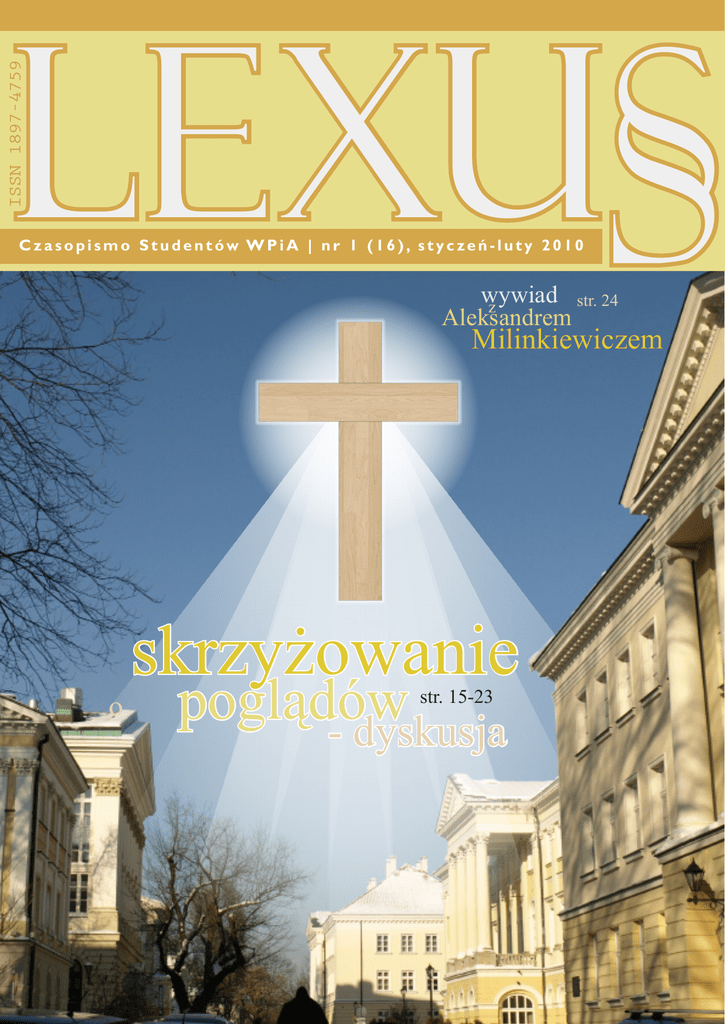 ISSN 1897-4759 LEXU§ Czasopismo Studentów WPiA | nr 1 (16), styczeń-luty 2010 wywiad str. 24 z Aleksandrem Milinkiewiczem o skrzyżowanie poglądów - dyskusja str. 15-23 spis treści Profesor Juliusz Bardach – wspomnienie Anna Baryła Wydarzenia Sylwester w lesie, czyli Przysucha Z ostatniej Rady Konferencja „IP a prawo konkurencji” Koło Naukowe Prawa Europejskiego Ferie Akademickie 2010 s.5 s.6 Informacje Moneta Aurea i Moneta Platina RKN bez tajemnic cz.2 Podanie w pigułce Podanie do Komisji Stypendialnej s.7 s.7 s.10 s.10 Publicystyka Do something, say something, be something Parytety – obelga dla pięknej płci Skrzyżowanie poglądów d Krzyż a nietolerancja y Polemika s Obligatoryjność ekspozycji k symbolu religijnego w szkołach u publicznych a wolność w s sprawach wyznaniowych j a Krzyż i III Rzesza Replika na krzyż fot. PAN Nie ma i nie może być w Polsce prawnika, który ukończywszy studia po II wojnie światowej, nie zetknąłby się z nim osobiście jako student, doktorant, uczestnik jakiejś konferencji naukowej, czy chociażby tylko czytelnik napisanych przez niego podręczników czy rozpraw – tak pisał o zmarłym 26 stycznia w Warszawie Profesorze Juliuszu Bardachu Jacek Sobczak, sędzia SN. Profesor Bardach zmarł w wieku 95 lat, pozostawiając po sobie ogromny dorobek naukowy w postaci prawie sześciuset prac, w tym fundamentalnych syntez: Historii państwa i prawa Polski do połowy XV wieku (1957) oraz Historii państwa i prawa polskiego (1976). A le co my, studenci Uniwersytetu Warszawskiego, wiemy o profesorze Bardachu? Kim był, kim jest dla nas, prócz tego, że współautorem słynnego podręcznika do Historii Państwa i Prawa Polskiego? Juliusz Bardach urodził się 3 listopada, w roku wybuchu I Wojny Światowej. Studia na Uniwersytecie im. Stefana Batorego związały go naukowo i emocjonalnie z Wilnem - miłym miastem nad Wilią jak zwykł o nim mówić. Jednakże to z Uniwersytetem Warszawskim współpracował od lat sześćdziesięciu, wykładając i przez czternaście lat kierując Instytutem Historii Państwa i Prawa. Na studiach zaczął interesować się historią prawa i, jak wiemy, z tego młodzieńczego zainteresowania, uczynił życiową pasję. Być może u źródeł tej fascynacji legły ówczesne nastroje, które czyniły z dziedziny dziś postrzeganej przez większość jako mało fascynującą, przedmiot silnie eksploatowany. W Polsce, pozbawionej przez cały wiek XIX i początek XX własnej państwowości, historia ustroju dawnej Rzeczypospolitej była sprawą szczególnie ważką i za taką powszechnie uchodziła. Badania naukowe prowadzone przez profesora Bardacha, a będące wynikiem jego ciekawości świata tak właśnie ukierunkowanej, 2 w w w. s a m o r z a d . w p i a . u w. e d u . p l / L E X U S S zaowocowały tytułem profesorskim, trzema doktoratami honoris causa uniwersytetów: Łódzkiego, Warszawskiego i Wileńskiego, członkostwem Towarzystwa Naukowego Warszawskiego, Polskiej Akademii Nauk, Komitetu Nauk Historycznych PAN, Komitetu Nauk Prawnych PAN. Profesor Bardach był nie tylko naukowcem, bardzo cenił sobie także współpracę ze studentami. Uważał, że uczeń to kontynuator, ale także i krytyk, czasem surowy, swojego mistrza. Ten zaś nieraz niemało może się od uczniów nauczyć. Dziś możemy korzystać już tylko z dorobku naukowego profesora, który utrwalił w swoich pracach, uznanych nie tylko przez środowiska naukowe. Rozprawy profesora Bardacha są szczególnie cenne dla nas, studentów, odbija się w nich bowiem precyzja myślenia autora, głęboka wiedza oraz autentyczne zainteresowanie prezentowanymi tematami. Z wielkim żalem pożegnaliśmy profesora Juliusza Bardacha, nestora i opiekuna polskich historyków prawa, człowieka zasłużonego dla nauki, którą się zajmował, oraz dla naszego Uniwersytetu. W naszej epoce, w której wszystko przemija, umyka z powszechnej pamięci znacznie szybciej niż w czasach minionych, możemy nie tylko mieć nadzieję, ale też dołożyć starań, by pamięć o ważnych postaciach, takich jak profesor Bardach, trwała jak najdłużej. s.11 s.13 s.15 s.15 s.16 s.18 s.22 s.23 Wywiad Jesteście elitą narodu Rozumność to trudny wyraz Ordnung muss immer sein s.24 s.27 s.30 Kultura “Imaginarium of doctor Parnassus” Zdrada inaczej Interpretacja Szwedzi na tropie! O Mrożku Prawnik na ekranie i co z tego wynika s.32 s.33 s.34 s.35 s.36 s.38 Misz-masz Wichrowe wzgórza i szpilki z przeceny s.39 Komiks s.41 LEXU§ Czas na zmiany s.4 s.4 s.5 Maciej Bisch Z awsze uważałem, że zmiany mają swój pozytywny aspekt i, będąc do szpiku kości przesiąknięty optymizmem, wolę przytoczyć korzyści z nich płynące. Szczególnie mając podstawy do twierdzenia, że są to zmiany na lepsze. Przede wszystkim zmiany rodzą dalsze zmiany, które przy odrobinie szczęścia i ciężkiej pracy przeradzają się w postęp. Jedno jest pewne i niezaprzeczalne – najgorsze jest popadnięcie w stagnację i rutynę w tym, co się robi, bowiem wszystko wokół idzie naprzód, a my zostajemy w lesie. Wierzę, że w przypadku „Lexussa” zmiana, jaką jest moja rezygnacja z funkcji Redaktora Naczelnego i szereg dalszych, które niewątpliwie nastąpią, zaowocują jeszcze lepszymi wynikami, rozwojem i, przede wszystkim, dalszym wydawaniem tego wyjątkowego czasopisma. Miło będę wspominać czas spędzony na tworzeniu kolejnych numerów wraz ze wspaniałymi ludźmi pracującymi w Redakcji, a także wszystkimi, którzy z nią współpracowali. Z dumą pełniłem funkcję Redaktora Naczelnego i z radością przyglądałem się, jak gotowe numery znikają z Wydziału jak świeże bułeczki. Czemu zatem rezygnuję przed upływem umownej kadencji? Z kilku powodów. Po pierwsze do tej pory istniało coś, co pchało mnie do przodu i kopało za każdym razem, kiedy się zatrzymywałem (o cofaniu nawet boję się myśleć); teraz tego zabrakło. Drugim powodem jest konflikt