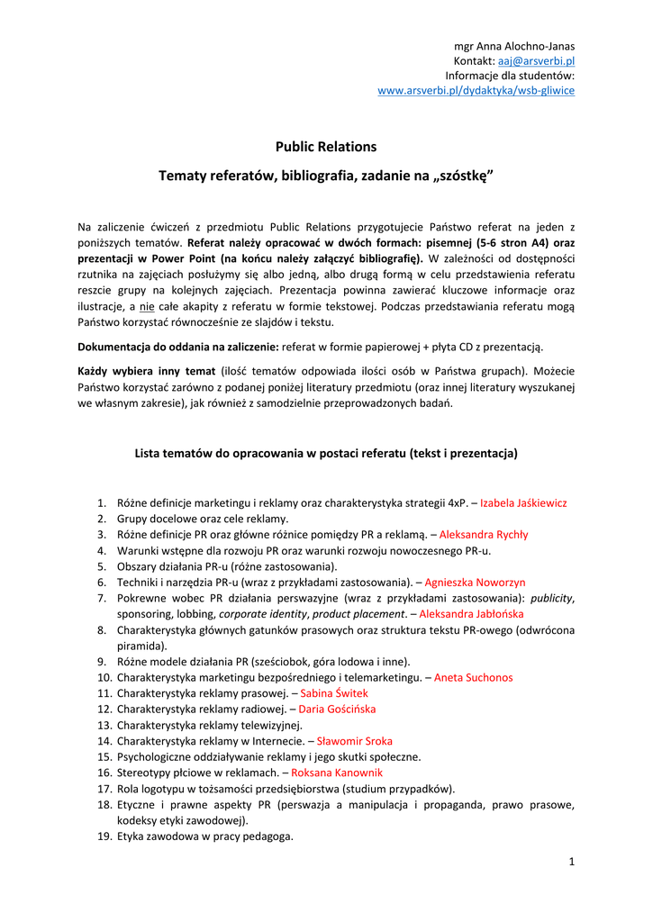Public Relations Tematy referatów, bibliografia, zadanie