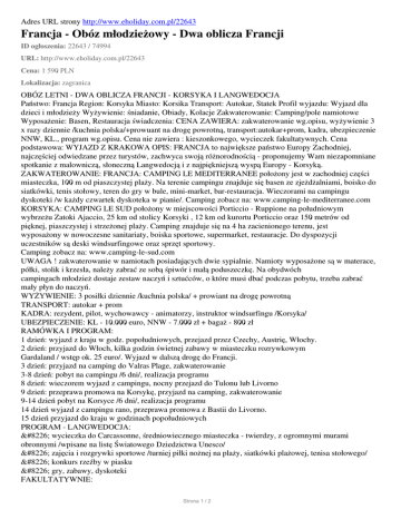 Adres URL strony http://www.eholiday.com.pl/22643 Francja - Obóz młodzieżowy - Dwa oblicza Francji ID ogłoszenia: 22643 / 74994 URL: http://www.eholiday.com.pl/22643 Cena: 1 590 PLN Lokalizacja: zagranica OBÓZ LETNI - DWA OBLICZA FRANCJI - KORSYKA I LANGWEDOCJA Państwo: Francja Region: Korsyka Miasto: Korsika Transport: Autokar, Statek Profil wyjazdu: Wyjazd dla dzieci i młodzieży Wyżywienie: śniadanie, Obiady, Kolacje Zakwaterowanie: Camping/pole namiotowe Wyposażenie: Basen, Restauracja świadczenia: CENA ZAWIERA: zakwaterowanie wg.opisu, wyżywienie 3 x razy dziennie /kuchnia polska/+prowuant na drogę powrotną, transport:autokar+prom, kadra, ubezpieczenie NNW, KL., program wg.opisu. Cena nie zawiera : kieszonkowego, wycieczek fakultatywnych. Cena podstawowa: WYJAZD Z KRAKOWA OPIS: FRANCJA to największe państwo Europy Zachodniej, najczęściej odwiedzane przez turystów, zachwyca swoją różnorodnością - proponujemy Wam niezapomniane spotkanie z malowniczą, słoneczną Langwedocją i z najpiękniejszą wyspą Europy - Korsyką. ZAKWATEROWANIE: FRANCJA: CAMPING LE MEDITERRANEE położony jest w zachodniej części miasteczka, 100 m od piaszczystej plaży. Na terenie campingu znajduje się basen ze zjeżdżalniami, boisko do siatkówki, tenis stołowy, teren do gry w bule, mini-market, bar-restauracja. Wieczorami na campingu dyskoteki /w każdy czwartek dyskoteka w pianie/. Camping zobacz na: www.camping-le-mediterranee.com KORSYKA: CAMPING LE SUD położony w miejscowości Porticcio - Ruppione na południowym wybrzeżu Zatoki Ajaccio, 25 km od stolicy Korsyki , 12 km od kurortu Porticcio oraz 150 metrów od pięknej, piaszczystej i strzeżonej plaży. Camping znajduje się na 4 ha zacienionego terenu, jest wyposażony w nowoczesne sanitariaty, boiska sportowe, supermarket, restauracje. Do dyspozycji uczestników są deski windsurfingowe oraz sprzęt sportowy. Camping zobacz na: www.camping-le-sud.com UWAGA ! zakwaterowanie w namiotach posiadających dwie sypialnie. Namioty wyposażone są w materace, półki, stolik i krzesła, należy zabrać ze sobą śpiwór i małą poduszeczkę. Na obydwóch campingach młodzież dostaje zestaw naczyń i sztućców, o które musi dbać podczas pobytu, trzeba zabrać mały płyn do naczyń. WYŻYWIENIE: 3 posiłki dziennie /kuchnia polska/ + prowiant na drogę powrotną TRANSPORT: autokar + prom KADRA: rezydent, pilot, wychowawcy - animatorzy, instruktor windsurfingu /Korsyka/ UBEZPIECZENIE: KL - 10.000 euro, NNW - 7.000 zł + bagaż - 800 zł RAMÓWKA I PROGRAM: 1 dzień: wyjazd z kraju w godz. popołudniowych, przejazd przez Czechy, Austrię, Włochy. 2 dzień: przyjazd do Włoch, kilka godzin świetnej zabawy w miasteczku rozrywkowym Gardaland / wstęp ok. 25 euro/. Wyjazd w dalszą drogę do Francji. 3 dzień: przyjazd na camping do Valras Plage, zakwaterowanie 3-8 dzień: pobyt na campingu /6 dni/, realizacja programu 8 dzień: wieczorem wyjazd z campingu, nocny przejazd do Tulonu lub Livorno 9 dzień: przeprawa promowa na Korsykę, przyjazd na camping, zakwaterowanie 9-14 dzień pobyt na Korsyce /6 dni/, realizacja programu 14 dzień wyjazd z campingu rano, przeprawa promowa z Bastii do Livorno. 15 dzień przyjazd do kraju w godzinach popołudniowych PROGRAM - LANGWEDOCJA: • wycieczka do Carcassonne, średniowiecznego miasteczka - twierdzy, z ogromnymi murami obronnymi /wpisane na listę Światowego Dziedzictwa Unesco/ • zajęcia i rozgrywki sportowe /turniej piłki nożnej na plaży, siatkówki plażowej, tenisa stołowego/ • konkurs rzeźby w piasku • gry, zabawy, dyskoteki FAKULTATYWNIE: Strona 1 / 2 wycieczka do Barcelony /Hiszpania/. W programie: Las Ramblas, Park Guell, Sagrada Familia, stadion Nou Camp /wejście na stadion płatne dodatkowo/. Cena wycieczki - 30 euro PROGRAM - KORSYKA: • zajęcia z windsurfingu • nauka gry w petanque /gra w kule/ • warsztaty z języka francuskiego - wycieczka do stolicy Korsyki Ajaccio, rodzinnego miasta Napoleona Bonaparte, zwiedzanie domu Napoleona Bonaparte - miasto zachwyca śródziemnomorską atmosferą, przejazd na Półwysep La Parata skąd widać legendarne Krwawe Wyspy FAKULTATYWNIE: - wycieczka do Bonifacio - pirackiego portu i fortecy, który wznosi się na wapiennych skałach 70 m nad wodami Morza Śródziemnego , w pogodne dni widać oddaloną o 12 km Sardynię. Jedyna okazja aby zobaczyć legendarne schody Króla Aragonii. Cena wycieczki - 30 euro /dla chętnych rejs statkiem - ok. 12 euro/ - wycieczka do Porto i unikalnego rezerwatu skał Les Calanches - czerwone, pomarańczowe szare urwiska i iglice to kolejny przykład niezwykłej przyrody Korsyki. Cena wycieczki -28 euro CENA: : TERMIN: 05.07-19.07.2010 CENA: 1590 ZŁ. TERMIN: 21.07-04.08.2010 CENA: 1590 ZŁ. TERMIN: 09.08-23.08.2010 CENA: 1590 ZŁ. UWAGA: wycieczki fakultatywne wymagają określonej ilości uczestników Atrakcje: LANGWEDOCJA: •wycieczka do Carcassonne, średniowiecznego miasteczka - twierdzy, z ogromnymi murami obronnymi /wpisane na listę Światowego Dziedzictwa Unesco/ •zajęcia i rozgrywki sportowe /turniej piłki nożnej na plaży, siatkówki plażowej, tenisa stołowego/ •konkurs rzeźby w piasku •gry, zabawy, dyskoteki KORSYKA: •zajęcia z windsurfingu •nauka gry w petanque /gra w kule/ •warsztaty z języka francuskiego •wycieczka do stolicy Korsyki Ajaccio, rodzinnego miasta Napoleona Bonaparte, zwiedzanie domu Napoleona Bonaparte - miasto zachwyca śródziemnomorską atmosferą, przejazd na Półwysep La Parata skąd widać legendarne Krwawe Wyspy CENNIK termin dni typ oferty grupa cenowa cena od osoby miejsca od:2010-07-05 do:2010-0 7-19 15 katalogowa A 1590 PLN sprawdź miejsca od:2010-07-21 do:2010-0 8-04 15 katalogowa A 1590 PLN sprawdź miejsca od:2010-08-09 do:2010-0 8-23 15 katalogowa A 1590 PLN sprawdź miejsca Biuro Podróży GEOTOUR UL. SOBIESKIEGO 8 41-500 CHORZÓW tel/fax: 32 249 14 53, 3460306, 3460307 tel.kom 500-55-66-00 e-mail: [email protected] 
