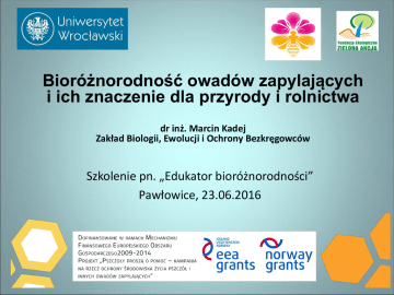 Bioróżnorodność owadów zapylających i ich znaczenie dla przyrody i rolnictwa dr inż. Marcin Kadej Zakład Biologii, Ewolucji i Ochrony Bezkręgowców Szkolenie pn. „Edukator bioróżnorodności” Pawłowice, 23.06.2016 Część I Wprowadzenie do biologii zapylania Zapylanie • Zapylenie jest to proces przeniesienia ziarna pyłku na znamię słupka anemogamia hydrogamia zoogamia Kwiaty Dlaczego zapylanie jest tak ważne? • Rozmnażanie płciowe jest ważne dla ewolucji, bo: sprzyja różnorodności na poziomie genetycznym różnorodność jest niezbędna z uwagi na dobór naturalny zapłodnienie krzyżowe = dobrze (podczas gdy np. samozapłodnienie i chów wsobny = źle) Samozapylenie – dlaczego nie? • Przed samozapyleniem kwiaty zabezpieczają się w różny sposób: przez wytworzenie osobno kwiatów żeńskich i męskich na tej samej roślinie lub na roślinach o różnych płciach, np. wierzby w kwiatach obupłciowych często następuje czasowe oddzielenie płci przez nierównomierne dojrzewanie pręcików i słupków w kwiecie Jeżeli pręciki dojrzewają wcześniej, mamy do czynienia z tzw. przedprątnością, jeżeli słupki wcześniej gotowe są na przyjęcie pyłku, mamy do czynienia z tzw. przedsłupnością Kwiaty • Około 100 mln lat temu pojawiają się pierwsze kwiaty • Nowy typ układu: roślina – zwierzę niemożność poruszania się – mobilność, zwierzę w roli nośnika komórek rozrodczych (przedtem wiatr i woda) Kwiaty • Pierwsze były sagowce, których pyłkiem objadały się chrząszcze • W naszym klimacie 20% roślin kwiatowych nadal polega na wietrze (ich kwiaty są niepozorne, bezwonne, pyłek zaś lekki i mniejszy) Kwiaty jako baner reklamowy • Narzędzia reklamowe: Barwy (kolory) Zapach Nektar Pyłek Kwiaty jako baner reklamowy Widzenie barw u owadów jest inne niż człowieka (przesunięte spektrum widzenia barw), z pozoru podobne żółte kwiaty pszonaku dla pszczół są odpowiednio żółte i purpurowe, zielone liście są szare z nalotem żółtawym Kwiaty jako baner reklamowy • Pszczoły nie odróżniają barwy czerwonej od czarnej • Stąd w naszej florze „entomogamicznej” kwiaty barwy czerwonej są rzadkie • Kwiaty maku polnego dodatkowo odbijają nadfiolet (dla pszczół są ciemno fioletowe) Kwiaty jako baner reklamowy • Zapach produkowany w płatkach korony jest najczęściej przez gruczoły • Niektóre rośliny maja niepozorne kwiaty, ale silnie pachnące (np. lipy) • Podstawowym składnikiem monoterpeny i ich pochodne substancji zapachowych są Kwiaty jako baner reklamowy • Pszczoły miodne odróżniają prawie 50 różnych kombinacji olejków eterycznych, przy czym mają podobnie czuły zmysł jak my • Niekiedy jednak niemiłe dla nas zapachy wabią pszczoły (np. głóg i bez czarny) • Ulubionymi zapachami olejki eteryczne cytrynowe i podobne • Tresura pszczół – metoda Gubina (dodawanie do syropu aromatów kwiatowych) • Spryskiwanie plantacji odpowiednimi zapachami Kwiaty jako baner reklamowy Dziwidło olbrzymie (Amorphophallus titanum) • kwiatostan może osiągnąć wysokość 3m • wydziela zapach przypominający gnijące mięso, który przyciąga owady zapylające kwiat • kwitnie po raz pierwszy w 8-10 roku życia • po kwitnieniu następuje czas spoczynku trwający 12-18 m-cy Kwiaty jako baner reklamowy Pyłek, skład: - białka, np. u wierzby ponad 50% zawartości w suchej masie, u koniczyny tylko 23% - węglowodany (skrobia - u koniczyny prawie 30%) - tłuszcze i witaminy Kwiaty jako baner reklamowy Pyłek - niektóre roślin produkują bardzo duże ilości pyłku np. gryka (nawet 400kg/ha), czy facelia (ponad 1t/ha) Kwiaty jako baner reklamowy • Nektar produkowany jest przez nektarniki/miodniki zwykle ulokowane na dnie kwiatu • Skład: roztwór różnego rodzaju cukrów (glukozy, fruktozy, sacharozy) z dodatkiem niewielkiej ilości aminokwasów, witamin, barwników i składników mineralnych Kwiaty jako baner reklamowy • Nektaria najczęściej kwiatów kwiatowe) występują w obrębie (nektaria • Czasami jednak na innych częściach rośliny; na ogonkach liściowych i głównym nerwie liścia (np. u akacji i śliwy), na liściach przykwiatowych, lub w kątach nerwów liści • Są to tzw. pozakwiatowe nektaria Miodniki na głównym nerwie liścia śliwy Kwiaty jako baner reklamowy Kwiaty jako baner reklamowy • Ilość produkowanego nektaru przez gatunki roślin służy do obliczania tzw. wydajności nektarowej, która z kolei służy do obliczenia wydajności miodowej • Aby obliczyć ww. wartość potrzebna jest wiedza o: przeciętnej ilości nektaru wydzielanej przez jeden kwiat w ciągu doby liczbie dni trwania jednego kwiatu oraz liczbie kwiatów przypadających na 1 hektar • Dodając proporcję cukrów w nektarze kwiatów danego gatunku można otrzymać wydajność miodową uprawy • Do najbardziej wydajnych miodowo roślin należą: robinia akacjowa, lipa drobnolistna, gryka, czy facelia Kwiaty jako baner reklamowy • Inne nagrody? Włoski i łuski jadalne (np. obuwik pospolity), olejki tłuszczowe, ciałka jadalne Perfumy – amerykańskie samce pszczół z plemienia Euglossini zbierają do goleni olejki eteryczne, które służą im do zwabiania partnerek. Kwiaty jako baner reklamowy • Inne nagrody? Seks – kwiaty storczyków z rodzaju Ophrys (dwulistnik) wyglądem wiernie naśladują samice i samce podejmują z nimi próby kopulacji. Kwiaty jako baner reklamowy • https://www.youtube.com/watch?v=wmgKABRCZpo Koewolucja • Skrajny przypadek: storczyk Angraecum sesquipedale „Właśnie otrzymałem przesyłkę od pana Batemana z zaskakującą Angraecum sesquipedalia mającą nektarium długie na stopę – Dobry Boże, cóż za owad może z niego ssać [?]” (Ch. Darwin) • Ostroga tego gatunku osiąga 20–35 cm długości; epitet gatunkowy „sesquipedale” oznacza „półtorej stopy” Koewolucja Angraecum sesquipedale Kwiaty pułapki Zapyla