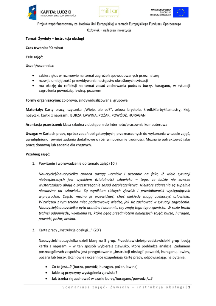 Temat: Żywioły – instrukcja obsługi Czas trwania: 90 minut Cele zajęć: Uczeń/uczennica: zabiera głos w rozmowie na temat zagrożeń spowodowanych przez naturę rozwija umiejętność przewidywania następstw określonych sytuacji ma okazję do refleksji na temat zasad zachowania podczas burzy, huraganu, w sytuacji zagrożenia powodzią, lawiną, pożarem Formy organizacyjne: zbiorowa, zindywidualizowana, grupowa Materiały: Karty pracy, czytanka „Wieje, ale co?”, arkusz brystolu, kredki/farby/flamastry, klej, nożyczki, kartki z napisami: BURZA, LAWINA, POŻAR, POWÓDŹ, HURAGAN Aranżacja przestrzeni: klasa szkolna z dostępem do Internetu/pracownia komputerowa Uwaga: w Kartach pracy, oprócz zadań obligatoryjnych, przeznaczonych do wykonania w czasie zajęć, uwzględniono również zadania dodatkowe o różnym poziomie trudności. Można je potraktować jako pracę domową lub zadanie dla chętnych. Przebieg zajęć: 1. Powitanie i wprowadzenie do tematu zajęć (10’) Nauczyciel/nauczycielka zwraca uwagę uczniów i uczennic na fakt, iż wiele sytuacji niebezpiecznych jest wynikiem działalności człowieka – tego, że ludzie nie zawsze wystarczająco dbają o przestrzeganie zasad bezpieczeństwa. Niektóre zdarzenia są zupełnie niezależne od człowieka. Są wynikiem różnych zjawisk i prawidłowości występujących w przyrodzie. Często można je przewidzieć, choć niekiedy mogą zaskoczyć człowieka. W związku z tym trzeba mieć podstawową wiedzę, jak się zachować w sytuacji zagrożenia. Nauczyciel/nauczycielka pyta uczniów i uczennic, czy znają tego typu zjawiska. W razie braku trafnej odpowiedzi, wymienia te, które będą przedmiotem niniejszych zajęć: burza, huragan, powódź, pożar, lawina. 2. Karta pracy „Instrukcja obsługi…” (20’) Nauczyciel/nauczycielka dzieli klasę na 5 grup. Przedstawiciele/przedstawicielki grup losują kartki z napisami – w ten sposób wybierają zjawisko, które poddadzą analizie. Zadaniem poszczególnych zespołów jest przygotowanie „instrukcji obsługi” powodzi, huraganu, lawiny, pożaru lub burzy. Uczniowie i uczennice uzupełniają Kartę pracy, odpowiadając na pytania: Co to jest…? (burza, powódź, huragan, pożar, lawina) Jakie są przyczyny wystąpienia zjawiska? Jak trzeba się zachować w czasie burzy/huraganu/powodzi/…? Scenariusz zajęć- Żywioły – instrukcja obsługi|1 Jakich zachowań należy unikać? Jakie służby należy powiadomić? Uczniowie i uczennice prezentują wypełnione arkusze na forum Nauczyciel/nauczycielka uzupełnia, ewentualnie koryguje prace uczniów i uczennic. klasy. 3. Jestem… burzą, ogniem, huraganem – zabawa ruchowa (10’) Osoby chętne gestem, postawą ciała, dźwiękiem naśladują wybrane przez siebie zjawiska, pozostała część grupy rozpoznaje i naśladuje/prezentuje alternatywne rozwiązania. Powtarzamy kilkukrotnie. Alternatywa: improwizacja przy muzyce – prezentujemy odgłosy burzy, padającego deszczu, ogniska, itp. Uczniowie i uczennice gestem ilustrują usłyszane dźwięki. 4. Skutki groźnych zjawisk (15’) Uczniowie i uczennice w grupach, wykorzystując technikę „Napisz i narysuj”, na rysunku przedstawiają skutki scharakteryzowanych przez siebie zjawisk. Po skończonej pracy, wspólnie z nauczycielem/nauczycielką omawiają powstałe plakaty. Jeżeli przestrzeń klasy na to pozwala, można je wywiesić na ścianie, korytarzu, itp. 5. „Wieje, ale co?” – praca z czytanką i Kartą pracy (20’) Nauczyciel/nauczycielka rozdaje uczniom Karty pracy, a następnie odczytuje czytankę „Wieje, ale co?” Uczniowie i uczennice szukają stosownych informacji w Internecie i uzupełniają Kartę pracy. Chętni odczytują uzupełnione teksty. Nauczyciel/nauczycielka sprawdza poprawność odpowiedzi udzielonych przez poszczególnych uczniów i uczennice, w razie potrzeby koryguje. 6. Żywioły w języku (10’) Nauczyciel/nauczycielka wyjaśnia uczniom i uczennicom, że omawiane zjawiska, za sprawą siły ich oddziaływania trafiły do języka potocznego na określenie różnych intensywnych stanów czy sytuacji. Stały się elementami często używanych związków frazeologicznych (w razie potrzeby nauczyciel/nauczycielka definiuje pojęcie). Celem ćwiczenia jest wyjaśnienie, co oznaczają następujące związki wyrazowe: Oko cyklonu Pożar serc Burza w szklance wody Lawina/huragan uczuć Wiatr historii 7. Podsumowanie zajęć (5’) Scenariusz zajęć- Żywioły – instrukcja obsługi|2