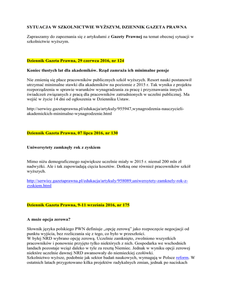 SYTUACJA W SZKOLNICTWIE WYŻSZYM, DZIENNIK GAZETA PRAWNA Zapraszamy do zapoznania się z artykułami z Gazety Prawnej na temat obecnej sytuacji w szkolnictwie wyższym. Dziennik Gazeta Prawna, 29 czerwca 2016, nr 124 Koniec tłustych lat dla akademików. Rząd zamraża ich minimalne pensje Nie zmienią się płace pracowników publicznych szkół wyższych. Resort nauki postanowił utrzymać minimalne stawki dla akademików na poziomie z 2015 r. Tak wynika z projektu rozporządzenia w sprawie warunków wynagradzania za pracę i przyznawania innych świadczeń związanych z pracą dla pracowników zatrudnionych w uczelni publicznej. Ma wejść w życie 14 dni od ogłoszenia w Dzienniku Ustaw. http://serwisy.gazetaprawna.pl/edukacja/artykuly/955947,wynagrodzenia-nauczycieliakademickich-minimalne-wynagrodzenie.html Dziennik Gazeta Prawna, 07 lipca 2016, nr 130 Uniwersytety zamknęły rok z zyskiem Mimo niżu demograficznego największe uczelnie miały w 2015 r. niemal 200 mln zł nadwyżki. Ale i tak zapowiadają cięcia kosztów. Dotkną one również pracowników szkół wyższych. http://serwisy.gazetaprawna.pl/edukacja/artykuly/958089,uniwersytety-zamknely-rok-zzyskiem.html Dziennik Gazeta Prawna, 9-11 września 2016, nr 175 A może opcja zerowa? Słownik języka polskiego PWN definiuje „opcję zerową” jako rozpoczęcie negocjacji od punktu wyjścia, bez rozliczania się z tego, co było w przeszłości. W byłej NRD wybrano opcję zerową. Uczelnie zamknięto, zwolniono wszystkich pracowników i ponownie przyjęto tylko niektórych z nich. Gospodarka we wschodnich landach pozostaje wciąż daleko w tyle za resztą Niemiec. Jednak w wyniku opcji zerowej niektóre uczelnie dawnej NRD awansowały do niemieckiej czołówki. Szkolnictwo wyższe, podobnie jak sektor badań naukowych, wymagają w Polsce reform. W ostatnich latach przygotowano kilka projektów radykalnych zmian, jednak po naciskach środowiska akademickiego i poprawkach w parlamencie zamieniały się one w drobne korekty. Dalej utrwalają rzucające się w oczy patologie. Obecny rząd także zapowiada gruntowną reformę. Stworzył już trzy zespoły, które mają zaproponować zmiany. Ich członkowie dysponują wiedzą, żeby sprostać wyzwaniu. Rząd zdefiniował też cele, które – w imieniu podatników – stawia przed nauką i szkolnictwem wyższym. http://forsal.pl/artykuly/974804,a-moze-opcja-zerowa-oto-ciekawa-recepta-na-uleczeniepolskich-uczelni.html Dziennik Gazeta Prawna, 12 września 2016, nr 176 Bezpłatne studia dla prymusów Spadnie liczba miejsc na darmowych studiach. Uczelnie będą przyjmować tylko maturzystów z najlepszymi wynikami – taki skutek może wywołać propozycja resortu nauki. Głównym źródłem problemów uczelni jest zły system finansowania. W dużej mierze dotacja dla nich zależy od liczby studentów. Dlatego opłaca im się przyjmować jak najwięcej kandydatów. W sytuacji niżu demograficznego uczelnie gonią za studentami. To prowadzi do obniżania wymagań i jakości kształcenia – uważa Jarosław Gowin, wicepremier, minister nauki i szkolnictwa wyższego. I zapowiada, że już w tym tygodniu resort nauki zaproponuje nowy algorytm finansowania uczelni. https://edgp.gazetaprawna.pl/artykuly/633948,bezplatne-studia-dla-prymusow.html Dziennik Gazeta Prawna, 19 września 2016, nr 181 Słabe uczelnie do likwidacji. Nie pomoże już nawet rektor Rząd zamierza zamknąć niektóre publiczne szkoły wyższe. Z naszych ustaleń wynika, że na pierwszy ogień może pójść Państwowa Wyższa Szkoła Zawodowa w Sandomierzu. Po niej pod nóż trafią kolejne? http://serwisy.gazetaprawna.pl/edukacja/artykuly/976954,rzad-zamyka-slabe-uczelnie.html Dziennik Gazeta Prawna, 20 września 2016, nr 182 Autonomia albo renoma. Na czele uczelni badawczej stanie menedżer Resort nauki chce, aby w Polsce powstały uczelnie badawcze. Utworzy dla nich specjalną ścieżkę. Będą mogły liczyć na dodatkowe pieniądze, ale pod warunkiem, że zrezygnują z części praw. http://serwisy.gazetaprawna.pl/edukacja/artykuly/977291,uczelnie-badawcze-na-czelemenedzer.html Dziennik Gazeta Prawna, 22 września 2016, nr 184 Najpierw granty, potem Noble Reforma, którą planujemy, powinna w ciągu 8–10 lat doprowadzić do wyłonienia uczelni, które będą miały szanse rywalizować z najlepszymi. Może jeszcze nie ze Stanów Zjednoczonych, ale z Europy jak najbardziej - zapowiada w rozmowie z DGP Jarosław Gowin, wicepremier oraz minister nauki i szkolnictwa wyższego. http://wiadomosci.dziennik.pl/opinie/artykuly/531485,jaroslaw-gowin-najpierw-grantypotem-noble-wywiad-rozmowa-dgp.html Dziennik Gazeta Prawna, 29.092016, nr 189 Startuje rok akademicki 2016/2017. Poznaj nowe zasady obowiązujące w szkołach wyższych Więcej środków na stypendia dla najlepszych studentów, mniejsza liczba miejsc na studiach doktoranckich i odbiurokratyzowanie procedur. To tylko niektóre zmiany, jakie wprowadza już od 1 października br. nowelizacja z 23 czerwca 2016 r. ustawy – Prawo o szkolnictwie wyższym (Dz.U. poz. 1311). Ale to dopiero początek. Resort nauki bowiem kończy – o czym pisaliśmy wczoraj – pracę nad przepisami, które przyspieszą likwidację słabszych szkół wyższych, które obecnie pożyczają kadrę od uniwersytetów. http://serwisy.gazetaprawna.pl/edukacja/artykuly/979828,rok-akademicki-2016-2017-nowezasady.html Dziennik Gazeta Prawna, 04.10.2016, nr 192 Hekatomba na uczelniach. Studenci i nauczyciele na bruk Uczelnie zaczną się pozbywać studentów. Jeżeli to nie pomoże, zwolnią część kadry akademickiej. Taki efekt zdaniem Komitetu Kryzysowego Humanistyki Polskiej wywołają nowe zasady naliczania dotacji dla szkół wyższych, które zaproponował resort nauki. Dzisiaj organizacja postanowiła zorganizować konferencję przed bramą Uniwersytetu Warszawskiego. Nowy projekt zmian w algorytmie podziału dotacji dydaktycznej może mieć fatalne konsekwencje dla mniejszych i średn