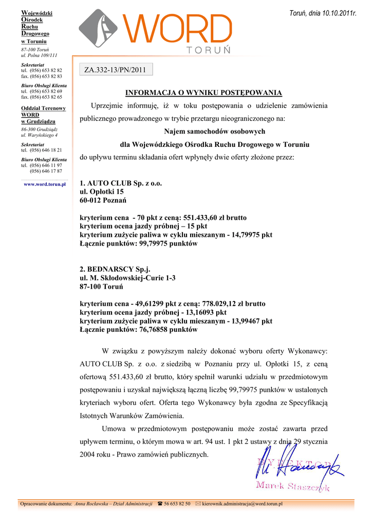 Wojewódzki Ośrodek Ruchu Drogowego Toruń, dnia 10.10.2011r. w Toruniu 87-100 Toruń ul. Polna 109/111 Sekretariat tel. (056) 653 82 82 fax. (056) 653 82 83 Biuro Obsługi Klienta tel. (056) 653 82 69 fax. (056) 653 82 65 Oddział Terenowy WORD w Grudziądzu ZA.332-13/PN/2011 INFORMACJA O WYNIKU POSTĘPOWANIA Uprzejmie informuję, iż w toku postępowania o udzielenie zamówienia publicznego prowadzonego w trybie przetargu nieograniczonego na: 86-300 Grudziądz ul. Waryńskiego 4 Sekretariat tel. (056) 646 18 21 Biuro Obsługi Klienta tel. (056) 646 11 97 (056) 646 17 87 ……………………………...………. www.word.torun.pl Najem samochodów osobowych dla Wojewódzkiego Ośrodka Ruchu Drogowego w Toruniu do upływu terminu składania ofert wpłynęły dwie oferty złożone przez: 1. AUTO CLUB Sp. z o.o. ul. Opłotki 15 60-012 Poznań kryterium cena - 70 pkt z ceną: 551.433,60 zł brutto kryterium ocena jazdy próbnej – 15 pkt kryterium zużycie paliwa w cyklu mieszanym - 14,79975 pkt Łącznie punktów: 99,79975 punktów 2. BEDNARSCY Sp.j. ul. M. Skłodowskiej-Curie 1-3 87-100 Toruń kryterium cena - 49,61299 pkt z ceną: 778.029,12 zł brutto kryterium ocena jazdy próbnej - 13,16093 pkt kryterium zużycie paliwa w cyklu mieszanym - 13,99467 pkt Łącznie punktów: 76,76858 punktów W związku z powyższym należy dokonać wyboru oferty Wykonawcy: AUTO CLUB Sp. z o.o. z siedzibą w Poznaniu przy ul. Opłotki 15, z ceną ofertową 551.433,60 zł brutto, który spełnił warunki udziału w przedmiotowym postępowaniu i uzyskał największą łączną liczbę 99,79975 punktów w ustalonych kryteriach wyboru ofert. Oferta tego Wykonawcy była zgodna ze Specyfikacją Istotnych Warunków Zamówienia. Umowa w przedmiotowym postępowaniu może zostać zawarta przed upływem terminu, o którym mowa w art. 94 ust. 1 pkt 2 ustawy z dnia 29 stycznia 2004 roku - Prawo zamówień publicznych. Opracowanie dokumentu: Anna Rocławska – Dział Administracji 56 653 82 50 [email protected]