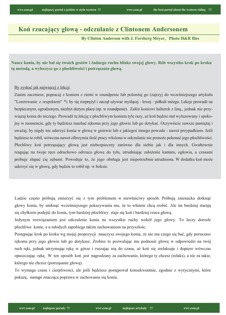 wwr.com.pl najlepszy portal o jeździe w stylu western !!! wwr.com.pl the best portal about the western riding !!! Koń rzucający głową - odczulanie z Clintonem Andersonem By Clinton Anderson with J. Forsberg Meyer, Photo H&R files Naucz konia, by nie bał się twoich gestów i żadnego ruchu blisko swojej głowy. Rób wszystko krok po kroku tą metodą, a wyleczysz go z płochliwości i potrząsania głową. By zyskać jak najwięcej z lekcji Zanim zaczniesz, popracuj z koniem z ziemi w roundpenie lub polonżuj go (zajrzyj do wcześniejszego artykułu "Lonżowanie z respektem" *) by się rozprężył i zaczął używać myślącej - lewej - półkuli mózgu. Lekcje prowadź na bezpiecznym, ogrodzonym, niezbyt dużym placu (np. w roundpenie). Załóż koniowi halterek z liną., jednak nie przywiązuj konia do niczego. Prowadź tę lekcję z płochliwym koniem tyle razy, aż koń będzie stał wyluzowany i spokojny w momencie, gdy ty będziesz machać rękoma przy jego głowie lub go dotykać. Oczywiście zawsze pamiętaj i uważaj, by nigdy nie uderzyć konia w głowę w gniewie lub z jakiegoś innego powodu - nawet przypadkiem. Jeśli będziesz to robił, wówczas nawet olbrzymia ilość pracy włożona w odczulanie nie pomoże pokonać jego płochliwości. Płochliwy koń potrząsający głową jest niebezpieczny zarówno dla siebie jak i dla innych. Gwałtownie reagując na twoje ręce odruchowo odrzuca głowę do tyłu, utrudniając założenie kantara, ogłowia, a czasami próbuje złapać cię zębami. Powoduje to, że jego obsługa jest niepotrzebnie utrudniona. W dodatku koń może uderzyć się w głowę, gdy będzie to robił np. w boksie. Ludzie często próbują zmierzyć się z tym problemem w niewłaściwy sposób. Próbują znienacka dotknąć głowy konia, by uniknąć wcześniejszego pokazywania mu, że to właśnie chcą zrobić. Ale im bardziej starają się chyłkiem podejść do konia, tym bardziej płochliwy staje się koń i bardziej rzuca głową. Jedynym rozwiązaniem jest odczulenie konia na wszystkie ruchy wokół jego głowy. To leczy dorosłe płochliwe konie, a u młodych zapobiega takim zachowaniom na przyszłośc. Postępując krok po kroku wg mojej propozycji nauczysz swojego konia, że nie ma czego się bać, gdy poruszasz rękoma przy jego głowie lub go dotykasz. Zrobisz to pozwalając mu podnosić głowę w odpowiedzi na twój ruch ręki, jednak utrzymując rękę w górze i ruszając nią do czasu, aż koń się zrelaksuje i dopiero wówczas opuszczając rękę. W ten sposób koń jest nagrodzany za zachowanie, którego ty chcesz (relaks), a nie za takie, którego nie chcesz (potrząsanie głową). To wymaga czasu i cierpliwości, ale jeśli będziesz postępował konsekwentnie, zgodnie z wytycznymi, które pokażę, nastąpi znacząca poprawa w zachowaniu się konia. 17 wwr.com.pl najlepsze porady !!! wwr.com.pl najlepsze artykuły !!! wwr.com.pl 1. Stojąc bokiem z przodu konia w bezpiecznej odległości, by nie mógł uderzyć cię głową lub kopytem, podnieś rękę i zaczynij robić ruch podobny do tego, którego użyłbyś, gdybyś chciał strzepnąć krople wody z dłoni na jego pysk. Rytmicznie, wielokrotnie, szybko uginaj i prostuj ramię, potrząsając dłonią (bądź ostrożny, by nie uderzyć konia). W odpowiedzi on unosi głowę i może nawet się trochę cofać. Nie próbuj go powstrzymać. Tylko strzepuj dłonią dalej, idąc za nim, jeśli trzeba. Pozostań spokojny i w rytmie, aż w końcu ... 2. ...koń się odpręży, opuści nieco głowę, a jego nogi się zatrzymają. Gdy pojawi się ta chwila relaksu (nawet malutka) przestań machać, a zamiast tego pogłaszcz go delikatnie i pochwal głosem. Powtarzaj całość kilka razy, następnie przejdź na drugą stronę konia i ponownie zacznij krok po kroku całą procedurę. 3. Teraz znów wróć na drugą stronę i "podnieś stawkę". Stojąc jak poprzednio w bezpiecznym miejscu "atakuj" otwartą dłonią w kierunku jego głowy, jak gdybyś chciał uderzyć go w oko. ( Uwaga: niezmiernie ważne jest, by konia w tym momencie nie uderzyć. Wzmocniłoby to tylko jego strach, a nie odczuliło na ruch. Należy upewnić się, że zachowana jest odległość dobre 20 cm od końca wyprostowanej ręki do jego oczu.) Tak jak poprzednio, wyciągaj rękę rytmicznie i spokojnie, idąc za koniem, jeżeli ten się porusza, do momentu gdy... 4. ... koń się zrelaksuje (nawet odrobinę). Wtedy pogłaszcz go uspokajająco nad okiem i powiedz mu, że jest wielki. Powtarzaj wszystko kilka razy, następnie przejdź na drugą stronę i zacznij całą procedurę od nowa. 5. Teraz stań bezpośrednio z przodu konia, ale wystarczająco daleko, by nie mógł cię uderzyć. Upuść linę na ziemię i zacznij unosić naprzemian ręce po bokach głowy konia. Unoś lewą rękę ... 6. ..a następnie prawą. Teraz może się zdarzyć, że twój koń stoi już spokojnie. Jeżeli tak, zatrzymaj się i pochwal go, a następnie spróbuj ruszać rękoma szybciej. Jeśli koń unosi głowę i/lub rusza się, nadal unoś naprzemian ręce, aż się uspokoi, a następnie znów przestań i pogłaszcz go. 7. Twój rezultat końcowy będzie taki, że koń nie tylko przestanie bać się twojej reki, ale wręcz będzie ją chetnie przyjmował. Clinton Anderson jest doświadczonym trenerem koni, prowadzi popularny program w RFD-TV pt. : "Downunder Horsemanship" w Stephenville, w Teksasie. Artykuł w oryginale ukazał się na www.equsearch.com wwr.com.pl najlepszy portal o jeździe w stylu western !!! Opr. TomCrow wwr.com.pl the best portal about the western riding !!!