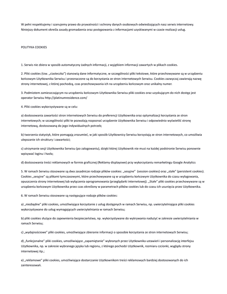 W pełni respektujemy i szanujemy prawo do prywatności i ochrony danych osobowych odwiedzających nasz serwis internetowy. Niniejszy dokument określa zasady gromadzenia oraz postępowania z informacjami uzyskiwanymi w czasie realizacji usług. POLITYKA COOKIES 1. Serwis nie zbiera w sposób automatyczny żadnych informacji, z wyjątkiem informacji zawartych w plikach cookies. 2. Pliki cookies (tzw. „ciasteczka”) stanowią dane informatyczne, w szczególności pliki tekstowe, które przechowywane są w urządzeniu końcowym Użytkownika Serwisu i przeznaczone są do korzystania ze stron internetowych Serwisu. Cookies zazwyczaj zawierają nazwę strony internetowej, z której pochodzą, czas przechowywania ich na urządzeniu końcowym oraz unikalny numer. 3. Podmiotem zamieszczającym na urządzeniu końcowym Użytkownika Serwisu pliki cookies oraz uzyskującym do nich dostęp jest operator Serwisu http://platinumresidence.com/ 4. Pliki cookies wykorzystywane są w celu: a) dostosowania zawartości stron internetowych Serwisu do preferencji Użytkownika oraz optymalizacji korzystania ze stron internetowych; w szczególności pliki te pozwalają rozpoznać urządzenie Użytkownika Serwisu i odpowiednio wyświetlić stronę internetową, dostosowaną do jego indywidualnych potrzeb; b) tworzenia statystyk, które pomagają zrozumieć, w jaki sposób Użytkownicy Serwisu korzystają ze stron internetowych, co umożliwia ulepszanie ich struktury i zawartości; c) utrzymanie sesji Użytkownika Serwisu (po zalogowaniu), dzięki której Użytkownik nie musi na każdej podstronie Serwisu ponownie wpisywać loginu i hasła; d) dostosowania treści reklamowych w formie graficznej (Reklamy displayowe) przy wykorzystaniu remarketingu Google Analytics 5. W ramach Serwisu stosowane są dwa zasadnicze rodzaje plików cookies: „sesyjne” (session cookies) oraz „stałe” (persistent cookies). Cookies „sesyjne” są plikami tymczasowymi, które przechowywane są w urządzeniu końcowym Użytkownika do czasu wylogowania, opuszczenia strony internetowej lub wyłączenia oprogramowania (przeglądarki internetowej). „Stałe” pliki cookies przechowywane są w urządzeniu końcowym Użytkownika przez czas określony w parametrach plików cookies lub do czasu ich usunięcia przez Użytkownika. 6. W ramach Serwisu stosowane są następujące rodzaje plików cookies: a) „niezbędne” pliki cookies, umożliwiające korzystanie z usług dostępnych w ramach Serwisu, np. uwierzytelniające pliki cookies wykorzystywane do usług wymagających uwierzytelniania w ramach Serwisu; b) pliki cookies służące do zapewnienia bezpieczeństwa, np. wykorzystywane do wykrywania nadużyć w zakresie uwierzytelniania w ramach Serwisu; c) „wydajnościowe” pliki cookies, umożliwiające zbieranie informacji o sposobie korzystania ze stron internetowych Serwisu; d) „funkcjonalne” pliki cookies, umożliwiające „zapamiętanie” wybranych przez Użytkownika ustawień i personalizację interfejsu Użytkownika, np. w zakresie wybranego języka lub regionu, z którego pochodzi Użytkownik, rozmiaru czcionki, wyglądu strony internetowej itp.; e) „reklamowe” pliki cookies, umożliwiające dostarczanie Użytkownikom treści reklamowych bardziej dostosowanych do ich zainteresowań. 7. W wielu przypadkach oprogramowanie służące do przeglądania stron internetowych (przeglądarka internetowa) domyślnie dopuszcza przechowywanie plików cookies w urządzeniu końcowym Użytkownika. Użytkownicy Serwisu mogą dokonać w każdym czasie zmiany ustawień dotyczących plików cookies. Ustawienia te mogą zostać zmienione w szczególności w taki sposób, aby blokować automatyczną obsługę plików cookies w ustawieniach przeglądarki internetowej bądź informować o ich każdorazowym zamieszczeniu w urządzeniu Użytkownika Serwisu. Szczegółowe informacje o możliwości i sposobach obsługi plików cookies dostępne są w ustawieniach oprogramowania (przeglądarki internetowej). Użytkownicy mogą zablokować usługę Analytics dla reklam displayowych oraz dostosowywać reklamy w sieci reklamowej Google w Menedżerze preferencji reklam. Można również pobrać program blokujący Google Analytics ze strony https://tools.google.com/dlpage/gaoptout/ 8. Operator Serwisu informuje, że ograniczenia stosowania plików cookies mogą wpłynąć na niektóre funkcjonalności dostępne na stronach internetowych Serwisu. 9. Pliki cookies zamieszczane w urządzeniu końcowym Użytkownika Serwisu i wykorzystywane mogą być również przez współpracujących z operatorem Serwisu reklamodawców oraz partnerów. 10. Więcej informacji na temat plików cookies dostępnych jest pod adresem http://wszystkoociasteczkach.pl lub w sekcji „Pomoc” w menu przeglądarki internetowej.