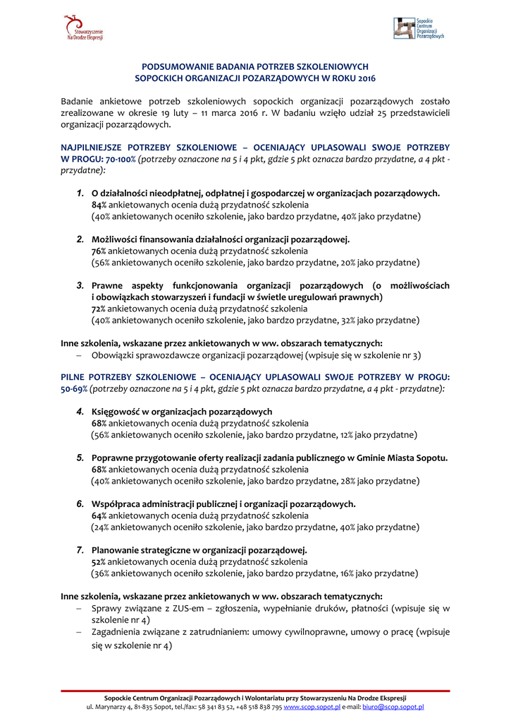 PODSUMOWANIE BADANIA POTRZEB SZKOLENIOWYCH SOPOCKICH ORGANIZACJI POZARZĄDOWYCH W ROKU 2016 Badanie ankietowe potrzeb szkoleniowych sopockich organizacji pozarządowych zostało zrealizowane w okresie 19 luty – 11 marca 2016 r. W badaniu wzięło udział 25 przedstawicieli organizacji pozarządowych. NAJPILNIEJSZE POTRZEBY SZKOLENIOWE – OCENIAJĄCY UPLASOWALI SWOJE POTRZEBY W PROGU: 70-100% (potrzeby oznaczone na 5 i 4 pkt, gdzie 5 pkt oznacza bardzo przydatne, a 4 pkt przydatne): 1. O działalności nieodpłatnej, odpłatnej i gospodarczej w organizacjach pozarządowych. 84% ankietowanych ocenia dużą przydatność szkolenia (40% ankietowanych oceniło szkolenie, jako bardzo przydatne, 40% jako przydatne) 2. Możliwości finansowania działalności organizacji pozarządowej. 76% ankietowanych ocenia dużą przydatność szkolenia (56% ankietowanych oceniło szkolenie, jako bardzo przydatne, 20% jako przydatne) 3. Prawne aspekty funkcjonowania organizacji pozarządowych (o możliwościach i obowiązkach stowarzyszeń i fundacji w świetle uregulowań prawnych) 72% ankietowanych ocenia dużą przydatność szkolenia (40% ankietowanych oceniło szkolenie, jako bardzo przydatne, 32% jako przydatne) Inne szkolenia, wskazane przez ankietowanych w ww. obszarach tematycznych: Obowiązki sprawozdawcze organizacji pozarządowej (wpisuje się w szkolenie nr 3) PILNE POTRZEBY SZKOLENIOWE – OCENIAJĄCY UPLASOWALI SWOJE POTRZEBY W PROGU: 50-69% (potrzeby oznaczone na 5 i 4 pkt, gdzie 5 pkt oznacza bardzo przydatne, a 4 pkt - przydatne): 4. Księgowość w organizacjach pozarządowych 68% ankietowanych ocenia dużą przydatność szkolenia (56% ankietowanych oceniło szkolenie, jako bardzo przydatne, 12% jako przydatne) 5. Poprawne przygotowanie oferty realizacji zadania publicznego w Gminie Miasta Sopotu. 68% ankietowanych ocenia dużą przydatność szkolenia (40% ankietowanych oceniło szkolenie, jako bardzo przydatne, 28% jako przydatne) 6. Współpraca administracji publicznej i organizacji pozarządowych. 64% ankietowanych ocenia dużą przydatność szkolenia (24% ankietowanych oceniło szkolenie, jako bardzo przydatne, 40% jako przydatne) 7. Planowanie strategiczne w organizacji pozarządowej. 52% ankietowanych ocenia dużą przydatność szkolenia (36% ankietowanych oceniło szkolenie, jako bardzo przydatne, 16% jako przydatne) Inne szkolenia, wskazane przez ankietowanych w ww. obszarach tematycznych: Sprawy związane z ZUS-em – zgłoszenia, wypełnianie druków, płatności (wpisuje się w szkolenie nr 4) Zagadnienia związane z zatrudnianiem: umowy cywilnoprawne, umowy o pracę (wpisuje się w szkolenie nr 4) Sopockie Centrum Organizacji Pozarządowych i Wolontariatu przy Stowarzyszeniu Na Drodze Ekspresji ul. Marynarzy 4, 81-835 Sopot, tel./fax: 58 341 83 52, +48 518 838 795 www.scop.sopot.pl e-mail: [email protected] Przygotowywanie projektów do innych publicznych grantodawców (pokrewne ze szkoleniem nr 5) Warsztaty pisania wniosków o dofinansowanie, nie tylko realizacji zadań publicznych (pokrewne ze szkoleniem nr 5) NAJMNIEJSZE ZAPOTRZEBOWANIE SZKOLENIOWE – OCENIAJĄCY UPLASOWALI SWOJE POTRZEBY W PROGU: 30-49% (potrzeby ocenione na skali na 5 i 4 pkt, gdzie 5 pkt oznacza bardzo przydatne, a 4 pkt - przydatne) 8. Realizacja zadania i poprawne rozliczanie dotacji na realizację zadania publicznego w Gminie Miasta Sopotu. 48% ankietowanych ocenia dużą przydatność szkolenia (32% ankietowanych oceniło szkolenie, jako bardzo przydatne, 16% jako przydatne) 9. Ochrona danych osobowych w organizacji pozarządowej. 48% ankietowanych ocenia dużą przydatność szkolenia (28% ankietowanych oceniło szkolenie, jako bardzo przydatne, 20% jako przydatne) 10. Monitoring i ewaluacja w działalności organizacji pozarządowych. 44% ankietowanych ocenia dużą przydatność szkolenia (28% ankietowanych oceniło szkolenie, jako bardzo przydatne, 16% jako przydatne) 11. Wolontariat w organizacji pozarządowej. 40% ankietowanych ocenia dużą przydatność szkolenia (20% ankietowanych oceniło szkolenie, jako bardzo przydatne, 20% jako przydatne) INNE SZKOLENIA WSKAZANE PRZEZ ANKIETOWANYCH: 1. Zarządzanie projektami (pokrewne ze szkoleniem nr 8; 2 odpowiedzi) 2. Autoprezentacja, wizerunek, promocja i PR w organizacjach pozarządowych, komunikacja/marketing/PR, nowe media społecznościowe, snapchat, twitter, instagram, pinterest (4 odpowiedzi) 3. Kładące nacisk na rozwijanie umiejętności miękkich (1 odpowiedź) Sopockie Centrum Organizacji Pozarządowych i Wolontariatu przy Stowarzyszeniu Na Drodze Ekspresji ul. Marynarzy 4, 81-835 Sopot, tel./fax: 58 341 83 52, +48 518 838 795 www.scop.sopot.pl e-mail: [email protected]