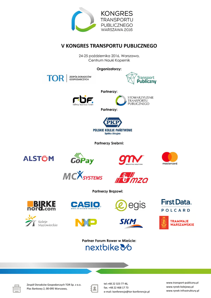 V KONGRES TRANSPORTU PUBLICZNEGO 24-25 października 2016, Warszawa, Centrum Nauki Kopernik Organizatorzy: Partnerzy: Partnerzy: Partnerzy Srebrni: Partnerzy Brązowi: Partner Forum Rower w Mieście: Zespół Doradców Gospodarczych TOR Sp. z o.o. Plac Bankowy 2, 00-095 Warszawa, tel.+48 22 323 77 46, fax. +48 22 468 17 73 e-mail: [email protected] www.transport-publiczny.pl www.rynek-kolejowy.pl www.rynek-infrastruktury.pl Partner Prawny: Partner oświetleniowy: Partner Merytoryczny: Partner Ubezpieczeniowy: Partner Płatności Mobilnej: Partner PR: Patronat Honorowy: Zespół Doradców Gospodarczych TOR Sp. z o.o. Plac Bankowy 2, 00-095 Warszawa, tel.+48 22 323 77 46, fax. +48 22 468 17 73 e-mail: [email protected] www.transport-publiczny.pl www.rynek-kolejowy.pl www.rynek-infrastruktury.pl Prezydent Miasta Żory Patronat Medialny: Zespół Doradców Gospodarczych TOR Sp. z o.o. Plac Bankowy 2, 00-095 Warszawa, tel.+48 22 323 77 46, fax. +48 22 468 17 73 e-mail: [email protected] www.transport-publiczny.pl www.rynek-kolejowy.pl www.rynek-infrastruktury.pl PROGRAM: DZIEŃ 1 9:00 REJESTRACJA UCZESTNIKÓW, PORANNA KAWA 10:00 ROZPOCZĘCIE KONGRESU CZĘŚĆ I: WIZJE PRZYSZŁOŚCI A DZISIEJSZE PROBLEMY 10:10 OTWARCIE: Renata Kaznowska, Wiceprezydent m.st. Warszawy 10:20 ROZDANIE NAGRÓD PORTALU TRANSPORT-PUBLICZNY.PL PANEL MIAST: Miasto wspólnoty interesów. Jakie miasta projektujemy na kolejne dekady XXI wieku i jak wspólnie z mieszkańcami dochodzić do obranych celów? czy transport ma znaczenie dla oceny jakości życia w polskich miastach? 10:30 UCZESTNICY: Mirosław Pawłowski, Prezes Zarządu, Polskie Koleje Państwowe Krystyna Danilecka-Wojewódzka, Wiceprezydent Słupska Tadeusz Ferenc, Prezydent Rzeszowa* Adrian Furgalski, Wiceprezes Zarządu, Zespół Doradców Gospodarczych TOR Piotr Grzymowicz, Prezydent Olsztyna Renata Kaznowska, Wiceprezydent, m.st. Warszawa Tomasz Nadolny, p.o. Dyrektora, Urząd Miejski w Gdańsku* Moderator: Łukasz Malinowski, Zespół Doradców Gospodarczych TOR DEBATA: Automatyzacja środków transportu publicznego UCZESTNICY: 11:20 Jerzy Lejk, Prezes Zarządu, Metro Warszawskie Sp. z o.o. Nicolas Halamek, Dyrektor Zarządzający, Alstom Polska Moderator: Witold Urbanowicz, Transport-Publiczny.pl Zespół Doradców Gospodarczych TOR Sp. z o.o. Plac Bankowy 2, 00-095 Warszawa, tel.+48 22 323 77 46, fax. +48 22 468 17 73 e-mail: [email protected] www.transport-publiczny.pl www.rynek-kolejowy.pl www.rynek-infrastruktury.pl PANEL REGIONÓW: Między miastem a regionem. Czy Polacy mieszkający poza metropoliami skorzystają na transformacji mobilności? Czy w przyszłości mamy liczyć bardziej na kolej, czy na car pooling? Czy znajdą się pieniądze na zakup taboru? 11:50 UCZESTNICY: Radosław Gawek, Członek Zarządu, Szybka Kolej Miejska Sp. z o.o. Olgierd Geblewicz, Marszałek Województwa Zachodniopomorskiego, Prezes Zarządu Związku Województw RP* Dariusz Grajda, Członek Zarządu, Dyrektor Handlowy, Koleje Mazowieckie Krzysztof Mamiński, Prezes Zarządu, Przewozy Regionalne Paweł Nakonieczny, Członek Zarządu Województwa Lubelskiego Joanna Scheuring-Wielgus, Posłanka na Sejm RP, Zastępca Przewodniczącego Komisji Samorządu Terytorialnego i Polityki Regionalnej* Grzegorz Woźniak, Poseł na Sejm RP, Zastępca Przewodniczącego Komisji Samorządu Terytorialnego i Polityki Regionalnej* Krzysztof Rudziński, Pełnomocnik Marszałka Województwa Pomorskiego ds. Integracji Transportu Szymon Ogłaza, Członek Zarządu Województwa Opolskiego Jan Roliński – adwokat, senior partner, kancelaria WKB Wierciński, Kwieciński, Baehr Moderator: Jakub Madrjas, Redaktor Prowadzący, Rynek-Kolejowy.pl 12:40 LOSOWANIE NAGRÓD UFUNDOWANYCH PRZEZ PARTNERÓW LOTERII 12:50 PRZERWA KAWOWA CZĘŚĆ II: JESZCZE LEPSZY TRANSPORT ZBIOROWY ŚCIEŻKI TEMATYCZNE: FORUM PASSENGER EXPERIENCE FORUM REWITALIZACJA I MOBILNOŚĆ FORUM ODPOWIEDZIALNEGO TRANSPORTU 13:20 Zespół Doradców Gospodarczych TOR Sp. z o.o. Plac Bankowy 2, 00-095 Warszawa, tel.+48 22 323 77 46, fax. +48 22 468 17 73 e-mail: [email protected] www.transport-publiczny.pl www.rynek-kolejowy.pl www.rynek-infrastruktury.pl FORUM PASSENGER EXPERIENCE WYSTĄPIENIE: Passenger experience* 13:20 Maciej Kornatowski, Business Development Manager, Mastercard WYSTĄPIENIE: Mobilna karta miejska 13:40 Robert Pietras, Prezes Zarządu GoPay 14:00 WYSTĄPIENIE: Inteligentne taryfy i płatności w transporcie publicznym – elastyczny system prosumencki dr inż. Grzegorz Wojtenko, Prezes Zarządu, MCX Systems Sp. z o.o. DEBATA: Prosument w transporcie – jak pasażerowie mogą uczestniczyć w kształtowaniu oferty transportowej? UCZESTNICY: 14:20 Krzysztof Całka, Dyrektor Handlowy, GoPay Marcin Głuszek, Dyrektor ds. Marketingu i Sprzedaży PKP SKM w Trójmieście sp. z o.o. Kamila Kaliszyk, Dyrektor ds. rozwoju rynku i akceptacji kart płatniczych, Mastercard Wiesław Witek, Dyrektor Zarządu Transportu Miejskiego w Warszawie dr inż. Grzegorz Wojtenko, Prezes Zarządu, MCX Systems Sp. z o.o. Moderator: Jędrzej Puzyński, Zespół Doradców Gospodarczych TOR WYSTĄPIENIE: 15:00 15:20 Grzegorz Madrjas, Kierownik Działu Strategii Rozwoju Systemu Tramwajowego, Tramwaje Warszawskie LUNCH WYSTĄPIENIE: Pasażer w mieście przyszłości* 16:00 Piotr Bochenek, Dyrektor ds. Sprzedaży i Marketingu, Członek Zarządu, Skycash Poland Zespół Doradców Gospodarczych TOR Sp. z o.o. Plac Bankowy 2, 00-095 Warszawa, tel.+48 22 323 77 46, fax. +48 22 468 17 73 e-mail: [email protected] www.transport-publiczny.pl www.rynek-kolejowy.pl www.rynek-infrastruktury.pl DEBATA: Internet rzeczy, technologie, rynek pracy. Długofalowy wpływ inteligentnego transportu na funkcjonowanie systemu transportu publicznego w Polsce. UCZESTNICY: 16:20 Tadeusz Bartosiński, Zastępca Dyrektora, Urząd m. st. Warszawy, Biuro Drogownictwa i Komunikacji Piotr Bochenek, Dyrektor ds. Sprzedaży i Marketingu, Członek Zarządu, Skycash Poland Łukasz Fran