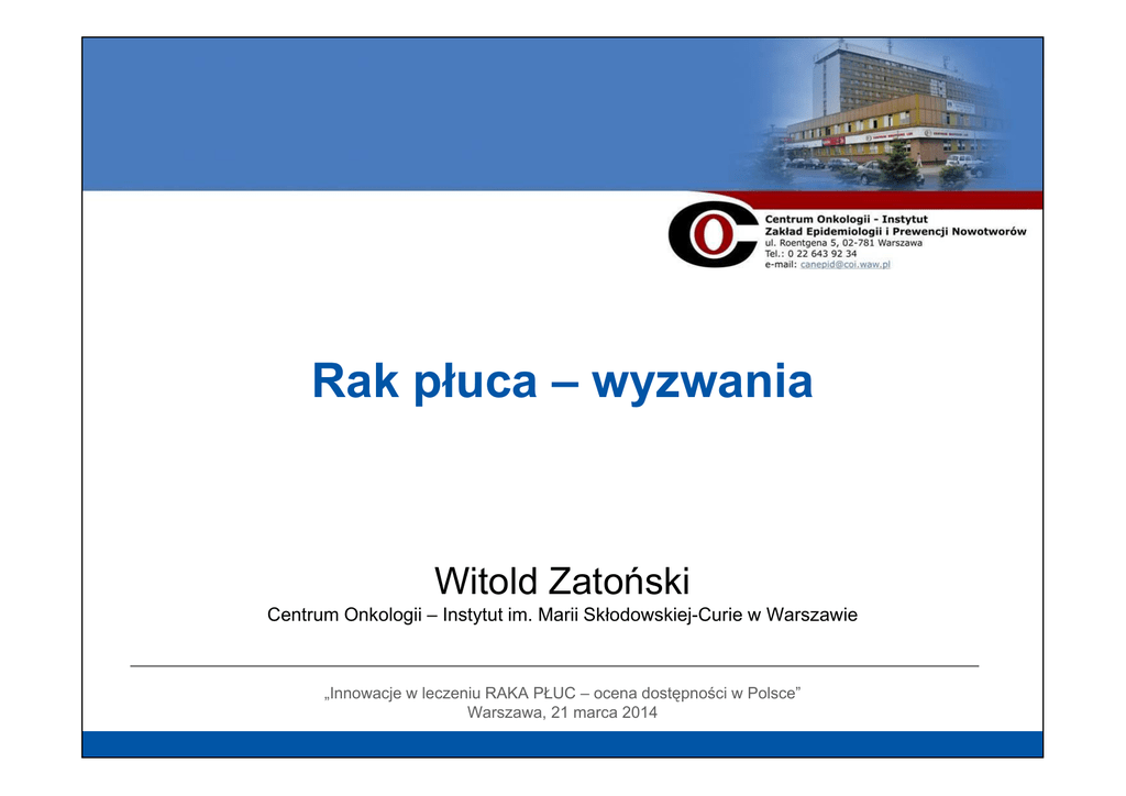 Rak płuca – wyzwania Witold Zatoński Centrum Onkologii – Instytut im. Marii Skłodowskiej-Curie w Warszawie „Innowacje w leczeniu RAKA PŁUC – ocena dostępności w Polsce” Warszawa, 21 marca 2014 Nowotwory – główna przyczyna przedwczesnej umieralności 400 Mężczyźni 400 350 Wsp. std. na 100,000 pop. Wsp. std. na 100,000 pop. 350 Kobiety 300 250 200 150 300 250 200 150 100 100 50 50 0 1958 1968 1978 1988 1998 2008 Nowotwory Choroby ukł. krążenia 0 1958 1968 1978 1988 1998 2008 Nowotwory Choroby ukł. krążenia Umieralność z powodu nowotworów i chorób ukł. krążenia*, UE15, 0+ * Standaryzowane (na populację świata) współczynniki umieralności na 100,000 pop. W. Zatoński, Centrum Onkologii Instytut – Publikowanie wyłącznie po powołaniu się na źródło! 1 Umieralność na nowotwory złośliwe w USA, 1930-2009 Kobiety 100 45 90 40 80 35 70 60 Żołądek Jelito grube 50 Trzustka Wątroba Prostata 40 Białaczka Płuco 30 20 30 Żoładek 25 Jelito grube Macica Pierś 20 Trzustka Jajnik 15 Płuco 10 5 10 0 0 1930 Współczynniki std. na 100,000 pop. Współczynniki std. na 100,000 pop. Mężczyźni 1950 1970 1990 2010 1930 1950 1970 W. Zatoński, Centrum Onkologii Instytut – Publikowanie wyłącznie po powołaniu się na źródło! 1990 2010 2 Umieralność na nowotwory złośliwe w USA, 1930-2009 Kobiety 100 100 90 90 80 80 70 60 Żołądek Jelito grube 50 Trzustka Wątroba Prostata 40 Białaczka Płuco 30 20 Współczynniki std. na 100,000 pop. Współczynniki std. na 100,000 pop. Mężczyźni 70 60 Jelito grube 50 Jajnik 20 0 1990 2010 Płuco 30 0 1970 Trzustka 40 10 1950 Macica Pierś 10 1930 Żoładek 1930 1950 W. Zatoński, Centrum Onkologii Instytut – Publikowanie wyłącznie po powołaniu się na źródło! 1970 1990 2010 3 Sir Richard Doll – rak płuca wyzwaniem XX i XXI wieku Pod koniec lat 40. w Wlk. Brytanii rak płuc stał się jednym z głównych zabójców Brytyjczyków. W niektórych kohortach urodzeniowych stanowił 20% wszystkich zgonów. W. Zatoński, Centrum Onkologii Instytut – Publikowanie wyłącznie po powołaniu się na źródło! 4 Model palenia a skumulowane ryzyko zgonu z powodu raka płuca przed ukończeniem 75. roku życia, na podstawie badań z lat 1950 i 1990 Mężczyźni Kobiety Skumulowane ryzyko (%) Model palenia 1950 1990 1950 1990 Nigdy nie palący ~0.4 ~0.4 ~0.4 ~0.4 Byli palacze 2.9 5.5 0.9 2.6 Obecni palacze wyłącznie fajki i cygar 2.8 8.1 - - Obecni palacze papierosów 5.9 15.9 1.0 9.5 < 5 / day 2.8 10.4 0.6 3.4 5 – 14 / day 4.4 12.8 1.0 7.7 15 – 24 / day 5.7 16.7 >= 25 / day 9.8 24.4 Konsumpcja tytoniu (% palaczy) 2.0 10.4 18.5 Source: Peto R. et al. Smoking, smoking cessation, and lung cancer in the UK since 1950: combination of national statistics with two case-control studies. BMJ 2000;321:323-329 W. Zatoński, Centrum Onkologii Instytut – Publikowanie wyłącznie po powołaniu się na źródło! 5 Palenie i umieralność z powodu nowotworów płuca w Wielkiej Brytanii Częstość palenia w grupie wieku 60+, 1950-1998 90% Umieralność na nowotwory płuca w grupie wieku 55-74 lat, 1959-2010 450 399 80% 70% 400 66% 350 Zgony / 100,000 60% 50% 40% 30% 20% 21% 300 250 200 150 150 116 103 100 25% 16% 10% 50 0 0% 1950 1960 1970 1980 1990 1998 Mężczyźni Kobiety Źródło: Br Med. J, 200; 321-323-9 1950 1960 1970 1980 1990 2000 2010 Mężczyźni Kobiety Źródło: Opracowanie własne, std. na pop. świata W. Zatoński, Centrum Onkologii Instytut – Publikowanie wyłącznie po powołaniu się na źródło! 6 Umieralność na nowotwory złośliwe płuca w Polsce, 1963-2010 kobiety, 0+ 18 70 16 60 50 40 30 20 Wsp. std. na 100,000 pop. Wsp. std. na 100,000 pop. mężczyźni, 0+ 80 14 12 10 8 6 4 10 2 0 0 1960 1970 1980 1990 2000 2010 1960 1970 1980 1990 2000 2010 Żródło: W. Zatoński, COI; Statystyka WHO, standaryzacja w oparciu o standardową pop. świata W. Zatoński, Centrum Onkologii Instytut – Publikowanie wyłącznie po powołaniu się na źródło! 7 Trendy umieralności na nowotwory złośliwe płuca w Polsce, mężczyźni, 1963-2010 20-44 65+ 45-64 8 250 600 5 4 3 500 200 150 100 Wsp. std. na 100,000 pop. 6 Wsp. std. na 100,000 pop. Wsp. std. na 100,000 pop. 7 400 300 200 2 50 1 0 1960 1970 1980 1990 2000 2010 100 0 0 1960 1970 1980 1990 2000 2010 1960 1970 1980 1990 2000 2010 Żródło: W. Zatoński, COI; Statystyka WHO, standaryzacja w oparciu o standardową pop. świata W. Zatoński, Centrum Onkologii Instytut – Publikowanie wyłącznie po powołaniu się na źródło! 8 Częstość palenia vs rak płuca, Polska, mężczyźni Odsetek codziennie palących 20-44 45-64 80 80 80 70 70 70 60 60 60 50 50 50 40 40 40 30 30 30 20 20 20 10 10 10 Zachorowalność na raka płuca / 100,000 0 1973 1983 1993 2003 2013 9 8 7 6 5 4 3 2 0 1973 1983 1993 2003 2013 250 7,7 500 200 6,2 138,5 2,9 1 0 8 7 6 5 131,9 2 1 0 1960 1970 1980 1990 2000 2010 300 100 0 0 1960 1970 1980 1990 2000 2010 291.7 1960 1970 1980 1990 2000 2010 250 600 200 500 150 386.3 200 50 400 300 4 3 512.2 400 150 100 0 1973 1983 1993 2003 2013 600 207,5 1960 1970 1980 1990 2000 2010 Umieralność na raka płuca / 100,000 65+ 100 200 50 100 0 0 1960 1970 1980 1990 2000 2010 1960 1970 1980 1990 2000 2010 W. Zatoński, Centrum Onkologii Instytut – Publikowanie wyłącznie po powołaniu się na źródło! 9 Umieralność na nowotwory złośliwe w Polsce, kobiety przed 65 r. ż., 1963-2010 12 Współczynniki std. na 100,000 pop. 10 płuco 8 pierś jelito grube 6 jajnik 4 szyjka macicy trzustka 2 żołądek 0 1960 1970 1980 1990 2000 2010 Współczynniki standaryzowane zostały obliczone w oparciu o standardową populację świata W. Zatoński, Centrum Onkologii Instytut – Publikowanie wyłącznie po powołaniu się na źródło! 10 Trendy umieralności na nowotwory złośliwe płuca w Polsce, kobiety, 1963-2010 20-44 65+ 45-64 2,5 50 120 45 1 0,5 40 35 30 25 20 15 100 Wsp. std. na 100,000 pop. 1,5 Wsp. std. na 100,000 pop. Wsp. std. n