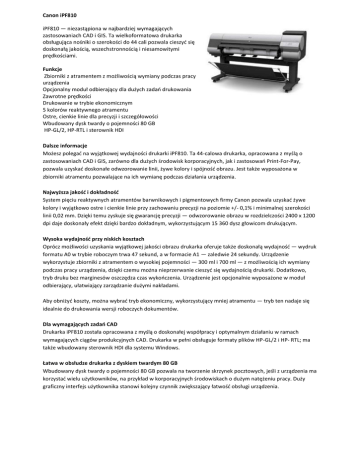 Canon iPF810 iPF810 — niezastąpiona w najbardziej wymagających zastosowaniach CAD i GIS. Ta wielkoformatowa drukarka obsługująca nośniki o szerokości do 44 cali pozwala cieszyd się doskonałą jakością, wszechstronnością i niesamowitymi prędkościami. Funkcje Zbiorniki z atramentem z możliwością wymiany podczas pracy urządzenia Opcjonalny moduł odbierający dla dużych zadao drukowania Zawrotne prędkości Drukowanie w trybie ekonomicznym 5 kolorów reaktywnego atramentu Ostre, cienkie linie dla precyzji i szczegółowości Wbudowany dysk twardy o pojemności 80 GB HP-GL/2, HP-RTL i sterownik HDI Dalsze informacje Możesz polegad na wyjątkowej wydajności drukarki iPF810. Ta 44-calowa drukarka, opracowana z myślą o zastosowaniach CAD i GIS, zarówno dla dużych środowisk korporacyjnych, jak i zastosowao Print-For-Pay, pozwala uzyskad doskonałe odwzorowanie linii, żywe kolory i spójnośd obrazu. Jest także wyposażona w zbiorniki atramentu pozwalające na ich wymianę podczas działania urządzenia. Najwyższa jakośd i dokładnośd System pięciu reaktywnych atramentów barwnikowych i pigmentowych firmy Canon pozwala uzyskad żywe kolory i wyjątkowo ostre i cienkie linie przy zachowaniu precyzji na poziomie +/- 0,1% i minimalnej szerokości linii 0,02 mm. Dzięki temu zyskuje się gwarancję precyzji — odwzorowanie obrazu w rozdzielczości 2400 x 1200 dpi daje doskonały efekt dzięki bardzo dokładnym, wykorzystującym 15 360 dysz głowicom drukującym. Wysoka wydajnośd przy niskich kosztach Oprócz możliwości uzyskania wyjątkowej jakości obrazu drukarka oferuje także doskonałą wydajnośd — wydruk formatu A0 w trybie roboczym trwa 47 sekund, a w formacie A1 — zaledwie 24 sekundy. Urządzenie wykorzystuje zbiorniki z atramentem o wysokiej pojemności — 300 ml i 700 ml — z możliwością ich wymiany podczas pracy urządzenia, dzięki czemu można nieprzerwanie cieszyd się wydajnością drukarki. Dodatkowo, tryb druku bez marginesów oszczędza czas wykooczenia. Urządzenie jest opcjonalnie wyposażone w moduł odbierający, ułatwiający zarządzanie dużymi nakładami. Aby obniżyd koszty, można wybrad tryb ekonomiczny, wykorzystujący mniej atramentu — tryb ten nadaje się idealnie do drukowania wersji roboczych dokumentów. Dla wymagających zadao CAD Drukarka iPF810 została opracowana z myślą o doskonałej współpracy i optymalnym działaniu w ramach wymagających ciągów produkcyjnych CAD. Drukarka w pełni obsługuje formaty plików HP-GL/2 i HP- RTL; ma także wbudowany sterownik HDI dla systemu Windows. Łatwa w obsłudze drukarka z dyskiem twardym 80 GB Wbudowany dysk twardy o pojemności 80 GB pozwala na tworzenie skrzynek pocztowych, jeśli z urządzenia ma korzystad wielu użytkowników, na przykład w korporacyjnych środowiskach o dużym natężeniu pracy. Duży graficzny interfejs użytkownika stanowi kolejny czynnik zwiększający łatwośd obsługi urządzenia.