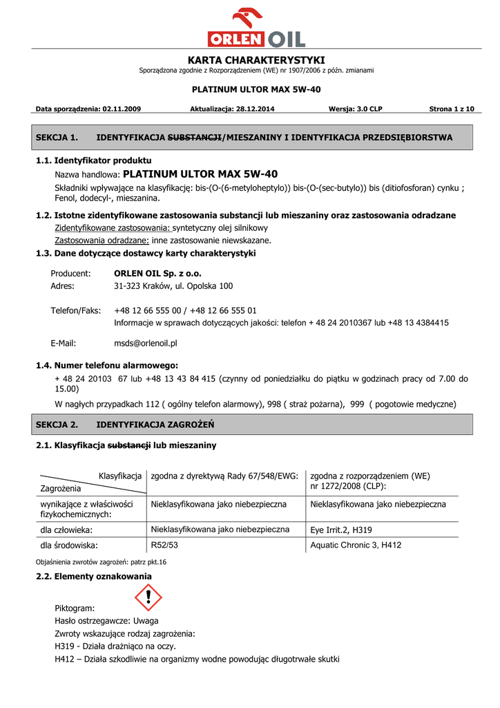KARTA CHARAKTERYSTYKI Sporządzona zgodnie z Rozporządzeniem (WE) nr 1907/2006 z późn. zmianami PLATINUM ULTOR MAX 5W-40 Data sporządzenia: 02.11.2009 SEKCJA 1. Aktualizacja: 28.12.2014 Wersja: 3.0 CLP Strona 1 z 10 IDENTYFIKACJA SUBSTANCJI/MIESZANINY I IDENTYFIKACJA PRZEDSIĘBIORSTWA 1.1. Identyfikator produktu Nazwa handlowa: PLATINUM ULTOR MAX 5W-40 Składniki wpływające na klasyfikację: bis-(O-(6-metyloheptylo)) bis-(O-(sec-butylo)) bis (ditiofosforan) cynku ; Fenol, dodecyl-, mieszanina. 1.2. Istotne zidentyfikowane zastosowania substancji lub mieszaniny oraz zastosowania odradzane Zidentyfikowane zastosowania: syntetyczny olej silnikowy Zastosowania odradzane: inne zastosowanie niewskazane. 1.3. Dane dotyczące dostawcy karty charakterystyki Producent: ORLEN OIL Sp. z o.o. Adres: 31-323 Kraków, ul. Opolska 100 Telefon/Faks: +48 12 66 555 00 / +48 12 66 555 01 Informacje w sprawach dotyczących jakości: telefon + 48 24 2010367 lub +48 13 4384415 E-Mail: [email protected] 1.4. Numer telefonu alarmowego: + 48 24 20103 67 lub +48 13 43 84 415 (czynny od poniedziałku do piątku w godzinach pracy od 7.00 do 15.00) W nagłych przypadkach 112 ( ogólny telefon alarmowy), 998 ( straż pożarna), 999 ( pogotowie medyczne) SEKCJA 2. IDENTYFIKACJA ZAGROŻEŃ 2.1. Klasyfikacja substancji lub mieszaniny Klasyfikacja zgodna z dyrektywą Rady 67/548/EWG: zgodna z rozporządzeniem (WE) nr 1272/2008 (CLP): wynikające z właściwości fizykochemicznych: Nieklasyfikowana jako niebezpieczna Nieklasyfikowana jako niebezpieczna dla człowieka: Nieklasyfikowana jako niebezpieczna Eye Irrit.2, H319 dla środowiska: R52/53 Aquatic Chronic 3, H412 Zagrożenia Objaśnienia zwrotów zagrożeń: patrz pkt.16 2.2. Elementy oznakowania Piktogram: Hasło ostrzegawcze: Uwaga Zwroty wskazujące rodzaj zagrożenia: H319 - Działa drażniąco na oczy. H412 – Działa szkodliwie na organizmy wodne powodując długotrwałe skutki KARTA CHARAKTERYSTYKI Sporządzona zgodnie z Rozporządzeniem (WE) nr 1907/2006 z późn. zmianami PLATINUM ULTOR MAX 5W-40 Data sporządzenia: 02.11.2009 Aktualizacja: 28.12.2014 Wersja: 3.0 CLP Strona 2 z 10 Zwroty wskazujące środki ostrożności: P280 - Stosować rękawice ochronne/ochronę oczu. P305+P351+P338 - W PRZYPADKU DOSTANIA SIĘ DO OCZU: Ostrożnie płukać wodą przez kilka minut. Wyjąć soczewki kontaktowe, jeżeli są i można je łatwo usunąć. P337+P313 W przypadku utrzymywania się działania drażniącego na oczy zasięgnąć porady lekarza. P273 – Unikać uwolnienia do środowiska P501 - Zawartość/pojemnik usuwać do upoważnionego odbiorcy odpadów. Dodatkowe informacje na etykiecie: brak 2.3. Inne zagrożenia Produkt nie spełnia kryteriów PBT lub vPvB zgodnie z załącznikiem XIII Rozporządzenia REACH. Produkt palny o wysokiej temperaturze zapłonu. SEKCJA 3. KŁAD/INFORMACJA O SKŁADNIKACH 3.1. Substancje – nie dotyczy 3.2. Mieszaniny: mieszanina syntetycznych olejów bazowych i dodatków uszlachetniających Niebezpieczne składniki, zakresy ich stężeń w mieszaninie: Nazwa substancji/ Nr rejestracji REACH *Oleje mineralne bis-(O-(6-metyloheptylo)) bis-(O-(sec-butylo)) bis (ditiofosforan) cynku 01-2119543726-33 Fenol, dodecyl- , mieszanina Nr indeksowy Klasyfikacja wg 67/548/EWG Klasyfikacja wg 1272/2008 (CLP) 55<c<57 * Nieklasyfikowana jako niebezpieczna Asp.Tox.1. H304 298-577-9 0,95<c<1,9 -- Xi;R41, R38 N;R51/53 Skin Irrit.2;H315 Eye Dam.1; H318 Aquatic Chronic 2;H411 310-154-3 0,057<c<0,19 -- Repr.Cat.3; R62 Xi; R36/38 N; R50-R53 Repr. 2; H361f Skin Irrit. 2; H315 Eye Irrit. 2; H319 Aquatic Acute 1;H400 Aquatic Chronic 1; H410 (M=10) Nr CAS / Nr WE * % wag 01-2119513207-49 Opis zwrotów R,H oraz pełne brzmienie klasyfikacji podano w Sekcji 16. *Oleje mineralne zawarte w materiale mogą być opisane za pomocą jednego lub kilku z poniższych oznaczeń: Nr WE 265-157-1, Nr rejestracyjny 01-2119484627-25,Destylaty ciężkie parafinowe, obrabiane wodorem (ropa naftowa); Nr WE 265-169-7, Nr rejestracyjny 01-2119471299-27, Destylaty ciężkie parafinowe z odparafinowania rozpuszczalnikowego (ropa naftowa); Stosowane oleje bazowe nie są klasyfikowane jako rakotwórcze. Zawartość ekstraktu DMSO (wg IP 346) < 3%. Na podstawie lepkości produkt nie stwarza zagrożenia spowodowanego aspiracją. SEKCJA 4. ŚRODKI PIERWSZEJ POMOCY 4.1. Opis środków pierwszej pomocy Wdychanie: Poszkodowanego usunąć (wyprowadzić/wynieść) z miejsca narażenia na świeże powietrze; zapewnić spokój i KARTA CHARAKTERYSTYKI Sporządzona zgodnie z Rozporządzeniem (WE) nr 1907/2006 z późn. zmianami PLATINUM ULTOR MAX 5W-40 Data sporządzenia: 02.11.2009 Aktualizacja: 28.12.2014 Wersja: 3.0 CLP Strona 3 z 10 ciepło. Nieprzytomnego ułożyć w pozycji bocznej ustalonej, rozluźnić uciskające części ubrania; kontrolować i utrzymywać drożność dróg oddechowych. W przypadku zaburzeń w oddychaniu podawać tlen, w przypadku braku oddechu stosować sztuczne oddychanie. W przypadku utraty przytomności, zaburzeń oddychania lub utrzymującego się złego samopoczucia natychmiast zapewnić pomoc lekarską. Kontakt ze skórą: Natychmiast zdjąć zanieczyszczoną/nasiąkniętą odzież i buty. Zanieczyszczoną skórę umyć dokładnie wodą z mydłem lub łagodnym detergentem, a następnie spłukać wodą. W przypadku wystąpienia i utrzymywania się objawów podrażnienia skonsultować się z lekarzem. UWAGA: Zanieczyszczoną/nasiąkniętą odzież usunąć w bezpieczne miejsce z dala od źródeł ciepła i źródeł zapłonu. Kontakt z oczami: Zanieczyszczone oczy natychmiast płukać ciągłym strumieniem wody, usunąć szkła kontaktowe (jeśli są) i kontynuować płukanie przez ok. 15 minut. Podczas płukania trzymać powieki szeroko rozwarte i poruszać gałką oczną. W przypadku wystąpienia i utrzymywania się dolegliwości skonsultować się z lekarzem. UWAGA: Nie stosować zbyt silnego strumienia wody, aby nie uszkodzić rogówki. Połknięcie: Nie p