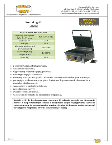 Eurogast Polska Sp. z o.o. ul. 3-go Maja 8, 05-080 Izabelin (Mościska) tel.: 0-22 752 25 18, 19, 23, fax: 0-22 752 25 24 e-mail: [email protected], www.eurogast.pl Profesjonalne Urządzenia Gastronomiczne Kontakt grill PANINI PARAMETRY TECHNICZNE Wymiary zewnętrzne (W x D x H) [mm] Zasilanie [V] Moc [W] Wymiary powierzchni grzewczej [mm] • • • • • • • • • • 430 x 385 x 220 230 3000 360 x 240 Zakres regulacji temperatury do 300°C Masa [kg] 22,5 poszerzony, jedna strefa grzewcza, opiekanie obustronne, wyposażony w żeliwne płyty grzewcze, dolna i górna płyta ryflowana, elementy elektryczne i grzałki całkowicie zabudowane i niedostępne z zewnątrz, górna płyta zbalansowana, sprężyna dociskowa dopasowana tak, aby umożliwić dokładną obróbkę porcji, wyposażony w rynienkę ociekową, żaroodporne uchwyty, zwarta i solidna obudowa, w zestawie skrobaczka do czyszczenia urządzenia, Kontakt grill do beztłuszczowego smażenia. Urządzenie pozwala na otrzymanie potraw o niepowtarzalnym smaku i soczystości dzięki występowaniu zjawiska zasklepiania porów na powierzchni smażonych mięs. Grillowanie można rozpocząć po wstępnym rozgrzaniu płyty do temperatury roboczej. 12.10