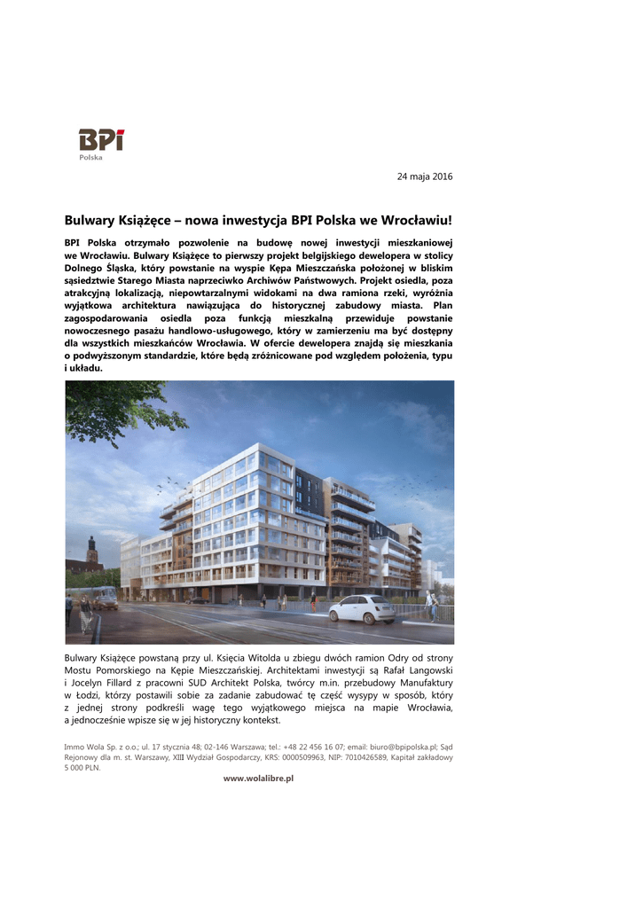 24 maja 2016 Bulwary Książęce – nowa inwestycja BPI Polska we Wrocławiu! BPI Polska otrzymało pozwolenie na budowę nowej inwestycji mieszkaniowej we Wrocławiu. Bulwary Książęce to pierwszy projekt belgijskiego dewelopera w stolicy Dolnego Śląska, który powstanie na wyspie Kępa Mieszczańska położonej w bliskim sąsiedztwie Starego Miasta naprzeciwko Archiwów Państwowych. Projekt osiedla, poza atrakcyjną lokalizacją, niepowtarzalnymi widokami na dwa ramiona rzeki, wyróżnia wyjątkowa architektura nawiązująca do historycznej zabudowy miasta. Plan zagospodarowania osiedla poza funkcją mieszkalną przewiduje powstanie nowoczesnego pasażu handlowo-usługowego, który w zamierzeniu ma być dostępny dla wszystkich mieszkańców Wrocławia. W ofercie dewelopera znajdą się mieszkania o podwyższonym standardzie, które będą zróżnicowane pod względem położenia, typu i układu. Rafał Bulwary Książęce powstaną przy ul. Księcia Witolda u zbiegu dwóch ramion Odry od strony Mostu Pomorskiego na Kępie Mieszczańskiej. Architektami inwestycji są Rafał Langowski i Jocelyn Fillard z pracowni SUD Architekt Polska, twórcy m.in. przebudowy Manufaktury w Łodzi, którzy postawili sobie za zadanie zabudować tę część wysypy w sposób, który z jednej strony podkreśli wagę tego wyjątkowego miejsca na mapie Wrocławia, a jednocześnie wpisze się w jej historyczny kontekst. Immo Wola Sp. z o.o.; ul. 17 stycznia 48; 02-146 Warszawa; tel.: +48 22 456 16 07; email: [email protected]; Sąd Rejonowy dla m. st. Warszawy, XIII Wydział Gospodarczy, KRS: 0000509963, NIP: 7010426589, Kapitał zakładowy 5 000 PLN. www.wolalibre.pl Ze względu na swoją śródmiejską lokalizację projekt był konsultowany i szczegółowo uzgadniany z wieloma instytucjami miejskimi, w tym z przedstawicielami Władz Miasta Wrocławia, Biurem Miejskiego Konserwatora Zabytków, Wydziałem Środowiska i Rolnictwa Powiatowego Wrocławskiego Wydziału Ochrony Środowiska oraz Biurem Rozwoju Wrocławia. W efekcie czego powstała spójna wizja nowoczesnego kompleksu mieszkaniowego z towarzyszącą funkcją usługową, zaprojektowaną na parterze budynków, który stanie się urbanistycznym i architektonicznym łącznikiem pomiędzy Starym Miastem a Przedmieściem Odrzańskim. Mocnym akcentem architektonicznym będzie fasada wykonana z włoskich paneli ceramicznych zmieniającymi swój wygląd w zależności od światła, koloru nieba i ruchu przepływającej obok Odry. W ofercie BPI Polska znajdą się wysokiej klasy mieszkania typu Comfort o wysokości 2,68m oraz apartamenty Prestige o wysokości 2,82m. Wszystkie lokale zostały zaprojektowane tak, aby maksymalnie wykorzystać walory widokowe wynikające ze znakomitej lokalizacji projektu. Zadecydują o tym duże drewniane okna zapewniające swobodne przenikanie naturalnego światła do wnętrz budynku. Niemal każdy lokal będzie posiadał wygodny duży taras, balkon lub w przypadku niektórych mieszkań położonych na I piętrze – ogród. Do wyłącznej dyspozycji mieszkańców będą również starannie zaprojektowane tereny zielone zlokalizowane na wewnętrznym patio. – Bulwary Książęce to inwestycja, która w zamierzeniu przyczyni się do rewitalizacji tej zapomnianej przez lata wyspy. Kompleks składał się będzie z kilku reprezentacyjnych budynków wielorodzinnych otoczonych pasażem od północnego ramienia Odry oraz promenadą zaprojektowana w pasie obecnej ulicy Księcia Witolda. Dostępna wyłącznie dla pieszych ulica handlowa wzbogaci ofertę kulturalno-usługową wyspy, podkreślając jej śródmiejski charakter. Projekt komercyjny lokali znajdujących się na ulicy handlowej przewiduje liczne restauracje, kawiarnie oraz sklepy, co wykreuje znakomite, pełne atrakcji miejsce, idealne dla spotkań towarzyskich – mówi Maciej Golis, Dyrektor Projektu w BPI Polska odpowiedzialny za realizację inwestycji we Wrocławiu. Starannie przemyślana koncepcja całego kompleksu umożliwi synergię wszystkich zaprojektowanych funkcji przy jednoczesnym zachowaniu prywatności i bezpieczeństwa mieszkańców. Hole wejściowe do budynków mieszkalnych zostaną usytuowane z dala od ulicy handlowej. W podziemnych kondygnacjach znajdą się oddzielone od siebie parkingi zarówno dla mieszkańców części mieszkaniowej kompleksu , jak i osób odwiedzających lokale ulicy handlowej. Całość inwestycji zostanie zrealizowana w dwóch etapach. W pierwszym etapie powstanie 175 mieszkań i apartamentów, drugi etap to kolejnych 177 lokali mieszkalnych. Rozpoczęcie pierwszych prac przygotowawczych rozpocznie się latem br. Już teraz można odwiedzić biuro sprzedaży inwestycji przy ul. Garbary 2 we Wrocławiu. Pytania dot. oferty można zadawać również przez stronę http://www.bulwaryksiazece.pl/. Immo Wola Sp. z o.o.; ul. 17 stycznia 48; 02-146 Warszawa; tel.: +48 22 456 16 07; email: [email protected]; Sąd Rejonowy dla m. st. Warszawy, XIII Wydział Gospodarczy, KRS: 0000509963, NIP: 7010426589, Kapitał zakładowy 5 000 PLN. www.wolalibre.pl *** BPI S.A. – Odział w Polsce BPI S.A. należy do międzynarodowej grupy CFE z siedzibą w Belgii, specjalizując się w realizacji innowacyjnych projektów deweloperskich wysokiej jakości. Działalność spółki, której podstawą jest wiedza i doświadczenie, ukierunkowana jest na spełnianie konkretnych oczekiwań zarówno klientów indywidualnych, jak i biznesowych. Oferta BPI obejmuje kompleksową realizację inwestycji od poszukiwania odpowiednich terenów i przygotowania koncepcji zagospodarowania przestrzennego, przez zarządzanie budową i całościowe wykończenie projektu. Spółka świadczy również usługi z zakresu doradztwa prawnego i komercjalizacji inwestycji. Jednocześnie BPI, jako firma która hołduje zasadom zrównoważonego rozwoju, realizuje projekty, które powstają w poszanowaniu lokalnej architektury i środowiska. Działalność BPI w Polsce Pierwsza inwest