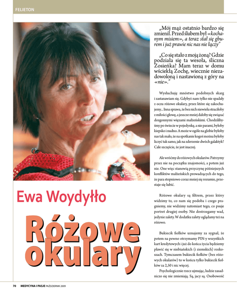 FELIETON „Mój mąż ostatnio bardzo się zmienił. Przed ślubem był «kochanym misiem», a teraz stał się gburem i już prawie nic nas nie łączy” „Co się stało z moją żoną? Gdzie podziała się ta wesoła, śliczna Zosieńka? Mam teraz w domu wściekłą Zochę, wiecznie nieza‑ dowoloną i nastawioną z góry na «nie».” Wysłuchuję mnóstwo podobnych skarg i zastanawiam się. Gdybyż nam tylko nie spadały z oczu różowe okulary, przez które się zakochu‑ jemy... Inna sprawa, że bez nich niewielu straciłoby z miłości głowę, a jeszcze mniej dałoby się związać dozgonnymi więzami małżeńskimi. Chodziliby‑ śmy po świecie w pojedynkę, a nie parami, byłoby kiepsko i nudno. A może w ogóle na globie byłoby nas tak mało, że na spotkanie kogoś można byłoby liczyć tak samo, jak na zderzenie dwóch galaktyk? Całe szczęście, że jest inaczej. Ewa Woydyłło Różowe okulary 70 MEDYCYNA I PASJE PAŹDZIERNIK 2009 Ale wróćmy do różowych okularów. Patrzymy przez nie na początku znajomości, a potem już nie. One więc stanowią przyczynę późniejszych konfliktów małżeńskich prowadzących do tego, że para stopniowo coraz mniej się rozumie, prze‑ staje się lubić. Różowe okulary są filtrem, przez który widzimy to, co nam się podoba i czego pra‑ gniemy, nie widzimy natomiast tego, co psuje portret drugiej osoby. Nie dostrzegamy wad, jedynie zalety. W dodatku zalety oglądamy też na różowo. Bukiecik fiołków uznajemy za sygnał, że potem na pewno otrzymamy PIN‑y wszystkich kart kredytowych i już do końca życia będziemy pławić się w niebiańskich (i ziemskich) rozko‑ szach. Tymczasem bukiecik fiołków (bez różo‑ wych okularów) to w końcu tylko bukiecik fioł‑ ków za 2,50 i nic więcej. Psychologicznie rzecz ujmując, ludzie zasad‑ niczo się nie zmieniają. Są, jacy są. Osobowość okulary to pewien trick, polegający na tym, aby postarać się zobaczyć na nowo to, co nas do tej osoby w ogóle przyciągnęło. Amerykanie nazywają to grati- tude list – listą wdzięczności – na której wyszczególniamy jak najwięk‑ szą ilość miłych cech osoby. Możemy cofnąć się w czasie do narzeczeń‑ stwa, do pierwszej randki, pierwszych wspólnych wakacji. Różowe okulary pomogą przypomnieć sobie chwile wzruszeń, zachwytu, uzna‑ nia, cały ten upojny przedsmak szczęścia. Zbieramy w pamięci wszyst‑ kie miłe momenty jak drogocenne klejnoty; nimi zapełniamy skarbiec, którym zastąpimy pełną skarg i pretensji książkę życzeń i zażaleń. Teraz kilka słów o drugim składniku wprowadzania dobrych zmian, czyli o współpracy. Łatwiej do niej zachęcić mówiąc miłe rzeczy niż niemiłe i wyrażając nadzieję, a nie zniechęcenie. Lepiej więc powie‑ dzieć: „Lubię z tobą być, gdy jesteś wesoła” zamiast: „Nie mogę już na ciebie patrzeć, znowu jesteś ponura jak chmura gradowa”. Im bardziej nam zależy na czyjejś zmianie, tym usilniej trzeba się starać dodać tej osobie wiary w siebie. Wiara w siebie nie płynie z krytyki lub obrażania. Tylko z uznania dla dokonań (choćby najmniejszych). Z PASJĄ O ŻYCIU Ktoś spyta: to dlaczego niektórzy tak lubią innym wytykać wady i krytykować? Po pierwsze, bo w swoim wyobrażeniu dodają sobie wartości, odbierając ją innym; i po drugie, bo są niecierpliwi i nietole‑ rancyjni. Czują się w prawie wymachiwać cepem swojej krytyki nie bacząc na uczucia obdzielanych nią osób. Najwięcej krytykują osoby aroganckie, zadufane w sobie, przemądrzałe. Zauważmy, że rzadko robią to osoby wrażliwe i taktowne. Gdy z czymś się nie godzą, to wyra‑ żają to raczej z troską niż wrogością, przyjaźnie, a nie obcesowo. W poradnikach i na kursach psychologicznych specjaliści dora‑ dzają, by negatywne uczucia, jakie wzbudzają w nas zachowania innych ludzi, wyrażać bezpośrednio i natychmiast. Osobiście nie jestem prze‑ ciwna szczerości, ale wiem, że wyrozumiale reagują na ostrą krytykę tylko ludzie bardzo dojrzali i mocni duchem. Nie zawsze jednak można na to liczyć. Zamiast od razu wygarnąć kawa na ławę, co nas u kogoś oburza, lepiej dać sobie trochę czasu żeby ochłonąć. A potem spokojnie wrócić do sprawy: powiedzieć o swoich odczuciach, wyjaśnić co spra‑ wiło przykrość i – pamiętając o wyżej wspomnianych trzech warunkach dobrej zmiany – zacząć od tego, co nam się podoba, następnie wyrazić wiarę, że zmiana jest możliwa i zadeklarować własny udział w tym, aby zmiana się powiodła. Niezależnie od tego, czy nasz związek znajduje się w rozkwicie czy w kryzysie, zadajmy sobie pytanie: „Czy chcielibyśmy mieć za żonę (lub męża) akurat ...siebie?”. Innymi słowy, zamiast czekać na krytykę, postawmy się sami w położeniu najbliższej osoby i przyjrzyjmy się sobie odważnie i uważnie. Może zobaczymy, co moglibyśmy zawczasu ulepszyć w swym postępowaniu tak, by druga strona nawet nie miała okazji naszych przywar zauważyć. Bo różowe okulary warto zakładać patrząc na innych, ale nigdy na siebie. Ewa Woydyłło EWA WOY DYŁŁO -OSIATY ŃSKA, jest doktorem psychologii, od lat zajmuje się leczeniem uzależnień jako psychoterapeutka w Ośrodku Terapii Uzależnień Instytutu Psychiatrii i Neurologii w Warszawie. Jej dziełem jest rozpowszechnienie w Polsce leczenia według tzw. modelu Minnesota, opartego na filozofii Anonimowych Alkoholików. Autorka książek m. in. Zaproszenie do życia, Podnieś głowę, W zgodzie ze sobą, Początek drogi, Aby wybaczyć, Wyzdrowieć z uzależnienia, Sekrety kobiet. Żona prof. Wiktora Osiatyńskiego MEDYCYNA I PASJE PAŹDZIERNIK 2009 71 FELIETON jest wprawdzie bytem plastycznym, ale nie aż tak, by samorzutnie mogła obrócić się o 180 stopni. Zmiana charakteru jest oczywiście możliwa i wiele jej przykładów znamy z życia i literatury, ale głębokiej zmianie osobistej towarzyszy na ogół us