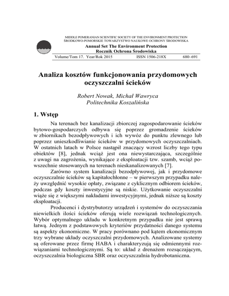 MIDDLE POMERANIAN SCIENTIFIC SOCIETY OF THE ENVIRONMENT PROTECTION ŚRODKOWO-POMORSKIE TOWARZYSTWO NAUKOWE OCHRONY ŚRODOWISKA Annual Set The Environment Protection Rocznik Ochrona Środowiska Volume/Tom 17. Year/Rok 2015 ISSN 1506-218X 680–691 Analiza kosztów funkcjonowania przydomowych oczyszczalni ścieków Robert Nowak, Michał Wawryca Politechnika Koszalińska 1. Wstęp Na terenach bez kanalizacji zbiorczej zagospodarowanie ścieków bytowo-gospodarczych odbywa się poprzez gromadzenie ścieków w zbiornikach bezodpływowych i ich wywóz do punktu zlewnego lub poprzez unieszkodliwianie ścieków w przydomowych oczyszczalniach. W ostatnich latach w Polsce nastąpił znaczący wzrost liczby tego typu obiektów [8], jednak wciąż jest ona niewystarczająca, szczególnie z uwagi na zagrożenia, wynikające z eksploatacji tzw. szamb, wciąż powszechnie stosowanych na terenach nieskanalizowanych [7]. Zarówno system kanalizacji bezodpływowej, jak i przydomowe oczyszczalnie ścieków są kapitałochłonne – w pierwszym przypadku należy uwzględnić wysokie opłaty, związane z cyklicznym odbiorem ścieków, podczas gdy koszty inwestycyjne są niskie. Użytkowanie oczyszczalni wiąże się z większymi nakładami inwestycyjnymi, jednak niższe są koszty eksploatacji. Producenci i dystrybutorzy urządzeń i systemów do oczyszczania niewielkich ilości ścieków oferują wiele rozwiązań technologicznych. Wybór optymalnego układu w konkretnym przypadku nie jest sprawą łatwą. Jednym z podstawowych kryteriów przydatności danego systemu są aspekty ekonomiczne. W pracy porównano pod kątem ekonomicznym trzy wybrane układy oczyszczalni przydomowych. Analizowane systemy są oferowane przez firmę HABA i charakteryzują się odmiennymi rozwiązaniami technologicznymi. Są to: układ z drenażem rozsączającym, oczyszczalnia biologiczna SBR oraz oczyszczalnia hydrobotaniczna. Analiza kosztów funkcjonowania przydomowych oczyszczalni ścieków 681 2. Procedury określania kosztów funkcjonowania oczyszczalni 2.1. Metody oceny inwestycji Podstawą przeprowadzenia porównawczej analizy ekonomicznej poszczególnych systemów oczyszczania ścieków jest przyjęcie jednakowych metod pomiaru składników kosztów inwestycyjnych i eksploatacyjnych. Dokonanie oceny inwestycji wiąże się z oszacowaniem korzyści, wynikających z przeprowadzonych prac, a w przypadku rozpatrywania kilku wariantów – z wyborem tego najbardziej opłacalnego. Istnieją różne metody oceny inwestycji w zależności od autora, jednak ogólnie można je podzielić na metody statyczne i dynamiczne. Podstawowa klasyfikacja została przedstawiona na rysunku 1. Metody statyczne oceny inwestycji polegają na statystycznym opracowaniu danych, dotyczących poszczególnych kosztów, a następnie na porównaniu ich w czasie. Zaliczane są do metod niedyskontowych, nieuwzględniających szeregu czynników (np. inflacji). Ponadto nie uwzględniają całego okresu trwania projektu, obejmując wąską jego część. Praktyczne wykorzystanie metod statycznych ogranicza się do inwestycji, w których nakłady i efekty są niewielkie, bądź ma miejsce podczas wyboru inwestycji, nie wymagających złożonych obliczeń. Metody oceny inwestycji Metody statyczne Analiza efektywności kosztowej Rachunek rentowności Metody dynamiczne Rachunek porównawczy kosztów NPV IRR Rys. 1. Podział metod oceny inwestycji. Oprac. własne na podstawie [5,6,9] Fig. 1. Methods assessment of the investment. Own calculations based on [5, 6,9] 682 Robert Nowak, Michał Wawryca Metody dynamiczne, bardziej złożone niż statyczne, są dokładniejsze i umożliwiają uwzględnienie większej liczby czynników (np. zmienności wartości pieniądza w czasie). Ponadto – w odróżnieniu od metod statycznych – obejmują cały okres inwestycji. Budowę przydomowej oczyszczalni ścieków należy zaliczyć do przedsięwzięć, nie generujących wpływów z inwestycji. Stąd w celu dokonania oceny tego typu przedsięwzięcia należy zastosować taką metodę, w której efektów inwestycji nie da się zmierzyć. Za efekt, uzyskiwany w tego typu przedsięwzięciach, może zostać uznana ilość oczyszczonych ścieków w skali czasu. Z drugiej strony jako efekt można przyjąć tzw. straty uniknione, możliwe do oszacowania w sytuacji braku inwestycji. M.in. autorzy [6] podkreślają, że podstawą prawidłowego porównania poszczególnych rozwiązań indywidualnych systemów oczyszczania ścieków jest doprowadzenie nakładów inwestycyjnych oraz eksploatacyjnych do kosztów jednostkowych. Podzielenie rocznych kosztów oczyszczania przez ilość oczyszczonych ścieków umożliwia uzyskanie jednakowej podstawy do porównań. Według autorów [6] najlepszą metodą jest analiza efektywności kosztowej, będąca modyfikacją metody CBA, czyli analizy kosztów i efektów. Uzasadniając prezentowane powyżej stanowisko autorzy zwracają uwagę na fakt, że w jednostkach pieniężnych mierzone są jedynie koszty, natomiast ocenie wartościującej nie podlegają efekty. Metoda zakłada ocenę inwestycji w sposób uproszczony, uwzględniając zarówno poniesione nakłady inwestycyjne, jak i koszty eksploatacji. Inne stanowisko, w kwestii wyboru najlepszej metody oceny technologii oczyszczalni przydomowej z ekonomicznego punktu widzenia, reprezentują autorzy [2]. Korzystają oni przede wszystkim z metody NPV, przyporządkowanej do metod dynamicznych (wg klasyfikacji na rysunku 1). Określenie wartości bieżącej netto polega na obliczeniu zdyskontowanych przepływów gotówki w kolejnych latach inwestycji. Według autorki [1] dyskontowanie przepływów pieniężnych sprowadza się do określenia różnicy pomiędzy wpływami i wydatkami pieniężnymi, poniesionymi na nakłady inwestycyjne, sprowadzonymi do wspólnego mianownika, co pozwala na precyzyjne i czytelne porównania. Pierwszymi czynnościami, zmierzającymi do określenia NPV, są: ustalenie nakład
