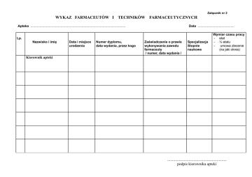 Załącznik nr 2 WYKAZ FARMACEUTÓW I TECHNIKÓW FARMACEUTYCZNYCH Apteka ........................................................................................................ Data ........................................ Lp. Nazwisko i imię Data i miejsce urodzenia Numer dyplomu, data wydania, przez kogo Zaświadczenie o prawie wykonywania zawodu farmaceuty / numer, data wydania / Specjalizacja Stopnie naukowe Wymiar czasu pracy - etat - ½ etatu umowa zlecenie (na jaki okres) Kierownik apteki ............................................................. podpis kierownika apteki