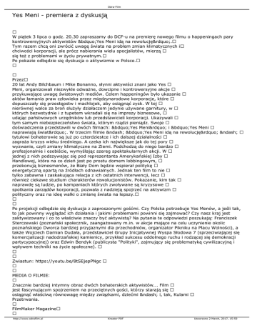 Odra-Film Yes Meni - premiera z dyskusją W piątek 3 lipca o godz. 20.30 zapraszamy do DCF-u na premierę nowego filmu o happeningach pary kontrowersyjnych aktywistów „Yes Meni idą na rewolucję”. Tym razem chcą oni zwrócić uwagę świata na problem zmian klimatycznych i chciwości korporacji, ale prócz nabierania wielu specjalistów, mierzą się też z problemami w życiu prywatnym. Po pokazie odbędzie się dyskusja o aktywizmie w Polsce. Przez 20 lat Andy Bilchbaum i Mike Bonanno, słynni aktywiści znani jako Yes Meni, organizowali niezwykle odważne, dowcipne i kontrowersyjne akcje przykuwające uwagę światowych mediów. Celem happeningów było ukazanie aktów łamania praw człowieka przez międzynarodowe korporacje, które dopuszczały się przestępstw i machlojek, aby osiągnąć zysk. W tej nierównej walce za broń służyły działaczom jedynie używane garnitury, w których bezwstydnie i z tupetem wkradali się na imprezy biznesowe, udając państwowych urzędników lub przedstawicieli korporacji. Ukazywali tym samym niebezpieczeństwo świata, którym rządzi pieniądz. Swoje doświadczenia przedstawili w dwóch filmach: „Yes Meni” i „Yes Meni naprawiają świat”. W trzecim filmie – „Yes Meni idą na rewolucję” – tytułowi bohaterowie są już po czterdziestce i ich dalszej działalności zagraża kryzys wieku średniego. A czeka ich największe jak do tej pory wyzwanie, czyli zmiany klimatyczne na Ziemi. Podchodzą do niego bardzo profesjonalnie i osobiście, wymyślając szereg spektakularnych akcji. W jednej z nich podszywając się pod reprezentanta Amerykańskiej Izby Handlowej, która na co dzień jest po prostu domem lobbingowym, przekonują biznesmenów, że Biały Dom będzie wspierał politykę energetyczną opartą na źródłach odnawialnych. Jednak ten film to nie tylko zabawna i zaskakująca relacja z ich ostatnich interwencji, lecz również ciekawe studium charakterów rewolucjonistów. Pokazanie, kim tak naprawdę są ludzie, po kampaniach których zwoływane są kryzysowe spotkania zarządów korporacji, pozwala z nadzieją spojrzeć na aktywizm polityczny oraz na ideę walki o zmianę świata na lepszy. Po projekcji odbędzie się dyskusja z zaproszonymi gośćmi. Czy Polska potrzebuje Yes Menów, a jeśli tak, to jak powinny wyglądać ich działania i jakimi problemami powinni się zajmować? Czy nasz kraj jest zaktywizowany i co to właściwie znaczy być aktywistą? Na pytania te odpowiedzi poszukają: Franciszek Sterczewski (poznański społecznik, zaangażowany m.in. w akcje mające na celu uczynienie okolic poznańskiego Dworca bardziej przyjaznymi dla przechodniów, organizator Pikniku na Placu Wolności), a także Wojciech Damian Dudała, przedstawiciel Grupy Inicjatywnej Wyspa Słodowa 7 (sprzeciwiającej się komercjalizacji nadodrzańskiej kamienicy, przykład sukcesu oddolnego ruchu i rodzącej się demokracji partycypacyjnej) oraz Edwin Bendyk (publicysta "Polityki", zajmujący się problematyką cywilizacyjną i wpływem techniki na życie społeczne). Zwiastun: https://youtu.be/8tSEjepPNgc MEDIA O FILMIE: Znacznie bardziej intymny obraz dwóch bohaterskich aktywistów... Film jest fascynującym spojrzeniem na przeciętnych gości, którzy starają się osiągnąć właściwą równowagę między związkami, dziećmi – i, tak, Kulami Przetrwania. FilmMaker Magazine http://www.odrafilm.pl Kreator PDF Utworzono 2 March, 2017, 15:59 Odra-Film Będziecie siedzieć na krawędzi fotela. Huffington Post Eksperci we wcielaniu się w korporacyjnych naganiaczy i rządowych biurokratów podczas sfingowanych, czasem komicznych konferencji prasowych, podkopujących plany instytucji, pod przedstawicieli których się oni podszywają. New York Times Zabawna mieszanka agitacji dla mas, kawalarstwa i autobiografii. Variety Yes Meni idą na rewolucję / The Yes Men Are Revolting (Holandia, Dania, Francja, Niemcy, USA 2014) reżyseria: Andy Bilchbaum, Mike Bonanno, Laura Nix występują: Mike Bonanno, Andy Bichlbaum muzyka: Didier Leplae, Joe Wong dystrybucja: Against Gravity czas: 92' http://www.odrafilm.pl Kreator PDF Utworzono 2 March, 2017, 15:59