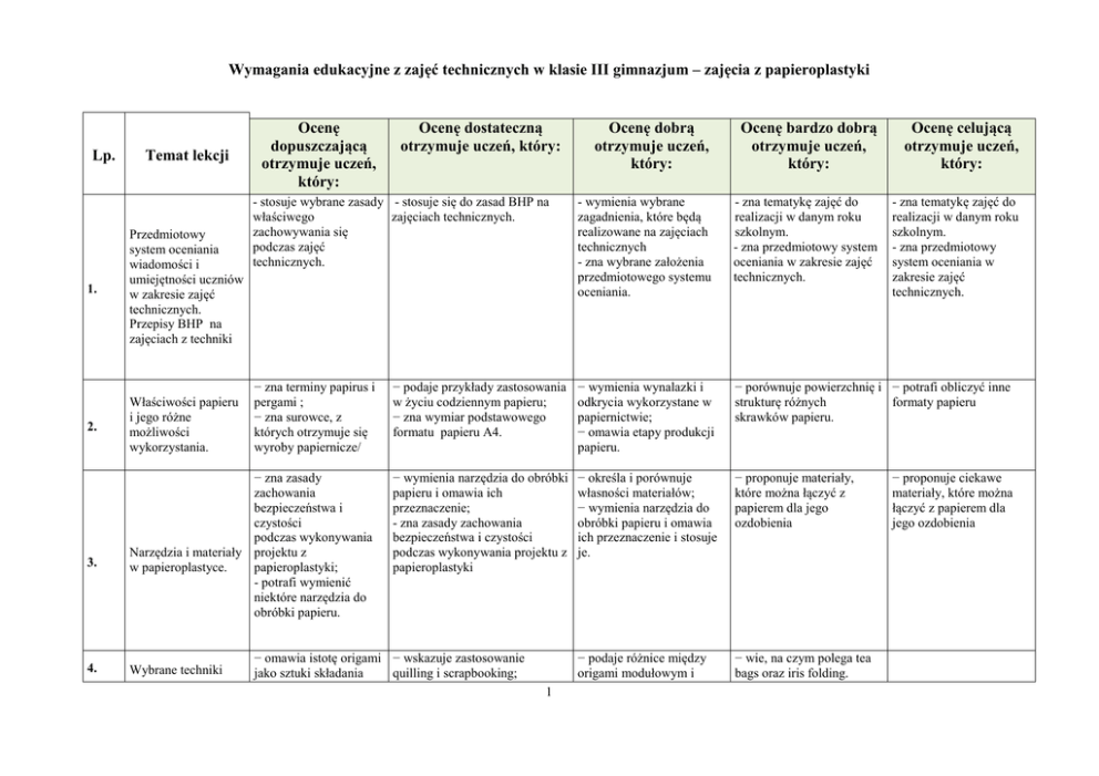 Wymagania edukacyjne z zajęć technicznych w klasie III gimnazjum – zajęcia z papieroplastyki Lp. Ocenę dobrą otrzymuje uczeń, który: Ocenę bardzo dobrą otrzymuje uczeń, który: Ocenę celującą otrzymuje uczeń, który: - stosuje wybrane zasady - stosuje się do zasad BHP na właściwego zajęciach technicznych. zachowywania się podczas zajęć technicznych. - wymienia wybrane zagadnienia, które będą realizowane na zajęciach technicznych - zna wybrane założenia przedmiotowego systemu oceniania. - zna tematykę zajęć do realizacji w danym roku szkolnym. - zna przedmiotowy system oceniania w zakresie zajęć technicznych. - zna tematykę zajęć do realizacji w danym roku szkolnym. - zna przedmiotowy system oceniania w zakresie zajęć technicznych. − zna terminy papirus i pergami ; − zna surowce, z których otrzymuje się wyroby papiernicze/ − podaje przykłady zastosowania w życiu codziennym papieru; − zna wymiar podstawowego formatu papieru A4. − wymienia wynalazki i odkrycia wykorzystane w papiernictwie; − omawia etapy produkcji papieru. − porównuje powierzchnię i − potrafi obliczyć inne strukturę różnych formaty papieru skrawków papieru. − zna zasady zachowania bezpieczeństwa i czystości podczas wykonywania Narzędzia i materiały projektu z w papieroplastyce. papieroplastyki; - potrafi wymienić niektóre narzędzia do obróbki papieru. − wymienia narzędzia do obróbki papieru i omawia ich przeznaczenie; - zna zasady zachowania bezpieczeństwa i czystości podczas wykonywania projektu z papieroplastyki − określa i porównuje własności materiałów; − wymienia narzędzia do obróbki papieru i omawia ich przeznaczenie i stosuje je. − proponuje materiały, które można łączyć z papierem dla jego ozdobienia − podaje różnice między origami modułowym i − wie, na czym polega tea bags oraz iris folding. Temat lekcji 1. Przedmiotowy system oceniania wiadomości i umiejętności uczniów w zakresie zajęć technicznych. Przepisy BHP na zajęciach z techniki 2. Właściwości papieru i jego różne możliwości wykorzystania. 3. 4. Wybrane techniki Ocenę dopuszczającą otrzymuje uczeń, który: Ocenę dostateczną otrzymuje uczeń, który: − omawia istotę origami − wskazuje zastosowanie jako sztuki składania quilling i scrapbooking; 1 − proponuje ciekawe materiały, które można łączyć z papierem dla jego ozdobienia − podaje przykłady zdobienia courtage. klasycznym − tworzy w zeszycie lub na tablicy tabelę z zasadami pracy nad orgiami; - składa co najmniej trzy bazy z origami według instrukcji w zeszycie tematycznym. − składa każdą z baz origami według instrukcji w zeszycie tematycznym (np. każda w innym kolorze papieru). − ocenia stopień trudności wzorów i próbuje samodzielnie złożyć każdą z baz orgiami nie korzystając z instrukcji w zeszycie tematycznym. − okleja kolorowym papierem Kartkę. − wykonuje kartkę okolicznościową według projektu − ozdabia według własnego − ozdabia według pomysłu swój projekt. własnego pomysłu swój projekt; - pracę wykonuje ciekawie i bardzo starannie. − składa trzy modele z coraz mniejszych kartek papieru; − wykonuje elementy składowe według instrukcji. − składa żurawia z wykorzystaniem bazy „kwadrat”. – analizuje etapy pracy według różnych diagramów. - przygotowuje – formuje moduły i łączy je ze kilkanaście kółek (około sobą. 20); – ćwiczy zginanie kół na cztery części i ćwiartki. – opracowuje projekt własnej kartki okolicznościowej z zastosowaniem dalii; - wykonuje kartkę okolicznościową według projektu. − analizuje wpływ precyzyjności na efekt końcowy projektu. − składa bazę „wiatrak”; − umieszcza zdjęcie w ramce; − modyfikuje bazę − planuje sposób ozdobienia według instrukcji. ramki. − wykonuje zdobienie według własnego planu. - ocenia własną pracę. wykonywania ozdób i papieru. przedmiotów z papieru. 5. 6. 7. 8. 9. Podstawowe bazy origami. Ozdobna kartka okolicznościowa „składaczek”. Żuraw – japoński symbol zdrowia i pokoju. Zastosowanie kółek w origami. Papierowa ramka na zdjęcie. − wskazuje różnice w pracy nad tradycyjnym i zaawansowanym orgiami; − przygotowuje kilkanaście (12-13) kwadratowych kartek do ćwiczeń. − składa kartkę według instrukcji. - wykorzystuje ćwiczenie składania żurawia według odpowiedniej bazy wprowadza elementy zagięcia narożników 2 - potrafi samodzielnie złożyć każdą z baz orgiami nie korzystając z instrukcji w zeszycie tematycznym. - wykonuje pracę starannie i samodzielnie - pracę wykonuje bardzo starannie i całkowicie samodzielnie 10. 11. 12. Pudełko modułowe z miejscem na zdjęcia Album harmonijkowy. Pudełka i torebki origami. 13. Kartki wykonywane techniką tea bags 14. Ozdoby świąteczne: kartka z choinką, wianek, gwiazdka. − postępuje zgodnie z planem pracy − wykonuje pracę samodzielnie i dba o estetykę wykonanej pracy. − wykonuje pracę samodzielnie i dba o estetykę wykonanej pracy poprzez ciekawe zdobienia. – współtworzy – zdobi album, wykorzystując regulamin konkursu na wstążeczki, klamerki, zapięcia. klasowy album harmonijkowy; – składa moduły z wykorzystaniem wiedzy nabytej wcześniej; – łączy ściany albumu. - wypełnia albumu zdjęciami odpowiednio przyciętymi. − postępuje zgodnie z planem pracy i dba o estetykę wykonanej pracy. − wykonuje pracę samodzielnie i dba o estetykę wykonanej pracy poprzez ciekawe zdobienia. − składa dolną część − organizuje pracę według etapów instrukcji. pudełka według instrukcji; − składa wieczko pudełka; − wykonuje torebkę orgiami w kolejnych etapach pracy: boki, dolna część, przymocowanie sznurka oraz zdobienie; − ćwiczy wykorzystywanie przy obrabianiu papieru dziurkacza, nożyczek, kleju. − analizuje wpływ precyzyjności na efekt końcowy projektu. − wykonuje pracę s
