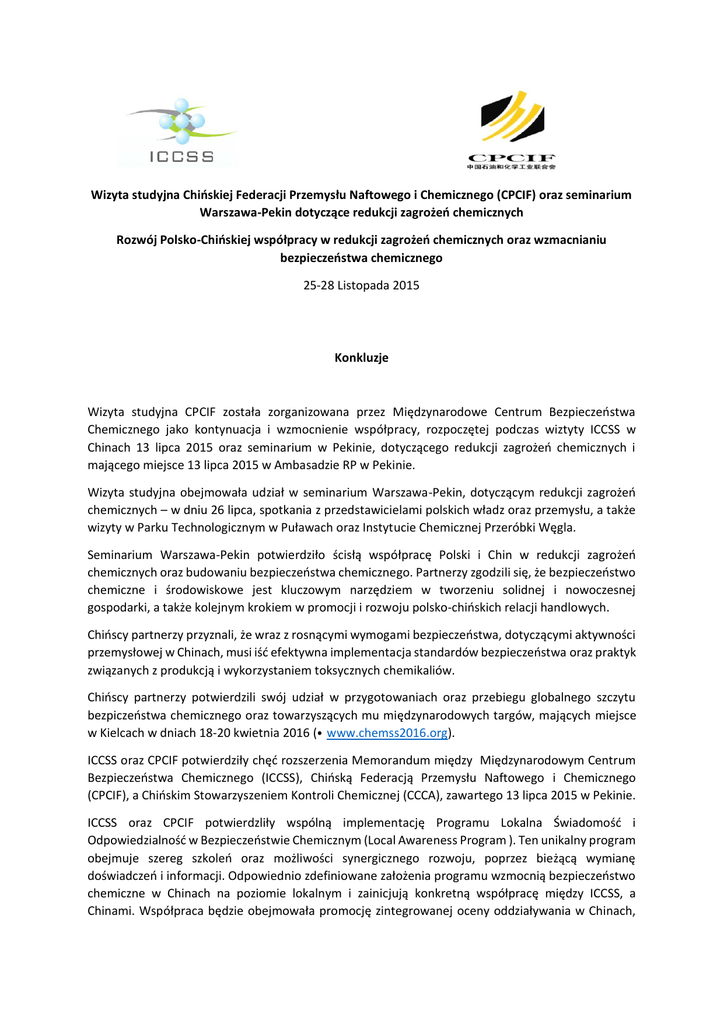 Wizyta studyjna Chińskiej Federacji Przemysłu Naftowego i Chemicznego (CPCIF) oraz seminarium Warszawa-Pekin dotyczące redukcji zagrożeń chemicznych Rozwój Polsko-Chińskiej współpracy w redukcji zagrożeń chemicznych oraz wzmacnianiu bezpieczeństwa chemicznego 25-28 Listopada 2015 Konkluzje Wizyta studyjna CPCIF została zorganizowana przez Międzynarodowe Centrum Bezpieczeństwa Chemicznego jako kontynuacja i wzmocnienie współpracy, rozpoczętej podczas wiztyty ICCSS w Chinach 13 lipca 2015 oraz seminarium w Pekinie, dotyczącego redukcji zagrożeń chemicznych i mającego miejsce 13 lipca 2015 w Ambasadzie RP w Pekinie. Wizyta studyjna obejmowała udział w seminarium Warszawa-Pekin, dotyczącym redukcji zagrożeń chemicznych – w dniu 26 lipca, spotkania z przedstawicielami polskich władz oraz przemysłu, a także wizyty w Parku Technologicznym w Puławach oraz Instytucie Chemicznej Przeróbki Węgla. Seminarium Warszawa-Pekin potwierdziło ścisłą współpracę Polski i Chin w redukcji zagrożeń chemicznych oraz budowaniu bezpieczeństwa chemicznego. Partnerzy zgodzili się, że bezpieczeństwo chemiczne i środowiskowe jest kluczowym narzędziem w tworzeniu solidnej i nowoczesnej gospodarki, a także kolejnym krokiem w promocji i rozwoju polsko-chińskich relacji handlowych. Chińscy partnerzy przyznali, że wraz z rosnącymi wymogami bezpieczeństwa, dotyczącymi aktywności przemysłowej w Chinach, musi iść efektywna implementacja standardów bezpieczeństwa oraz praktyk związanych z produkcją i wykorzystaniem toksycznych chemikaliów. Chińscy partnerzy potwierdzili swój udział w przygotowaniach oraz przebiegu globalnego szczytu bezpiczeństwa chemicznego oraz towarzyszących mu międzynarodowych targów, mających miejsce w Kielcach w dniach 18-20 kwietnia 2016 (⦁ www.chemss2016.org). ICCSS oraz CPCIF potwierdziły chęć rozszerzenia Memorandum między Międzynarodowym Centrum Bezpieczeństwa Chemicznego (ICCSS), Chińską Federacją Przemysłu Naftowego i Chemicznego (CPCIF), a Chińskim Stowarzyszeniem Kontroli Chemicznej (CCCA), zawartego 13 lipca 2015 w Pekinie. ICCSS oraz CPCIF potwierdzliły wspólną implementację Programu Lokalna Świadomość i Odpowiedzialność w Bezpieczeństwie Chemicznym (Local Awareness Program ). Ten unikalny program obejmuje szereg szkoleń oraz możliwości synergicznego rozwoju, poprzez bieżącą wymianę doświadczeń i informacji. Odpowiednio zdefiniowane założenia programu wzmocnią bezpieczeństwo chemiczne w Chinach na poziomie lokalnym i zainicjują konkretną współpracę między ICCSS, a Chinami. Współpraca będzie obejmowała promocję zintegrowanej oceny oddziaływania w Chinach, która zawiera, między innymi, analizę oddziaływania na środowisko przy proponowanych środkach technicznych oraz zalecenia dotyczące doboru środków kontroli emisji i planu kontroli emisji w przedsiębiorstwie. CPCIF zaprasza również ICCSS oraz Urząd Dozoru Technicznego do współpracy w ramach podwyższenia bezpieczeństwa technicznego, poprzez nowoczesną i profesjonalną ocenę kultury technicznej. Wszystkie polskie i międzynarodowe firmy z sektora bezpiczeństwa chemicznego oraz ochrony środowiska są zaproszone do udziału w Programie Lokalna Świadomość. Chińska Federacja Przemysłu Naftowego i Chemicznego (CPCIF) oraz Międzynarodowe Centrum Bezpieczeństwa Chemicznego (ICCSS) opublikują wspólny komunikat prasowy potwierdzający wzajemne zainteresowanie temat bezpieczeństwa chmicznego oraz określający perspektywiczne płaszczyzny współpracy. Na początku 2016 roku CPCIF będzie gospodarzem wizyty studyjnej w Chinach, stworzonej dla pomiotów zainteresowanych programem. CPCIF i ICCSS potwierdziły chęć organizacji seminarium w Pekinie na temat redukcji zagrożeń chemicznych, w drugiej połowie 2016 roku.