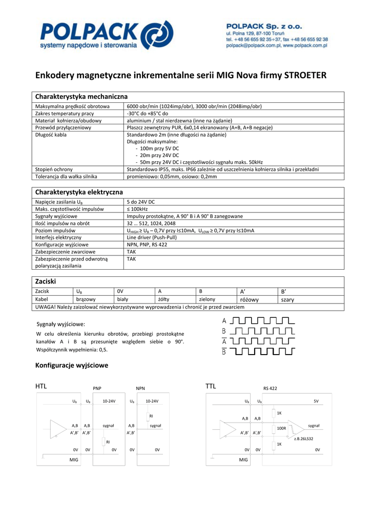 Enkodery magnetyczne inkrementalne serii MIG Nova firmy STROETER Charakterystyka mechaniczna Maksymalna prędkość obrotowa Zakres temperatury pracy Materiał kołnierza/obudowy Przewód przyłączeniowy Długość kabla 6000 obr/min (1024imp/obr), 3000 obr/min (2048imp/obr) ‐30°C do +85°C do aluminium / stal nierdzewna (inne na żądanie) Płaszcz zewnętrzny PUR, 6x0,14 ekranowany (A+B, A+B negacje) Standardowo 2m (inne długości na żądanie) Długości maksymalne: ‐ 100m przy 5V DC ‐ 20m przy 24V DC ‐ 50m przy 24V DC i częstotliwości sygnału maks. 50kHz Standardowo IP55, maks. IP66 zależnie od uszczelnienia kołnierza silnika i przekładni promieniowo: 0,05mm, osiowo: 0,2mm Stopień ochrony Tolerancja dla wałka silnika Charakterystyka elektryczna Napięcie zasilania UB Maks. częstotliwość impulsów Sygnały wyjściowe Ilość impulsów na obrót Poziom impulsów Interfejs elektryczny Konfiguracje wyjściowe Zabezpieczenie zwarciowe Zabezpieczenie przed odwrotną polaryzacją zasilania 5 do 24V DC ≤ 100kHz Impulsy prostokątne, A 90° B i A 90° B zanegowane 32 … 512, 1024, 2048 UHIGH ≥ UB – 0,7V przy I≤10mA, ULOW ≥ 0,7V przy I≤10mA Line driver (Push‐Pull) NPN, PNP, RS 422 TAK TAK Zaciski Zacisk UB 0V A B A’ Kabel brązowy biały żółty zielony różowy UWAGA! Należy zaizolować niewykorzystywane wyprowadzenia i chronić je przed zwarciem B’ szary Sygnały wyjściowe: W celu określenia kierunku obrotów, przebiegi prostokątne kanałów A i B są przesunięte względem siebie o 90°. Współczynnik wypełnienia: 0,5. Konfiguracje wyjściowe HTL TTL PNP NPN UB UB 10‐24V UB 10‐24V A,B A,B sygnał A,B RS 422 UB UB A,B A,B sygnał 100R A’,B’ 0V MIG sygnał A’,B’ A’,B’ z.B.26LS32 RI 0V 5V 1K RI A’,B’ A’,B’ 1K 0V 0V 0V 0V MIG 0V 0V UWAGA! Należy ostrożnie obchodzić się z pierścieniem magnetycznym - nie używaj narzędzi z elementami magnetycznymi - chroń zewnętrzną powierzchnię pierścienia przed zniszczeniem - zabezpiecz przed zetknięciem z innymi elementami magnetycznymi - do czyszczenia kołnierza ze stali nierdzewnej i pierścienia magnetycznego używaj alkoholu lub środków czyszczących na bazie acetonu Montaż 1. Zdemontuj klin wałka silnika 2. Sprawdź wymiary ta i Da 3.Umieść pierścień tolerancyjny u nasady wału 4. Załóż pierścień magnetyczny 5. Do montażu pierścienia użyj odpowiedniej tulei Nie przechylaj/ukosuj pierścienia podczas montażu 6. Skróć i zamontuj klin wałka silnika 7. Enkoder musi być uszczelniony po obu stronach przez kołnierze silnika i przekładni z odpowiednimi uszczelniaczami Demontaż W celu uniknięcia zniszczenia pierścienia magnetycznego prosimy zachować następującą procedurę montażu: 1. Montaż enkodera na kołnierzu silnika 2. Montaż silnika z enkoderem na kołnierzu przekładni