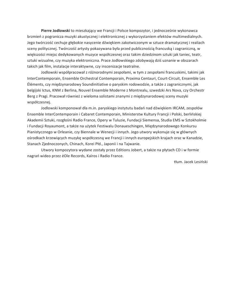 PierreJodlowskitomieszkającyweFrancjiiPolscekompozytor,ijednocześniewykonawca brzmieńzpograniczamuzykiakustycznejielektronicznejzwykorzystaniemefektówmultimedialnych. Jegotwórczośćcechujegłębokienasyceniedźwiękiemzakotwiczonymwsztucedramatycznejirealiach scenypolitycznej.Twórczośćartystypokazywanabyłaprzedpublicznościąfrancuskąizagraniczną,w większościmiejscdedykowanychmuzycewspółczesnejoraztakimdziedzinomsztukijaktaniec,teatr, sztukiwizualne,czymuzykaelektroniczna.PraceJodlowskiegozdobywajądziśuznaniewobszarach takichjakfilm,instalacjeinteraktywne,czyinscenizacjeteatralne. Jodlowskiwspółpracowałzróżnorodnymizespołami,wtymzzespołamifrancuskimi,takimijak InterContemporain,EnsembleOrchestralContemporain,ProximaCentauri,Court-Circuit,EnsembleLes Éléments,czymiędzynarodowySoundinitiativeoparyskimrodowodzie,atakżezzagranicznymi,jak belgijskiIctus,KNMzBerlina,NouvelEnsembleModernezMontrealu,szwedzkiArsNova,czyOrchestr BergzPragi.Pracowałrównieżzwielomasolistamiznanymizmiędzynarodowejscenymuzyki współczesnej. Jodlowskikomponowałdlam.in.paryskiegoinstytutubadańnaddźwiękiemIRCAM,zespołów EnsembleInterContemporainiCabaretContemporain,MinisterstwKulturyFrancjiiPolski,berlińskiej AkademiiSztuki,rozgłośniRadioFrance,OperywTuluzie,FundacjiSiemensa,StudiaEMSwSztokholmie iFundacjiRoyaumont,atakżenaużytekFestiwaluDonaueschingen,MiędzynarodowegoKonkursu PianistycznegowOrleanie,czyBiennalewWenecjiiinnych.Jegoutworywykonujesięwgłównych ośrodkachkrzewiącychmuzykęwspółczesnąweFrancjiiinnycheuropejskichkrajachorazwKanadzie, StanachZjednoczonych,Chinach,KoreiPłd.,JaponiiinaTajwanie. UtworykompozytorawydanezostałyprzezEditionsJobert,atakżenapłytachCDiwformie nagrańwideoprzezéOleRecords,KaïrosiRadioFrance. tłum.JacekLesiński