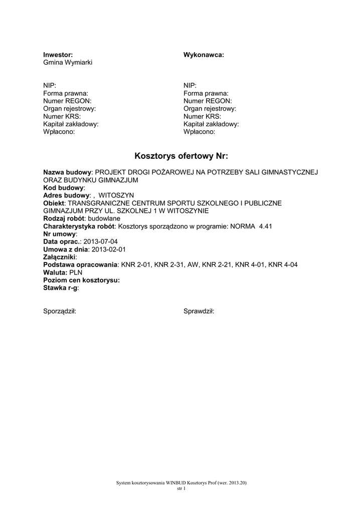 Inwestor: Gmina Wymiarki Wykonawca: NIP: Forma prawna: Numer REGON: Organ rejestrowy: Numer KRS: Kapitał zakładowy: Wpłacono: NIP: Forma prawna: Numer REGON: Organ rejestrowy: Numer KRS: Kapitał zakładowy: Wpłacono: Kosztorys ofertowy Nr: Nazwa budowy: PROJEKT DROGI POŻAROWEJ NA POTRZEBY SALI GIMNASTYCZNEJ ORAZ BUDYNKU GIMNAZJUM Kod budowy: Adres budowy: , WITOSZYN Obiekt: TRANSGRANICZNE CENTRUM SPORTU SZKOLNEGO I PUBLICZNE GIMNAZJUM PRZY UL. SZKOLNEJ 1 W WITOSZYNIE Rodzaj robót: budowlane Charakterystyka robót: Kosztorys sporządzono w programie: NORMA 4.41 Nr umowy: Data oprac.: 2013-07-04 Umowa z dnia: 2013-02-01 Załączniki: Podstawa opracowania: KNR 2-01, KNR 2-31, AW, KNR 2-21, KNR 4-01, KNR 4-04 Waluta: PLN Poziom cen kosztorysu: Stawka r-g: Sporządził: Sprawdził: System kosztorysowania WINBUD Kosztorys Prof (wer. 2013.20) str 1 Lp. Podstawa ustalenia Opis robót Jedn. miary Obmiar 3 4 5 3 4 1. DROGA POŻAROWA 1 2 1. ROBOTY PRZYGOTOWAWCZE INNE 1 2 1 wg nakładów rzeczowych AW1-090 Ogrodzenie placu budowy-kalkulacja własna 2 wg nakładów rzeczowych AW1-090 Tymczasowe zasilanie energetyczne placu budowy-kalkulacja własna 3 wg nakładów rzeczowych AW2-090 Tymczasowe zasilanie energetyczne placu budowy-rozbiórka kalkulacja własna 4 wg nakładów rzeczowych KNR 4-040102-02-060 Rozebranie murów i słupów z cegły powyżej terenu w budynkach o wysokości do 9 m (do 2 kondygnacji) na zaprawie cementowo-wapiennej ANALOGIA ROZEBRANIE STUDNI 5 kpl 1,000 kpl 1,000 kpl 1,000 m3 1,200 m3 0,525 kpl 1,000 krotność= 1,000 krotność= 1,000 krotność= 1,000 Charakterystyka Robót: Tablica: 0102 1.Wniesienie lin zabezpieczających i umocowanie ich do uprzednio ustawionych pionów drabin lub innych rusztowań 2.Rozebranie murów i słupów ( filarów ) bez względu na rodzaj i wymiar cegły przy użyciu klinów i oskardów 3.Obniżanie pionów z drabin w miarę postępu r obót 4.Rozebranie murów o wysokości do 9 m, wolnostojących z cegły przy użyciu klinów, młotów i oskardów 5.Usunięcie gruzu na zewnątrz budynku poprzez uprzednio ustawione rynny krotność= 1,000 5 wg nakładów rzeczowych KNR 4-010329-05-060 Wykucie otworów w ścianach z cegieł o grubości ponad 1/2 cegły na zaprawie cementowej,dla otworów drzwiowych i okiennych Charakterystyka Robót: Tablica: 0329 1.Ręczne wykucie otworów z wyrównaniem ościeży 2.Odłożenie na bok cegieł nadających się do ponownego wbudowania krotność= 1,000 6 wg nakładów rzeczowych AW2-090 Montaż i dostawa drzwi ewakuacyjnych, wykończenie ościeży po montażu stolarki krotność= 1,000 System kosztorysowania WINBUD Kosztorys Prof (wer. 2013.20) str 2 2. ROBOTY ZIEMNE 1 2 3 7 wg nakładów rzeczowych KNR 2-010121-02-052 Roboty pomiarowe przy powierzchniowych robotach ziemnych,koryta pod nawierzchnie placów postojowych. 4 5 ha 0,075 m2 734,500 m2 734,500 m2 734,500 Charakterystyka Robót: Tablica: 0121 1.Ustawienie kołków kierunkowych na krawędzi pola i sprawdzenie kątów oraz powierzchni robót 2.Wznowienie siatki niwelacyjnej oraz wykonanie reperów drewnianych i ich ustawienie 3.Dwukrotna niwelacja reperów i niwelacja siatki 4.Zabezpieczenie głównej osi terenu przez jej wyniesienie poza obręb robót 5.Wyznaczenie poziomów robót ziemnych 6.Wykonanie pomiarów przejściowych 7.Wznowienie siatki po zakończeniu robót 8.Niwelacja kontrolna wykonanych robót ziemnych i ewentualnie nawierzchniowych 9.Wyrób kołków pomiarowych i reperów potrzebnych w okresie wykonywania robót krotność= 1,000 8 wg nakładów rzeczowych KNR 2-010126-01-050 Usunięcie warstwy ziemi urodzajnej- humusu,za pomocą spycharek.Grubość warstwy do 15 cm. 9 wg nakładów rzeczowych KNR 2-010126-02-050 Usuwanie warstwy ziemi urodzajnej - humusu,za pomocą spycharek.Dodatek za każde dalsze 5 cm grubości warstwy krotność= 1,000 Charakterystyka Robót: Tablica: 0126 1.Usunięcie ziemi roślinnej spycharką poza granice robót i ręczne podgarnięcie humusu na hałdzie Uwaga: Nakłady w tablicy uwzględniają przemieszczenie humusu na odległość do 40 m. Nakłady z tytułu przemieszczania humusu na dalsze odległości - po obliczeniu objętości - przyjmuje się z tablicy 0227. krotność= 2,000 10 wg ceny jednostkowej KNR 2-310101-01-050 Mechaniczne wykonywanie koryt na całej szerokości jezdni i chodników. Głębokość 20 cm. Kategoria gruntu I-IV Charakterystyka Robót: Tablica: 0101 1.Odspojenie gruntu ze złożeniem urobku na odkład lub na hałdę 2.Profilowanie dna koryta z mechanicznym zagęszczeniem 3.Uformowanie poboczy z wyrównaniem do wymaganego profilu 4.Mechaniczne zagęszczenie poboczy krotność= 1,000 System kosztorysowania WINBUD Kosztorys Prof (wer. 2013.20) str 3 1 2 3 11 wg ceny jednostkowej KNR 2-310101-02-050 Mechaniczne wykonywanie koryt na całej szerokości jezdni i chodników. Dodatek za każde dalsze 5 cm. Kategoria gruntu I-IV 4 5 m2 734,500 m2 734,500 m2 626,260 m2 626,260 m2 54,740 m2 54,740 Charakterystyka Robót: Tablica: 0101 1.Odspojenie gruntu ze złożeniem urobku na odkład lub na hałdę 2.Profilowanie dna koryta z mechanicznym zagęszczeniem 3.Uformowanie poboczy z wyrównaniem do wymaganego profilu 4.Mechaniczne zagęszczenie poboczy krotność= 6,000 12 wg nakładów rzeczowych KNR 2-310103-04-050 Mechaniczne profilowanie i zagęszczanie podłoża pod warstwy konstrukcyjne nawierzchni. Kategoria gruntu I-IV Charakterystyka Robót: Tablica: 0103 1.Profilowanie podłoża 2.Zagęszczenie podłoża krotność= 1,000 13 wg nakładów rzeczowych KNR 2-310106-03-050 Warstwa odcinająca zagęszczana mechanicznie piaskiem. Grubość warstwy po zagęszczeniu 6 cm Charakterystyka Robót: Tablica: 0106 1.Uzupełniające wyrównanie podłoża 2.Rozścielenie warstwy odcinającej i doprowadzenie do wymaganego profilu 3.Mechaniczne zagęszczenie warstwy odcinającej z polewaniem wodą krotność= 1,000 14 wg nakładów rzeczowych KNR 2-310106-04-050 Warstwa odcinająca zagęszczana mechanicz