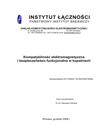 INSTYTUT ŁĄCZNOŚCI PAŃSTWOWY INSTYTUT BADAWCZY ZAKŁAD KOMPATYBILNOŚCI ELEKTROMAGNETYCZNEJ ul. Swojczycka 38 51-501 Wrocław Tel. +48713699803 Fax. +48713728878 Email: [email protected] Kompatybilność elektromagnetyczna i bezpieczeństwo funkcjonalne w kopalniach Sprawozdanie Z21/1009/21 30 002 6/(67/2006) Autor sprawozdania: Dr inŜ. Mirosław Pietranik Wrocław, grudzień 2006 r. Kompatybilność elektromagnetyczna i bezpieczeństwo funkcjonalne w kopalniach 2 Nr pracy : 21 30 002 6 (67/2006) Nazwa pracy : Kompatybilność elektromagnetyczna i bezpieczeństwo funkcjonalne w kopalniach Zleceniodawca : Praca statutowa Data rozpoczęcia : Styczeń 2006 r. Data zakończenia : Grudzień 2006 r Słowa kluczowe : Kierownik pracy : kompatybilność elektromagnetyczna, bezpieczeństwo funkcjonalne, górnictwo dr inŜ. Mirosław Pietranik Wykonawcy pracy : dr inŜ. Mirosław Pietranik prof. dr hab. Ryszard G. StruŜak mgr inŜ. Marek Michalak mgr inŜ. Piotr Laszczyk mgr inŜ. Marek Kałuski mgr inŜ. Maga Hetel mgr inŜ. Karolina Skrzypek mgr inŜ. Marta Macher technik Michał Stajszczyk technik Rafał Bobrowski Małgorzata Pietrzela Praca wykonana w Zakładzie Kompatybilności Elektromagnetycznej Instytutu Łączności we Wrocławiu Kierownik Zakładu: dr inŜ. Janusz Sobolewski Niniejsze opracowanie moŜe być powielane i publikowane wyłącznie w całości Powielanie i publikowanie fragmentów wymaga uzyskaniu zgody Instytutu Łączności © Copyright by Instytut Łączności, Wrocław 2006 Kompatybilność elektromagnetyczna i bezpieczeństwo funkcjonalne w kopalniach 3 Streszczenie Niniejsza praca dotyczy kompatybilności elektromagnetycznej urządzeń elektronicznych sterujących maszynami i procesami stosowanymi w górnictwie zapewniającej ich poprawne działanie, czyli bezpieczeństwo funkcjonalne. Urządzenia elektroniczne są stosowane szeroko w przemyśle wszędzie tam, gdzie wymagana jest szybka reakcja, niezawodność i dokładność, wysoka wydajność i efektywność ekonomiczna. Wszelkie urządzenia elektroniczne - niezaleŜnie od ich konstrukcji, zasad działania itp - są jednak podatne (tj. nieodporne) na postronne zaburzenia elektromagnetyczne. Problem jest stosunkowo nowy i w wielu przepisach prawnych dotyczących bezpieczeństwa funkcjonalnego i kompatybilności elektromagnetycznej istnieją jeszcze pewne rozbieŜności, które mogą prowadzić do zwiększonego ryzyka zawodnego działania systemów. Wynika to z następujących przyczyn: - stan środowiska elektromagnetycznego pogarsza się w wyniku masowego i wzrastającego stosowania urządzeń elektrycznych; naleŜy pamiętać, Ŝe kaŜda zmiana prądu elektrycznego powoduje pojawianie się pól elektromagnetycznych i zmiennych napięć, które mogą wywoływać zakłócenia w pracy urządzeń elektronicznych, - zaburzenie elektromagnetyczne mają róŜnorodny charakter w dziedzinie czasu i częstotliwości, - poziom zaburzeń elektromagnetycznych wzrasta w wyniku stosowania urządzeń elektromechanicznych o coraz większych mocach, - wiele zaburzeń o róŜnorodnym charakterze występuje coraz częściej łącznie (tj. jednocześnie), co stanowi większe naraŜenie układów elektronicznych, niŜ w przypadku pojedynczych zaburzeń występujących oddzielnie, - podatność urządzeń elektronicznych na zaburzenia elektromagnetyczne powiększa się w wyniku miniaturyzacji nowszych technologii układów scalonych, - ilość róŜnych zastosowań układów elektronicznych w systemach bezpieczeństwa funkcjonalnego urządzeń wzrasta w olbrzymim tempie w wielu dziedzinach, np. w sygnalizacji stanów niebezpiecznych, regulacji pracy wielkich urządzeń itp. A producenci urządzeń: - są pod stałym naciskiem zmniejszania kosztów wytwarzania i skracania czasu opracowywania wyrobów, wobec czego starają się spełniać tylko minimalne wymagania 1 z zakresu kompatybilności elektromagnetycznej . W literaturze technicznej jest bardzo mało publikacji z zakresu EMC i bezpieczeństwa funkcjonalnego, zwłaszcza 1 w środowisku kopalni. Przykładowo w poradniku dotyczącym kompatybilności Stąd tak częste powoływanie się na znak CE jako stwierdzenie, ze z "naszymi urządzeniami" jest wszystko OK! Ale czy tak jest rzeczywiście? W specjalistycznej literaturze technicznej coraz częściej zwraca się uwagę na wielkie ryzyko jakie niesie za sobą takie podejście Kompatybilność elektromagnetyczna i bezpieczeństwo funkcjonalne w kopalniach 4 2 elektromagnetycznej i bezpieczeństwa funkcjonalnego, opracowanym przez IEE [99] omawia się te problemy w odniesieniu do środowiska transportu drogowego, morskiego (statki), szynowego, lotniczego (pokłady samolotów), słuŜby zdrowia, budynków, przemysłu cięŜkiego, ale nie wymienia się tam środowiska kopalni. Celem pracy jest rozpoznanie problemu kompatybilności elektromagnetycznej i bezpieczeństwa funkcjonalnego w środowisku kopalni. Rozdział 1 sprawozdania poświęcony jest zagadnieniu bezpieczeństwa funkcjonalnego urządzeń i kompatybilności elektromagnetycznej. Omówiono w nim ustalenia wynikające z Dyrektyw Unii Europejskiej (EMC, maszynowej i niskonapięciowej) i powiązanych z nimi norm, zwracając uwagę na zauwaŜone tam niekonsekwencje, które mogą prowadzić do tragicznych w skutkach nieporozumień między producentami urządzeń i ich uŜytkownikami. W rozdziale 2 omówiono te czynniki, które decydują o prawidłowym współistnieniu róŜnych urządzeń bez szkodliwych zaburzeń elektromagnetycznych. Przedyskutowano tam zagadnienia identyfikacji zaburzeń i ich podział, drogi ich przenikania do urządzeń zakłócanych oraz przedsięwzięcia prowadzące do uzyskania kompatybilnego współistnienia urządzeń elektronicznych w określonym środowisku elektromagnetycznym. Omówiono tam takŜe strukturę norm z zakresu kompatybilności elektromagnetycznej obowiązujących w Polsce. Rozdział 3 dotyczy opisu róŜnorodnych zjawisk elektromagnetycznyc