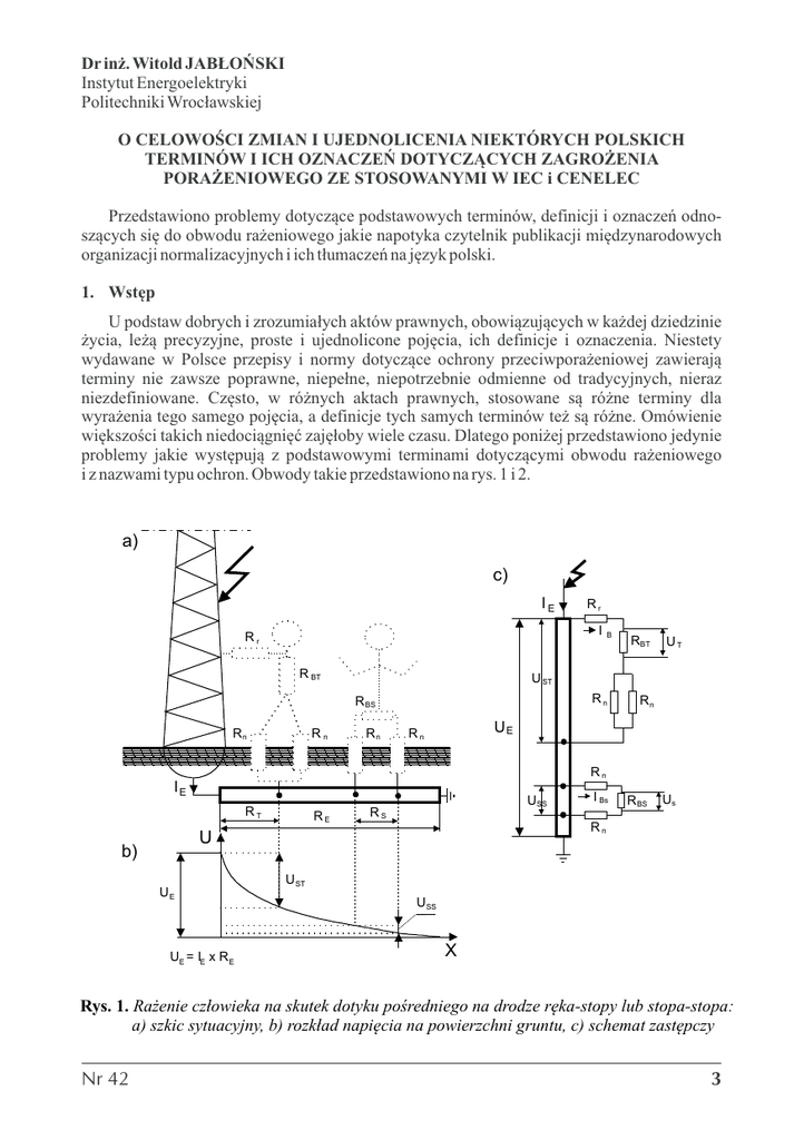 Dr inż. Witold JABŁOŃSKI Instytut Energoelektryki Politechniki Wrocławskiej O CELOWOŚCI ZMIAN I UJEDNOLICENIA NIEKTÓRYCH POLSKICH TERMINÓW I ICH OZNACZEŃ DOTYCZĄCYCH ZAGROŻENIA PORAŻENIOWEGO ZE STOSOWANYMI W IEC i CENELEC Przedstawiono problemy dotyczące podstawowych terminów, definicji i oznaczeń odnoszących się do obwodu rażeniowego jakie napotyka czytelnik publikacji międzynarodowych organizacji normalizacyjnych i ich tłumaczeń na język polski. 1. Wstęp U podstaw dobrych i zrozumiałych aktów prawnych, obowiązujących w każdej dziedzinie życia, leżą precyzyjne, proste i ujednolicone pojęcia, ich definicje i oznaczenia. Niestety wydawane w Polsce przepisy i normy dotyczące ochrony przeciwporażeniowej zawierają terminy nie zawsze poprawne, niepełne, niepotrzebnie odmienne od tradycyjnych, nieraz niezdefiniowane. Często, w różnych aktach prawnych, stosowane są różne terminy dla wyrażenia tego samego pojęcia, a definicje tych samych terminów też są różne. Omówienie większości takich niedociągnięć zajęłoby wiele czasu. Dlatego poniżej przedstawiono jedynie problemy jakie występują z podstawowymi terminami dotyczącymi obwodu rażeniowego i z nazwami typu ochron. Obwody takie przedstawiono na rys. 1 i 2. a) c) IE Rr I Rr R BT Rn RBT UT U ST Rn R BS Rn B Rn Rn UE Rn Rn IE RT RE USS RS UE UE = IE x R E R BS Us Rn U b) I Bs U ST USS X Rys. 1. Rażenie człowieka na skutek dotyku pośredniego na drodze ręka-stopy lub stopa-stopa: a) szkic sytuacyjny, b) rozkład napięcia na powierzchni gruntu, c) schemat zastępczy Nr 42 3 b) a) IB Rr U ST Rr R BT U T Rr R BT Rr Rys. 2. Rażenie człowieka na skutek dotyku pośredniego na drodze ręka-ręka: a) szkic sytuacyjny, b) schemat zastępczy obwodu Na tych rysunkach zastosowano oznaczenia: UE - napięcie uziomowe, UT - napięcie dotykowe rażeniowe, UST - napięcie dotykowe, US - napięcie krokowe rażeniowe, USS - napięcie krokowe, IE - prąd uziomowy, IB - prąd rażeniowy, Rr - rezystancja przejścia między ręką a dotykaną częścią przewodzącą, Rn - rezystancja przejścia na drodze stopa-ziemia, RBS - rezystancja ciała człowieka na drodze stopa-stopa, RBT - rezystancja ciała człowieka na drodze ręka- stopy lub ręka-ręka, RE - rezystancja uziemienia. Wyżej wymienione terminy oznaczeń są terminami używanymi w Polsce od wielu lat, lecz niektóre z nich nie są zgodne z dosłownymi tłumaczeniami terminów stosowanych w IEC i CENELEC. Natomiast oznaczenia są w większości zaczerpnięte z publikacji ww. organizacji międzynarodowych. W dalszej części referatu omówione zostały problemy z terminami, definicjami i oznaczeniami zaznaczonymi na rys. 1 i 2 symbolami UST, UT, IB, oraz z terminami: największe dopuszczalne napięcie dotykowe USTp, największe dopuszczalne napięcie rażeniowe dotykowe UTp , ochrona przed dotykiem bezpośrednim i ochrona przed dotykiem pośrednim. 2. Napięcie dotykowe i napięcie rażeniowe dotykowe Tradycyjne polskie terminy „napięcie dotykowe” i „napięcie rażeniowe dotykowe” sprawiają tłumaczom i czytelnikom publikacji IEC i CENELEC najwięcej kłopotów. Już pobieżna analiza dokumentów pozwala stwierdzić, że w tych dokumentach: - stosowane są dla poszczególnych pojęć nie zawsze te same terminy, definicje i oznaczenia, 4 - dosłowne tłumaczenie niektórych terminów na język polski brzmi identycznie jak tradycyjne terminy polskie, lecz oznacza co innego, - w publikacjach IEC definicje poszczególnych terminów są zapisane nieprecyzyjnie, tak że ich interpretacja nie zawsze jest jednoznaczna, - w wielu publikacjach nie są podawane symbole terminów, a niektóre terminy mają różne symbole w różnych dokumentach. W tabelach 1 i 2 zestawiono terminy, definicje i oznaczenia stosowane w IEC i CENELEC, a dotyczące tradycyjnych polskich „napięć dotykowych” i „napięć rażeniowych dotykowych”. Z porównania informacji zawartych w tablicach 1 i 2 można stwierdzić, że: - tradycyjnemu polskiemu terminowi „napięcie dotykowe” najczęściej odpowiada termin „spodziewane napięcie dotykowe”, - tradycyjnemu polskiemu terminowi „napięcie rażeniowe dotykowe” odpowiada angielski termin „napięcie dotykowe”, - w publikacjach IEC i CENELEC występują różne definicje ww. napięć, - w publikacjach IEC nie podano większości oznaczeń terminów; w międzynarodowym słowniku elektrotechnicznym występuje jedynie symbol napięcia dotykowego dopuszczalnego długotrwale w instalacjach niskiego napięcia (UL), - w CENELEC przyjęto inny niż w IEC termin tradycyjnego polskiego pojęcia „napięcie dotykowe” i podano w miarę zrozumiałą definicję tego terminu, - jedynie CENELEC podaje konsekwentnie oznaczenia większości terminów. Tak więc pojawiają się pytania: 1) Czy w Polsce stosować tradycyjne polskie terminy „napięcie dotykowe” i „napięcie rażeniowe dotykowe” czy też przyjąć terminy stosowane w IEC i CENELEC, co będzie wymagało zwrócenia uwagi polskich elektryków, że są to terminy brzmiące nieraz podobnie do tradycyjnych, lecz oznaczających inne pojęcia? 2) Jakie przyjąć definicje i oznaczenia dla omawianych terminów? Na te pytania powinno odpowiedzieć się po szerokiej dyskusji. Autor niniejszego referatu dotychczas stosuje tradycyjne terminy polskie, do których przyzwyczajeni są elektrycy, i oznaczenia spotykane najczęściej w IEC, a przede wszystkim w CENELEC. Mimo to, uważa on, że należy zmienić stosowane dotychczas terminy i przyjąć bardziej logiczne terminy stosowane w IEC. Proponowane zmiany terminów, ich definicji i oznaczenia zestawione są w tabeli 3. Serdeczne Życzenia Szczęśliwego Nowego Roku Czytelnikom, Autorom, Ogłoszeniodawcom i Współpracownikom składa Redakcja INPE Nr 42 5 Tablica 1. Terminy, określenia i oznaczenia stosowane w publikacjach IEC i CENELEC odpowiadające tradycyjnemu polskiemu terminowi „napięcie dotykowe”. 