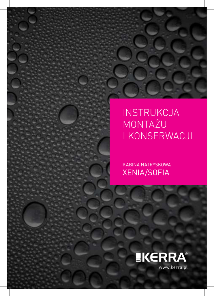INSTRUKCJA MONTAŻU I KONSERWACJI KABINA NATRYSKOWA XENIA/SOFIA www.kerra.pl INSTRUKCJA MONTAŻU KABINY NATRYSKOWEJ XENIA/SOFIA Dziękujemy Państwu za zakup naszego produktu. Przed rozpoczęciem montażu kabiny prosimy o uważne zapoznanie się z instrukcją. Zamieszczone w instrukcji rysunki mają charakter poglądowy (schematyczny). Różnice pomiędzy rysunkami w niniejszej instrukcji, zdjęciami w katalogach i produktami ekspozycyjnymi, a izycznym wyglądem towaru nie mogą być podstawą do reklamacji. Z uwagi na specyikę produktu zalecamy montaż kabiny przez autoryzowany serwis instalacyjny. Aktualną listę autoryzowanych serwisów znajdą Państwo na naszej stronie internetowej www.novoterm.pl lub pod numerem telefonu: 801 144 200 UWAGA! Gdyby zdecydowali się Państwo na samodzielny montaż informujemy, że instalacja hydrauliczna urządzenia bezwzględnie musi zostać wykonana przez wykwaliikowanego hydraulika. Instalacja ta musi zostać wykonana zgodnie z obowiązującymi przepisami i normami Nieprawidłowa instalacja może być przyczyną uszkodzenia kabiny! PRZED INSTALACJĄ UPEWNIJ SIĘ, ŻE: 1. 2. Przygotowany otwór odpływowy ma średnicę 50 mm i dopasowany jest do standardowych redukcji gumowych dostępnych na rynku. Zestaw nie zawiera redukcji. Pomieszczenie, w którym jest zainstalowana kabina ma sprawny i wydajny system wentylacji. 3. Miejsce montażu kabiny ma równą poziomą posadzkę na jednakowym poziomie z pozostałą częścią pomieszczenia, równe pionowe ściany, a kąt między nimi wynosi 90°. Realizacja powyższych wymagań jest konieczna dla prawidłowego montażu kabiny. PARAMETRY TECHNICZNE: Zalecane ciśnienie hydrauliczne: 2 - 4 bar Zalecana temperatura ciepłej wody: 55 - 65°C Zalecana temperatura zimnej wody: 10 - 20°C Wymiary kabiny: Wersja 80: 80 x 80 x 195 cm Wersja 90: 90 x 90 x 195 cm POTRZEBNE NARZĘDZIA: WYKAZ CZĘŚCI: UWAGA: Proszę sprawdzić kompletność produktu niezwłocznie po zakupie. Wszelkie braki i uszkodzenia należy natychmiast zgłosić sprzedawcy. A B G H C D I J E K F 1 2 3 5 4 9 6 7 8 10 symbol nazwa części ilość symbol A wkręt 4 x 30 8 3 szyba boczna 2 B wkręt 4 x 20 8 4 uszczelka piórowa szyby bocznej 2 C wkręt 4 x 12 z małym łbem 4 5 profil poziomy górny 1 D wkręt 10zzdużym dużymłbem łbem wkręt 44 xx12 8 6 uszczelka piórowa szyby drzwiowej 2 E kołek rozporowy 6 x 30 8 7 szyba drzwiowa 2 F rolka górna 4 8 uszczelka magnetyczna 2 G rolka dolna 4 9 profil poziomy dolny 1 H odbojnik 8 10 brodzik 1 I uchwyt szyby 4 J uchwyt drzwi 2 K drenaż 1 1 profil boczny 2 2 uszczelka o przekroju “U” 2 nazwa części ilość UWAGI PRZED MONTAŻEM: Szklane elementy kabiny wykonane są ze szkła bezpiecznego. Konieczne jest zachowanie szczególnej ostrożności przy odpakowywaniu, przenoszeniu i montażu części szklanych. Szyb nie należy stawiać bezpośrednio na podłodze ani opierać ich o ściany. Nie należy ich uderzać ani podważać za pomocą twardych narzędzi. Przed silikonowaniem należy oczyścić wszystkie klejone powierzchnie z zabrudzeń. Po montażu kabiny zaleca się odczekać około 24 godziny na związanie silikonu. Otwory na zestaw odpływowy wykonane w bro- MONTAŻ KABINY: 10 x 1 K x1 dziku są standardowe. W razie konieczności możliwe jest zastosowanie innego zestawu odpływowego niż dołączony w zestawie. UWAGA: Należy sprawdzić wszystkie elementy przed montażem. Nie należy montować kabiny w przypadku stwierdzenia uszkodzeń któregokolwiek z jej elementów! Po zamontowaniu kabiny wszelkie reklamacje z tego tytułu nie zostaną uznane! 1 x2 5 x1 9 x1 B x8 ! Profile poziome górny i dolny są różne. Profil górny ma mniejszy rozstaw otworów na odbojniki niż profil dolny ! 2 x2 3 x2 C x4 I x4 E x8 A x8 7 x2 F x4 G x4 J x2 6 x2 8 x2 4 x2 ! Przed silikonowaniem oczyścić wszystkie klejone powierzchnie! Klej nakładać od wewnętrznej strony kabiny. Po silikonowaniu kabiny zaleca się odczekać 24 godziny na związanie kleju! siliko n UWAGI DOTYCZĄCE BEZPIECZEŃSTWA I UŻYTKOWANIA 1. 2. 3. 4. 5. 6. 7. 8. W kabinie nie można korzystać z urządzeń elektrycznych. Urządzenia takie powinny znajdować się poza zasięgiem osób korzystających z kabiny. Nie pozostawiać w kabinie przedmiotów metalowych. Mogą one korodować. Dzieci muszą korzystać z kabiny pod opieką osób dorosłych. Wszystkie naprawy powinny być wykonywane przez autoryzowany serwis. Kabina jest przeznaczona wyłącznie do niekomercyjnego użytku domowego. Nie należy gwałtownie otwierać lub zamykać drzwi od kabiny. Osoby będące pod wpływem alkoholu lub środków odurzających nie powinny korzystać z kabiny. Nie należy dopuszczać kabiny do kontaktu z wodą o temperaturze powyżej 85°C, otwartym płomieniem lub żarzącymi się przedmiotami. 9. 10. 11. 12. 13. Niedozwolone są nawet najmniejsze zabrudzenia lakierem do paznokci lub lakierem do włosów. Maksymalne obciążenie dna brodzika to 100 kg/0,5 m2. Maksymalne całkowite obciążenie dna kabiny to 150 kg. Z kabiny może jednocześnie korzystać tylko jedna osoba. Nawet w przypadku prawidłowego wypoziomowania kabiny możliwe jest pozostawanie obszarów wody na dnie lub obrzeżach brodzika. Jest to naturalne zjawisko spowodowane napięciem powierzchniowym. Tolerancje wymiarów szyb: grubość - ± 0,3 mm; wypukłość - ± 1 mm; wysokość/szerokość - ± 3 mm. Tolerancje pozostałych wymiarów: dla wymiaru 1000 mm - ±5 mm; dla wymiaru > 1000 mm - ± 10 mm. KONSERWACJA 1. 2. Po każdym użyciu kabinę należy spłukać czystą woda i wytrzeć miękką wilgotną ściereczką. Do czasu całkowitego wyschnięcia należy pozostawić otwarte drzwi kabiny i zapewnić dobrą wentylację pomieszczenia. Użyta ściereczka nie może zawierać włókien o działaniu szorującym lub drapiącym. Powierzchnię kabiny należy czyścić przy użyciu łagodnych detergentów i miękkiej ściereczki. Zalecane jest używanie roztworu mydła w płynie. Po w