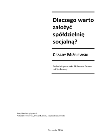 Dlaczego warto założyć spółdzielnię socjalną? CEZARY MIŻEJEWSKI Zachodniopomorska Biblioteka Ekonomii Społecznej Zespół redakcyjny serii: Antoni Sobolewski, Paweł Klimek, Jarema Piekutowski 1 Szczecin 2010 Zachodniopomorska Biblioteka Ekonomii Społecznej Autor: Cezary Miżejewski Zespół redakcyjny serii: Antoni Sobolewski, Paweł Klimek, Jarema Piekutowski Projekt okładki: Krzysztof Drumiński, Code2 Drukarnia: P.P.H.ZAPOL Dmochowski, Sobczyk sp. j. al. Piastów 42 | 71-062 Szczecin Wydawca Stowarzyszenie Czas Przestrzeń Tożsamość www.cpt.org.pl © Wydawca, autorzy. Kopiowanie, cytowanie dozwolone za podaniem źródła. ISBN 978-83-930122-3-7 Publikacja powstała w ramach projektu profesjonalizacja przedsiębiorstw społecznych kluczem do rozwoju ekonomii społecznej finansowanego w ramach Funduszu Inicjatyw Obywatelskich. Realizowanego przez Stowarzyszenie na rzecz spółdzielni socjalnych ul. Ostrówek 15, 61-121 Poznań. Dziękujemy za nieodpłatne udostępnienie publikacji do wydania w ramach Zachodniopomorskiej Biblioteki Ekonomii Społecznej. Wydanie II. Szczecin 2010 Publikacja wydana w ramach środków własnych OWES. 2 Kilka słów wprowadzenia Dużo ostatnio słyszy się o spółdzielniach socjalnych. Uchwalone regulacje prawne, działania promocyjne, możliwości finansowe powinny zachęcać do działań. Z drugiej strony pojawiają się jednak liczne głosy, że spółdzielnie się nie udają, że to bez sensu. Często pojawiają się informacje, że większość spółdzielni socjalnych upada, że urzędnicy nie rozumieją spółdzielców, że uprawnienia są nie takie jakbyśmy oczekiwali. Ogólnie mówiąc: jedno wielkie zamieszanie. Dlatego też należy się zastanowić, dlaczego warto utworzyć spółdzielnię socjalną? Znać wszystkie uwarunkowania i możliwości zanim podejmie się ostateczną decyzję. Najczęstszym błędem, jest tworzenie spółdzielni socjalnych w wyniku „zaciągu” na szkoleniach. Skoro nas namawiają to zróbmy to. Potem zobaczymy, co z tego wyniknie. Niestety takie eksperymenty bardzo rzadko się udają. Spółdzielnia - a spółdzielnia socjalna w szczególności - o czym się przekonamy – to podmiot dający szansę na rozwiązanie wielu problemów, ale jest to również podmiot wymagający posiadania pomysłu na działanie, a przede wszystkim wymagający wzajemnego zaufania. Jeśli jednak podejdziemy do tego poważnie, jeśli będziemy otwarci na społeczność i podmioty działające w naszym środowisku (władze lokalne, organizacje pozarządowe i przedsiębiorców) to sukces jest gwarantowany. Dzisiaj coraz częściej pokazuje się spółdzielnię socjalną, jako wzór do naśladowania. I nie chodzi tu o działalność charytatywną, ale normalne działanie na rynku, na którym w inny sposób ciężko byłoby nam się odnaleźć. Bo nie tylko produkuję jakieś dobro czy usługę, ale są one na tyle dobre, że znajdują się osoby chętne, które chcą je nabyć. Bo dostaję za to wynagrodzenie. Bo jestem tak samo ważny jak każdy inny przedsiębiorca. Bo mam przyjaciół i szanują mnie w mojej gminie czy mieście. Bo znalazłem swoje miejsce w życiu. Bo odzyskałem wiarę w siebie. To oczywiście mogą być tylko hasła, którymi nikt się nie nakarmi. Dlatego warto podejść do sprawy racjonalnie. Spróbujmy, zatem, po kolei zastanowić się, dlaczego warto założyć spółdzielnię socjalną. Dlaczego to może być szansa dla mnie, dla moich znajomych, organizacji czy lokalnego samorządu? 3 1. Bo to zupełnie nowy pomysł na działanie Pierwsze pytanie, jakie sobie zadajemy, to właściwie, dlaczego spółdzielnia socjalna? Tyle jest form prawnych, które powalają coś robić, więc czemu mam wybrać akurat tę formę, która jak wiemy budzi liczne emocje? Dobre pytanie. Warto na nie odpowiedzieć zanim podejmiemy dalsze działania. Spółdzielnia socjalna, jako nowa formuła gospodarowania powstała 1 maja 2004 r. ale był to pomysł jeszcze w powijakach. Tak naprawdę spółdzielnie ruszyły po uchwaleniu ustawy z dnia 27 kwietnia 2006 r. o spółdzielniach socjalnych. A drugi bieg włączyła nowelizacja z 7 maja 2009 r., która wprowadziła szereg korzystnych rozwiązań prawnych, umożliwiając działanie na szerszą skalę. Odmienność pomysłu na działalność w formie spółdzielni socjalnej od pomysłów na prowadzenie działalności w innej formie gospodarowania, polega na prostych zasadach łączących ze sobą zarówno zalety tego, co mogą robić stowarzyszenia, jak również spółdzielnie pracy. Oznacza to, że mogę prowadzić działalność gospodarczą polegającą na tworzeniu jakiegoś produktu: posiłków, bombek choinkowych, stron internetowych, koszulek itp. Mogę realizować również usługi: remonty budowlane, catering, czyli dostarczanie posiłków, szkolić, realizować usługi opiekuńcze czy asystenckie dla osób starszych lub niepełnosprawnych. Pomysłów są tysiące, ale zawsze to normalna działalność gospodarcza. Jednak spółdzielnia socjalna dodatkowo powinna prowadzić działania reintegracyjne na rzecz swoich członków. Będzie jeszcze o tym mowa później. Taka działalność to już nie działalność gospodarcza, a co więcej nadwyżka bilansowa, czyli zysk, który osiągniemy w spółdzielni i przeznaczymy na działania dla członków spółdzielni zmniejszają nam podatek dochodowy, który spółdzielnia powinna zapłacić. Ale to nie wszystko. Spółdzielnia socjalna może prowadzić działalność społeczną i oświatowo-kulturalną na rzecz swoich członków oraz ich środowiska lokalnego i to również nie jest działalność gospodarcza. Możemy zatem kupić i bilety do kina dla naszych członków i ich rodzin, możemy wykupić udział w imprezie lub nawet zorganizować ją dla społeczności lokalnej.. Co więcej spółdzielnia może prowadzić działalność społecznie użyteczną w sferze zadań publicznych określonych w ustawie z dnia 24 kwietn