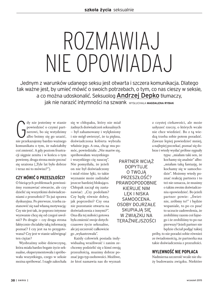 szkoła życia seksualnie Rozmawiaj nie opowiadaj Jednym z warunków udanego seksu jest otwarta i szczera komunikacja. Dlatego tak ważne jest, by umieć mówić o swoich potrzebach, o tym, co nas cieszy w seksie, a co można udoskonalić. Seksuolog Andrzej Depko tłumaczy, jak nie narazić intymności na szwank wysłuchała Magdalena Rybak G dy nie jesteśmy w stanie powiedzieć o czymś partnerowi, bo się wstydzimy albo boimy się go urazić, nie przekazujemy bardzo ważnego komunikatu o tym, że należałoby coś zmienić. A gdy poziom frustracji sięgnie zenitu i w końcu o tym powiemy, druga strona może poczuć się urażona („Tyle lat było dobrze i teraz mi to mówisz?”). Czy mówić o przeszłości? O bieżących problemach powinniśmy rozmawiać otwarcie, ale czy dzielić się wszystkimi doświadczeniami z przeszłości? To już sprawa dyskusyjna. Po pierwsze, trzeba zastanowić się nad własną motywacją: Czy nie jest tak, że poprzez intymne wyzwanie chcę się od czegoś uwolnić? Po drugie – czy druga strona faktycznie chciałaby taką informację poznać? I czy jest na to przygotowana? Czy jest w stanie udźwignąć ten ciężar? Wyobraźmy sobie dziewczynę, która miała bardzo bogate życie seksualne, eksperymentowała i spróbowała wszystkiego, czego w seksie można spróbować. I nagle zakochała 38 | sens | się w chłopaku, który nie miał z czystej ciekawości, ale może żadnych doświadczeń seksualnych usłyszeć rzeczy, o których wcale – był zahamowany i wylękniony nie chce wiedzieć. Bo z tą wiei nie mógł uwierzyć, że ta piękna, dzą trzeba sobie potem poradzić. doświadczona kobieta wybrała Zawsze lepiej powiedzieć mniej, właśnie jego. A ona, chcąc mu poa najlepiej poczekać, poznać się domóc, powiedziała: „Nie martw się, brze i wtedy wysłać próbne sygnały spróbowałam wszystkiego typu: „miałam taki sen, że i wszystkiego cię nauczę”. kochamy się analnie” albo: Partner wciąż Nie pomyślała, że jeżeli „miałam taką fantazję, że dopytuje on nie był doświadczony kochamy się w samochoo twoją i miał różne lęki, to takie dzie”. Możemy wtedy poprzeszłość? wyznanie może zadziałać znać reakcję partnera i to jeszcze bardziej blokująco. Prawdopodobnie też nie oznacza, że musimy Chłopak zaczął się zastao takim swoim doświadczekieruje nim nawiać: „Czy podołam? niu opowiedzieć. Bo jeżeli lęk i niska Czy będę równie dobry, partner powie: „Świetsamoocena. jak poprzedni? Czy ona nie, zróbmy to!” i będzie Osoby dojrzałe nie pozostanie otwarta na wspaniale, to po co psuć skupiają się doświadczenia z innymi?”. to uczucie zadowolenia, że Ona dla tej miłości gotowa zrobiliśmy razem coś fajnew związku na była zmienić swoje dotychgo i że zrobiliśmy to po raz teraźniejszości czasowe życie seksualne, pierwszy? Jeżeli partner nie ale jej szczerość całkowicie będzie chciał podjąć takiej go „wykastrowała”. próby, to nie poradzi sobie również Każdy człowiek posiada indyze świadomością, że partnerka ma takie doświadczenia z przeszłości. widualną wrażliwość i zanim zechcemy podzielić się z kimś swoją przeszłością, musimy dobrze powylewność nie popłaca znać jego typ osobowości. Możliwe, Nadmierna szczerość wcale nie służe ktoś namawia nas do wyznań ży budowaniu związku. Niektóre wrzesień 2015 Jak rozmawiać o seksie w parze? ie przechwalaj się swoimi doświadczeniami, zwłaszcza liczbą partnerów i rozmaitymi N eksperymentami. ie rozmawiaj o przeszłości, dopóki nie poznasz dobrze motywacji drugiej strony. N ie krytykuj i nie rób wyrzutów – jeżeli długo tłumiłaś swoje potrzeby, nie wylewaj nagle N wszystkich żali, bo to uruchomi mechanizmy obronne, które uniemożliwią porozumienie. nikaj postawy roszczeniowej, bo wywoła ona zamknięcie się partnera. U ów jak najwięcej o wspólnych seksualnych radościach, wzmacniając relację z partnerem. M roponujcie nawzajem, co jeszcze radośniejszego możecie razem zrobić: Jak się pieścić? P Gdzie się dotykać? Jakich technik spróbować? 2015 wrzesień osoby domagają się szczegółowych opowieści, a potem zadręczają się swoimi wykreowanymi na tej podstawie wyobrażeniami. Rozpamiętywanie przeszłości nie jest nikomu do niczego potrzebne. Liczy się nasza teraźniejszość. Jeżeli ktoś się domaga od nas takiej szczerości, dobrze jest zbadać jego motywację, zadając pytanie: „Po co ci taka wiedza, skoro najważniejsza jesteś ty tu i teraz? A moje doświadczenia są skromne, bo czekałem na ciebie”. Do przeszłości nie ma powrotu, należy żyć teraźniejszością i przyszłością, a nie rozpamiętywaniem, co każde z nas robiło wtedy, gdy się jeszcze nie znaliśmy. Przykładem na to, jak pragnąc przejrzystości, można zaprzepaścić przyszłość, jest historia pewnej pary. On namówił ją do zwierzeń, a gdy opowiedziała mu o swoim życiu seksualnym, nie mógł sobie poradzić z tym, że jest dwunasty. Gdyby był szósty, toby jej wybaczył. A tak wychodzi, że miała jednego partnera na pół roku i to, jego zdaniem, było za dużo. Jeden na rok byłby do zaakceptowania, więcej nie. Można powiedzieć, że zachował się niedojrzale. Najpierw namawiał na zwierzenia, udając, że ma to służyć budowaniu związku, ale ostatecznie nie chciał poznać partnerki naprawdę, wolał swoje wyobrażenie. Osoby dojrzałe nie są zainteresowane przeszłością, mają silne przekonanie, że spotkały drugiego człowieka w odpowiednim momencie i od tej chwili chcą budować coś razem. Ci mniej dojrzali drążą przeszłość z powodu swoich lęków i niskiej samooceny. na imprezie, po drinku W sprawach seksu lubimy się radzić zaufanych przyjaciół, chcemy polegać na ich doświadczeniu, czasem wydaje się to łatwiejsze niż pójście | sens | 39 do specjalisty. Jednak zdradzanie tajemnic własnej alkowy może obrócić się przeciwko