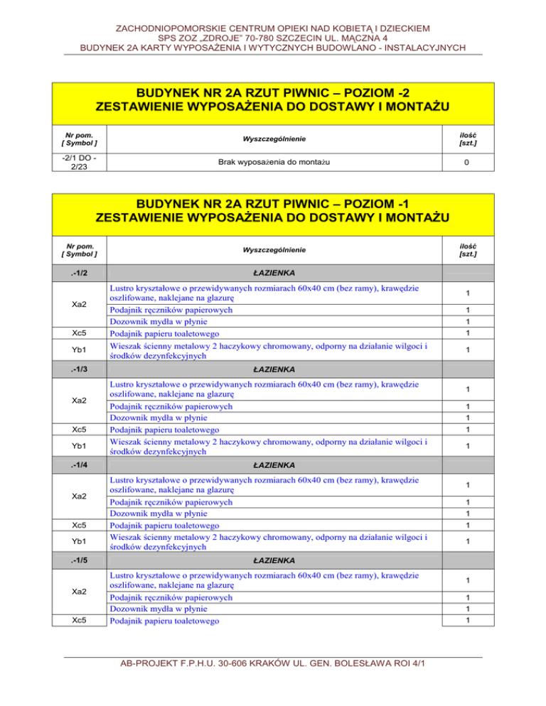 ZACHODNIOPOMORSKIE CENTRUM OPIEKI NAD KOBIETĄ I DZIECKIEM SPS ZOZ „ZDROJE” 70-780 SZCZECIN UL. MĄCZNA 4 BUDYNEK 2A KARTY WYPOSAśENIA I WYTYCZNYCH BUDOWLANO - INSTALACYJNYCH BUDYNEK NR 2A RZUT PIWNIC – POZIOM -2 ZESTAWIENIE WYPOSAśENIA DO DOSTAWY I MONTAśU Nr pom. [ Symbol ] Wyszczególnienie ilość [szt.] -2/1 DO 2/23 Brak wyposaŜenia do montaŜu 0 BUDYNEK NR 2A RZUT PIWNIC – POZIOM -1 ZESTAWIENIE WYPOSAśENIA DO DOSTAWY I MONTAśU Nr pom. [ Symbol ] Wyszczególnienie .-1/2 ŁAZIENKA Xa2 Xc5 Yb1 .-1/3 Xa2 Xc5 Yb1 .-1/4 Xa2 Xc5 Yb1 .-1/5 Xa2 Xc5 Lustro kryształowe o przewidywanych rozmiarach 60x40 cm (bez ramy), krawędzie oszlifowane, naklejane na glazurę Podajnik ręczników papierowych Dozownik mydła w płynie Podajnik papieru toaletowego Wieszak ścienny metalowy 2 haczykowy chromowany, odporny na działanie wilgoci i środków dezynfekcyjnych ilość [szt.] 1 1 1 1 1 ŁAZIENKA Lustro kryształowe o przewidywanych rozmiarach 60x40 cm (bez ramy), krawędzie oszlifowane, naklejane na glazurę Podajnik ręczników papierowych Dozownik mydła w płynie Podajnik papieru toaletowego Wieszak ścienny metalowy 2 haczykowy chromowany, odporny na działanie wilgoci i środków dezynfekcyjnych 1 1 1 1 1 ŁAZIENKA Lustro kryształowe o przewidywanych rozmiarach 60x40 cm (bez ramy), krawędzie oszlifowane, naklejane na glazurę Podajnik ręczników papierowych Dozownik mydła w płynie Podajnik papieru toaletowego Wieszak ścienny metalowy 2 haczykowy chromowany, odporny na działanie wilgoci i środków dezynfekcyjnych 1 1 1 1 1 ŁAZIENKA Lustro kryształowe o przewidywanych rozmiarach 60x40 cm (bez ramy), krawędzie oszlifowane, naklejane na glazurę Podajnik ręczników papierowych Dozownik mydła w płynie Podajnik papieru toaletowego AB-PROJEKT F.P.H.U. 30-606 KRAKÓW UL. GEN. BOLESŁAWA ROI 4/1 1 1 1 1 ZACHODNIOPOMORSKIE CENTRUM OPIEKI NAD KOBIETĄ I DZIECKIEM SPS ZOZ „ZDROJE” 70-780 SZCZECIN UL. MĄCZNA 4 BUDYNEK 2A KARTY WYPOSAśENIA I WYTYCZNYCH BUDOWLANO - INSTALACYJNYCH Yb1 Wieszak ścienny metalowy 2 haczykowy chromowany, odporny na działanie wilgoci i środków dezynfekcyjnych .-1/8 Xa2 Xc5 Yb1 ŁAZIENKA Lustro kryształowe o przewidywanych rozmiarach 60x40 cm (bez ramy), krawędzie oszlifowane, naklejane na glazurę Podajnik ręczników papierowych Dozownik mydła w płynie Podajnik papieru toaletowego Wieszak ścienny metalowy 2 haczykowy chromowany, odporny na działanie wilgoci i środków dezynfekcyjnych .-1/9 Xa2 Xc5 Yb1 Xc5 Yb1 Lustro kryształowe o przewidywanych rozmiarach 60x40 cm (bez ramy), krawędzie oszlifowane, naklejane na glazurę Podajnik ręczników papierowych Dozownik mydła w płynie Podajnik papieru toaletowego Wieszak ścienny metalowy 2 haczykowy chromowany, odporny na działanie wilgoci i środków dezynfekcyjnych Xc5 Yb1 Lustro kryształowe o przewidywanych rozmiarach 60x40 cm (bez ramy), krawędzie oszlifowane, naklejane na glazurę Podajnik ręczników papierowych Dozownik mydła w płynie Podajnik papieru toaletowego Wieszak ścienny metalowy 2 haczykowy chromowany, odporny na działanie wilgoci i środków dezynfekcyjnych Xc5 Yb1 .-1/21 1 1 1 1 1 1 1 1 1 1 1 1 1 ŁAZIENKA Lustro kryształowe o przewidywanych rozmiarach 60x40 cm (bez ramy), krawędzie oszlifowane, naklejane na glazurę Podajnik ręczników papierowych Dozownik mydła w płynie Podajnik papieru toaletowego Wieszak ścienny metalowy 2 haczykowy chromowany, odporny na działanie wilgoci i środków dezynfekcyjnych .-1/17 Xa2 1 ŁAZIENKA .-1/11 Xa2 1 ŁAZIENKA .-1/10 Xa2 1 1 1 1 1 1 ŁAZIENKA Lustro kryształowe o przewidywanych rozmiarach 60x40 cm (bez ramy), krawędzie oszlifowane, naklejane na glazurę Podajnik ręczników papierowych Dozownik mydła w płynie Podajnik papieru toaletowego Wieszak ścienny metalowy 2 haczykowy chromowany, odporny na działanie wilgoci i środków dezynfekcyjnych POMIESZCZENIE STACJI UZDATNIANIA WODY Stacja uzdatniania wody Producent: ………………………………………………………………………….. Nazwa i typ: ………………………………………………………………………… Rok produkcji: 2014 AB-PROJEKT F.P.H.U. 30-606 KRAKÓW UL. GEN. BOLESŁAWA ROI 4/1 1 1 1 1 1 ZACHODNIOPOMORSKIE CENTRUM OPIEKI NAD KOBIETĄ I DZIECKIEM SPS ZOZ „ZDROJE” 70-780 SZCZECIN UL. MĄCZNA 4 BUDYNEK 2A KARTY WYPOSAśENIA I WYTYCZNYCH BUDOWLANO - INSTALACYJNYCH WYMAGANIA DOTYCZĄCE WYPOSAśENIA STACJI UZDATNIANIA WODY Stacja uzdatniania wody metodą odwróconej osmozy Zabezpieczająca prawidłowe funkcjonowanie urządzeń Centralnej Sterylizacji oraz Komory dezynfekcyjnej w stacji łóŜek; dodatkowo 300 dm3 na dobę wody demineralizowanej dla pozostałych uŜytkowników Filtr zanieczyszczeń mechanicznych powyŜej 5µm; Zmiękczacz wody minimum 2-kolumnowy sterowany elektronicznie, zapewniający dostawę wody zmiękczonej dla: myjni narzędziowych, pomp próŜniowych sterylizatorów, komory dezynfekcyjnej; Filtr węglowy, Urządzenie odwróconej osmozy z pomiarem przewodności produkowanej wody i układem płukania membran (minimum 300 litrów/h), Sterowanie elektroniczne; System podnoszenia ciśnienia dla wody po odwróconej osmozie z pompą cyrkulacyjną oraz lampą bakteriobójczą UV Pompa cyrkulacyjna ze stali kwasoodpornej; Ciśnienie rozprowadzanej wody 3,5 bar lub większe; Zbiornik magazynowy wody demineralizowanej zapewniający optymalne warunki pracy osmozera oraz pokrycie szczytowych poborów wraz z pływakowym układem czujników poziomu wody w zbiorniku, przelewem i filtrem oddechowym (minimum 800 litrów); Gwarantowana przewodność wody uzdatnionej – nie przekraczająca 5 µS/cm; WYMAGANIA DOTYCZĄCE INSTALACJI WODY DO STACJI UZDATNIANIA WODY ORAZ ZE STACJI DO URZĄDZEŃ Do stacji wody naleŜy przewidzieć zasilanie w wodę zimną o ciśnieniu minimum 4,5 bar o wydajności dobranej do oferowanej technologii. Ze stacji naleŜy dokonać rozprowadzenia wody i podłączenia: Woda zimna zmiękczona 