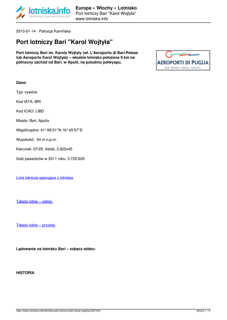 Europa » Włochy » Lotnisko Port lotniczy Bari "Karol Wojtyła" www.lotniska.info 2013-01-14 - Patrycja Kamińska Port lotniczy Bari "Karol Wojtyła" Port lotniczy Bari im. Karola Wojtyły (wł. L'Aeroporto di Bari-Palese lub Aeroporto Karol Wojtyła) – włoskie lotnisko położone 9 km na północny zachód od Bari, w Apulii, na południu półwyspu. Dane: Typ: cywilne Kod IATA: BRI Kod ICAO: LIBD Miasto: Bari, Apulia Współrzędne: 41°08′21″N 16°45′57″E Wysokość: 54 m n.p.m. Kierunek: 07/25: Asfalt, 2.820x45 Ilość pasażerów w 2011 roku: 3.725.629 Linie lotnicze operujące z lotniska Tabela lotów – odloty Tabela lotów – przyloty Lądowanie na lotnisku Bari – zobacz wideo: HISTORIA http://www.lotniska.info/lotnisko,port-lotniczy-bari-karol-wojtyla,203.html strona 1 / 4 Europa » Włochy » Lotnisko Port lotniczy Bari "Karol Wojtyła" www.lotniska.info Port lotniczy Bari "Karol Wojtyła" to główne lotnisko południowego włoskiego regionu Apulia. Port obsługuje nie tylko prowincję Bari, ale też provincia di Barletta-Andria-Trani, provincia di Matera, a także część provincia di Foggia, provincia di Taranto oraz provincia di Potenza. Dawniej lotnisko znane było jako Aeroporto Bari-Palese gdyż zbudowane zostało w pobliżu dzielnicy Palese. Port lotniczy Bari powstał w 1914 roku jako lotnisko wyłącznie o charakterze wojskowym. Jednak już w 1919 roku lotnisko otwiera się także na loty cywilne i tworzą się pierwsze połączenia lotnicze łączące Bari z Rzymem, Zurichem, Genewą, Anconą i Wenecją. Pierwsze loty obsługiwane są przez linie lotnicze Ala Littoria, które używają włoskich samolotów, jednak wraz ze wprowadzeniem Air France na lotnisko Bari, konieczna jest budowa nowego pasu startowego. W między czasie część wojskowa nie przestaje służyć jako terminal pasażerski. DOJAZD Autobus AMTAB BUS nr 16 (centrum Bari - lotnisko): rokład jazdy – od 5.00 do 21.30 czas podróży – ok.30-45 minut Przystanki - via Capitaneo, via Ranieri, via Diaz, Viale Europa, Via B. Buozzi, Via crispi, Via Piccinni, Via Q.Sella, Corso Italia. Cena biletu: € 0.90 Strona internetowa: http://www.amtab.it/ Taxi http://www.lotniska.info/lotnisko,port-lotniczy-bari-karol-wojtyla,203.html strona 2 / 4 Europa » Włochy » Lotnisko Port lotniczy Bari "Karol Wojtyła" www.lotniska.info NUOVA CO.TA.BA Società cooperativa Radiotaxi tel. 080 5543333 Strona internetowa: http://www.taxibari.it APULIA TAXI Radiotaxi satellitare tel. 080 5346666 Strona internetowa: http://www.apuliataxi.it Wynajem samochodu MAGGIORE RENT Booking tel. 199 151 120 Bookings from outside Italy +39 06 22 45 60 60 Sito Web: maggiore.it AVIS AUTONOLEGGIO Booking tel. 199 100 133 - 080 531 61 68 Sito Web: avisautonoleggio.it HERTZ AUTONOLEGGIO Booking tel. 199 112 211 - 080 531 61 71 Sito Web: herts.it AUTO EUROPA SICILY BY CAR Booking tel. 800 334 440 - 080 537 58 35 Sito web: autoeuropa.it EUROPCAR ITALIA SPA Booking Tel. 199 307 030 Sito web: europcar.it ZODIAC ITALIA SPA Booking tel. 080 538 02 52 - 080 531 10 78 199 856 856 RENT & SERVICES SRL Booking tel. 080 537 78 46 http://www.rent-and-services.it/ LOCAUTO rent S.p.A. Centro Prenotazioni 800 833 328 Tel. +39 080 537 89 95 http://www.lotniska.info/lotnisko,port-lotniczy-bari-karol-wojtyla,203.html strona 3 / 4 Europa » Włochy » Lotnisko Port lotniczy Bari "Karol Wojtyła" www.lotniska.info www.locautorent.com SIXT RENT A CAR tel: +39 080 537 08 42 sito web: http://www.sixt.it Strona internetowa lotniska: http://www.aeroportidipuglia.it/default.asp?idlingua=2&idcontenuto=25 http://www.lotniska.info/lotnisko,port-lotniczy-bari-karol-wojtyla,203.html http://www.lotniska.info/lotnisko,port-lotniczy-bari-karol-wojtyla,203.html Powered by TCPDF (www.tcpdf.org) strona 4 / 4