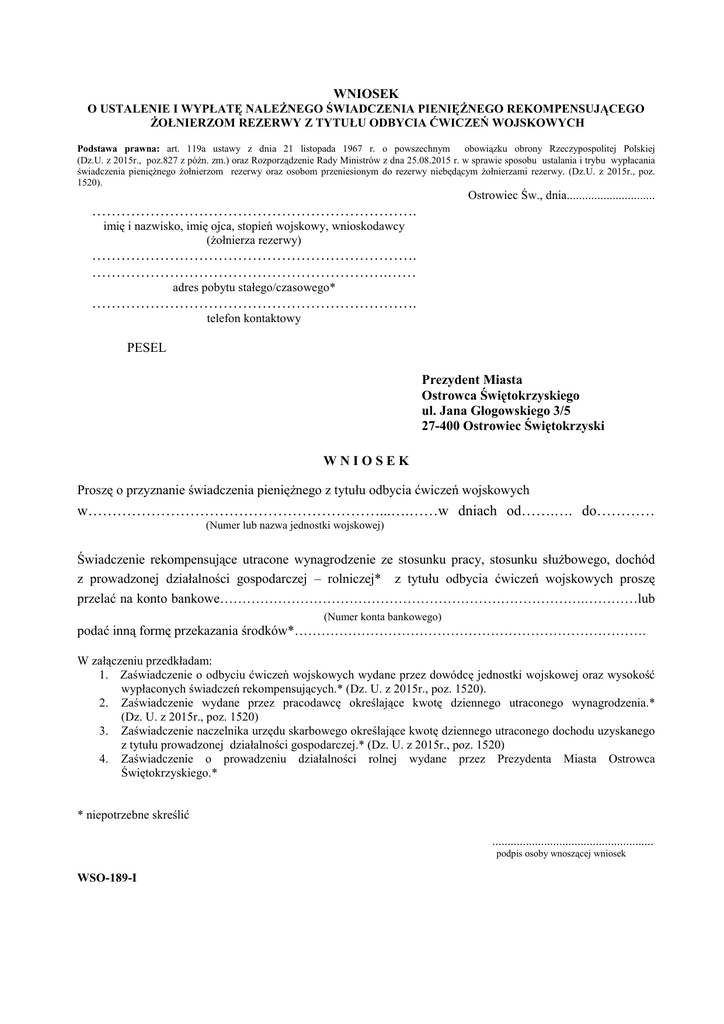 WNIOSEK O USTALENIE I WYPŁATĘ NALEśNEGO ŚWIADCZENIA PIENIĘśNEGO REKOMPENSUJĄCEGO śOŁNIERZOM REZERWY Z TYTUŁU ODBYCIA ĆWICZEŃ WOJSKOWYCH Podstawa prawna: art. 119a ustawy z dnia 21 listopada 1967 r. o powszechnym obowiązku obrony Rzeczypospolitej Polskiej (Dz.U. z 2015r., poz.827 z późn. zm.) oraz Rozporządzenie Rady Ministrów z dna 25.08.2015 r. w sprawie sposobu ustalania i trybu wypłacania świadczenia pienięŜnego Ŝołnierzom rezerwy oraz osobom przeniesionym do rezerwy niebędącym Ŝołnierzami rezerwy. (Dz.U. z 2015r., poz. 1520). Ostrowiec Św., dnia............................. …………………………………………………………. imię i nazwisko, imię ojca, stopień wojskowy, wnioskodawcy (Ŝołnierza rezerwy) …………………………………………………………. …………………………………………………….…… adres pobytu stałego/czasowego* …………………………………………………………. telefon kontaktowy PESEL Prezydent Miasta Ostrowca Świętokrzyskiego ul. Jana Głogowskiego 3/5 27-400 Ostrowiec Świętokrzyski WNIOSEK Proszę o przyznanie świadczenia pienięŜnego z tytułu odbycia ćwiczeń wojskowych w……………………………………………………...….……w dniach od…….…. do………… (Numer lub nazwa jednostki wojskowej) Świadczenie rekompensujące utracone wynagrodzenie ze stosunku pracy, stosunku słuŜbowego, dochód z prowadzonej działalności gospodarczej – rolniczej* z tytułu odbycia ćwiczeń wojskowych proszę przelać na konto bankowe……………………………………………………………………….…………lub (Numer konta bankowego) podać inną formę przekazania środków*……………………………………………………………………. W załączeniu przedkładam: 1. Zaświadczenie o odbyciu ćwiczeń wojskowych wydane przez dowódcę jednostki wojskowej oraz wysokość wypłaconych świadczeń rekompensujących.* (Dz. U. z 2015r., poz. 1520). 2. Zaświadczenie wydane przez pracodawcę określające kwotę dziennego utraconego wynagrodzenia.* (Dz. U. z 2015r., poz. 1520) 3. Zaświadczenie naczelnika urzędu skarbowego określające kwotę dziennego utraconego dochodu uzyskanego z tytułu prowadzonej działalności gospodarczej.* (Dz. U. z 2015r., poz. 1520) 4. Zaświadczenie o prowadzeniu działalności rolnej wydane przez Prezydenta Miasta Ostrowca Świętokrzyskiego.* * niepotrzebne skreślić ..................................................... podpis osoby wnoszącej wniosek WSO-189-I