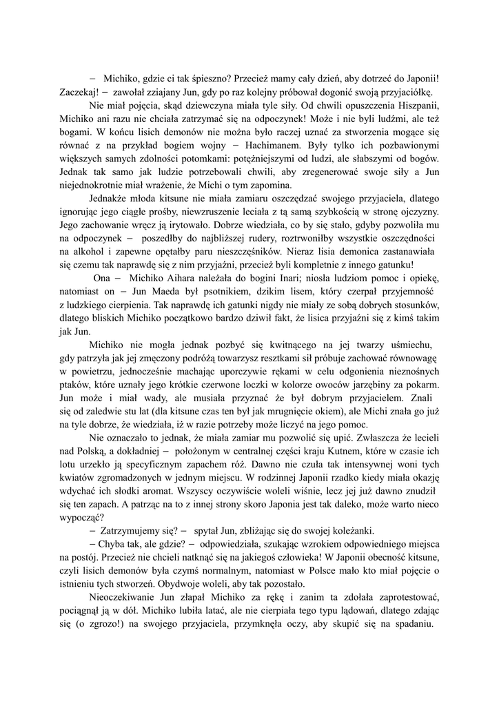 – Michiko, gdzie ci tak śpieszno? Przecież mamy cały dzień, aby dotrzeć do Japonii! Zaczekaj! – zawołał zziajany Jun, gdy po raz kolejny próbował dogonić swoją przyjaciółkę. Nie miał pojęcia, skąd dziewczyna miała tyle siły. Od chwili opuszczenia Hiszpanii, Michiko ani razu nie chciała zatrzymać się na odpoczynek! Może i nie byli ludźmi, ale też bogami. W końcu lisich demonów nie można było raczej uznać za stworzenia mogące się równać z na przykład bogiem wojny – Hachimanem. Były tylko ich pozbawionymi większych samych zdolności potomkami: potężniejszymi od ludzi, ale słabszymi od bogów. Jednak tak samo jak ludzie potrzebowali chwili, aby zregenerować swoje siły a Jun niejednokrotnie miał wrażenie, że Michi o tym zapomina. Jednakże młoda kitsune nie miała zamiaru oszczędzać swojego przyjaciela, dlatego ignorując jego ciągłe prośby, niewzruszenie leciała z tą samą szybkością w stronę ojczyzny. Jego zachowanie wręcz ją irytowało. Dobrze wiedziała, co by się stało, gdyby pozwoliła mu na odpoczynek – poszedłby do najbliższej rudery, roztrwoniłby wszystkie oszczędności na alkohol i zapewne opętałby paru nieszczęśników. Nieraz lisia demonica zastanawiała się czemu tak naprawdę się z nim przyjaźni, przecież byli kompletnie z innego gatunku! Ona – Michiko Aihara należała do bogini Inari; niosła ludziom pomoc i opiekę, natomiast on – Jun Maeda był psotnikiem, dzikim lisem, który czerpał przyjemność z ludzkiego cierpienia. Tak naprawdę ich gatunki nigdy nie miały ze sobą dobrych stosunków, dlatego bliskich Michiko początkowo bardzo dziwił fakt, że lisica przyjaźni się z kimś takim jak Jun. Michiko nie mogła jednak pozbyć się kwitnącego na jej twarzy uśmiechu, gdy patrzyła jak jej zmęczony podróżą towarzysz resztkami sił próbuje zachować równowagę w powietrzu, jednocześnie machając uporczywie rękami w celu odgonienia nieznośnych ptaków, które uznały jego krótkie czerwone loczki w kolorze owoców jarzębiny za pokarm. Jun może i miał wady, ale musiała przyznać że był dobrym przyjacielem. Znali się od zaledwie stu lat (dla kitsune czas ten był jak mrugnięcie okiem), ale Michi znała go już na tyle dobrze, że wiedziała, iż w razie potrzeby może liczyć na jego pomoc. Nie oznaczało to jednak, że miała zamiar mu pozwolić się upić. Zwłaszcza że lecieli nad Polską, a dokładniej – położonym w centralnej części kraju Kutnem, które w czasie ich lotu urzekło ją specyficznym zapachem róż. Dawno nie czuła tak intensywnej woni tych kwiatów zgromadzonych w jednym miejscu. W rodzinnej Japonii rzadko kiedy miała okazję wdychać ich słodki aromat. Wszyscy oczywiście woleli wiśnie, lecz jej już dawno znudził się ten zapach. A patrząc na to z innej strony skoro Japonia jest tak daleko, może warto nieco wypocząć? – Zatrzymujemy się? – spytał Jun, zbliżając się do swojej koleżanki. – Chyba tak, ale gdzie? – odpowiedziała, szukając wzrokiem odpowiedniego miejsca na postój. Przecież nie chcieli natknąć się na jakiegoś człowieka! W Japonii obecność kitsune, czyli lisich demonów była czymś normalnym, natomiast w Polsce mało kto miał pojęcie o istnieniu tych stworzeń. Obydwoje woleli, aby tak pozostało. Nieoczekiwanie Jun złapał Michiko za rękę i zanim ta zdołała zaprotestować, pociągnął ją w dół. Michiko lubiła latać, ale nie cierpiała tego typu lądowań, dlatego zdając się (o zgrozo!) na swojego przyjaciela, przymknęła oczy, aby skupić się na spadaniu. Nie znosiła, gdy powietrze brutalnie wciskało się do jej ust, nosa czy uszu a wiedziała, że Jun nie usłyszy (a przynajmniej będzie udawał) jej protestów. Poza tym nie było już czasu na przemyślenia, ponieważ już po chwili Michiko zderzyła się z czymś twardym i niemalże zawisła w powietrzu. Zdezorientowana, dopiero potem zrozumiała, że leży na jednej z rozłożystych gałęzi jakiegoś drzewa, a Jun wolną ręką trzyma jej dłoń, aby nie straciła równowagi. Dziewczyna nieoczekiwanie nabrała ochoty, aby zbesztać swojego przyjaciela za to lądowanie, lecz nie mogła z siebie wydusić ani słowa. Obraz przed jej oczami rozmywał się, a żołądek błagał o litość. Jun delikatnie odsunął na bok zbłąkane kosmyki i przyjrzał jej się z troską wymalowaną na twarzy: – Hej, w porządku? – Poza tym, że czuję w ustach smak salsy i wiszę na drzewie, to wspaniale! – warknęła, próbując się podnieść. W końcu opierając się na uścisku przyjaciela, wygodniej usadowiła się między gałęziami i odsunęła warkocz śnieżnobiałych włosów na bok. – Nie będziesz chyba wymiotować, co nie? – spytał, dyskretnie odsuwając się od przyjaciółki. – Nie, jest dobrze, chociaż mogłeś mnie ostrzec – powiedziała z wyrzutem. – Przepraszam – posłał jej jeden z tych swoich czarujących uśmiechów na którego widok Michiko potrafiła się zwykle rozweselić. ,,Prawdziwy z niego psotnik’’, pomyślała – Hej a tak w ogóle to gdzie my jesteśmy? – Spójrz tam – pokazała mu na zbierający się niedaleko nich tłum ludzi. Przybysze właśnie w tym momencie uzmysłowili sobie, że siedzą na jednym z wielu drzew, rozmieszczonych wzdłuż wygładzonej betonowej ścieżki po której stąpali zbierający się licznie przechodnie. Niektórzy stłoczeni w grupach, rozmawiali między sobą podniesionymi głosami, inni w milczeniu przyglądali się drzewom pyszniącym się kolorowymi kwiatami a kolejni z uśmiechami na ustach nieśli w rękach dziwaczne paczuszki, owinięte żółtawą folią. Pod nogami lisich demonów przewinęli się ludzie młodsi i starsi – istny zbiór osobowości a wszyscy gromadzili się przy samych bokach ścieżki, jakby w oczekiwaniu na kogoś lub coś. – Co oni będą robić? – spytał Jun, poruszając swoimi wielkimi lisimi uszami. Zapewne chciał pods
