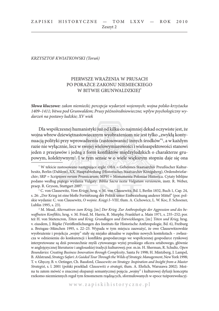 ZAPISKI HISTORYCZNE — TOM Zeszyt 2 LXXV — ROK 2010 KRZYSZTOF KWIATKOWSKI (Toruń) PIERWSZE WRAŻENIA W PRUSACH PO PORAŻCE ZAKONU NIEMIECKIEGO W BITWIE GRUNWALDZKIEJ* Słowa kluczowe: zakon niemiecki; percepcja wydarzeń wojennych; wojna polsko-krzyżacka 1409–1411; bitwa pod Grunwaldem; Prusy późnośredniowieczne; wpływ psychologiczny wydarzeń na postawy ludzkie; XV wiek Dla współczesnej humanistyki już od kilku co najmniej dekad oczywiste jest, że wojna wbrew dziewiętnastowiecznym wyobrażeniom nie jest tylko „zwykłą kontynuacją polityki przy wprowadzeniu (zastosowaniu) innych środków”1, a w każdym razie nie wyłącznie, lecz w swojej wielowymiarowości i wieloaspektowości stanowi jeden z przejawów i jedną z form konfliktów międzyludzkich o charakterze grupowym, kolektywnym2. I w tym sensie w o wiele większym stopniu daje się ona * W tekście zastosowano następujące sygle: OBA = Geheimes Staatsarchiv Preußischer Kulturbesitz, Berlin (Dahlem), XX. Hauptabteilung (Historisches Staatsarchiv Königsberg), Ordensbriefarchiv; SRP = Scriptores rerum Prussicarum; MPH = Monumenta Poloniae Historica. Cytaty biblijne podano według piątego wydania Vulgaty: Biblia Sacra iuxta Vulgatam versionem, instr. R. Weber, praep. R. Gryson, Stuttgart 2007. 1 C. von Clausewitz, Vom Kriege, hrsg. v. M. von Clausewitz, Bd. I, Berlin 1832, Buch 1, Cap. 24, s. 26: „Der Krieg ist eine bloße Fortsetzung der Politik unter Einbeziehung anderer Mittel” (por. polskie wydanie: C. von Clausewitz, O wojnie. Księgi I–VIII, tłum. A. Cichowicz, L. W. Koc, F. Schoener, Lublin 1995, s. 23). 2 M. Mead, Alternativen zum Krieg, [in:] Der Krieg. Zur Anthropologie der Aggression und des bewaffneten Konflikts, hrsg. v. M. Fried, M. Harris, R. Murphy, Frankfurt a. Main 1971, s. 235–252; por. też H. von Stietencron, Töten und Krieg. Grundlagen und Entwicklungen, [in:] Töten und Krieg, hrsg. v. eiusdem, J. Rüpke (Veröffentlichungen des Instituts für Historische Anthropologie, Bd. 6), Freiburg a. Breisgau–München 1995, s. 22–23. Wypada w tym miejscu zauważyć, że owe Clausewitzowskie wyobrażenie i projekcja „wojny” stały się niejako aktualne w zupełnie nowych kontekstach – zwłaszcza w odniesieniu do konkurencji i konfliktu gospodarczego we współczesnej gospodarce rynkowej interpretowane są dziś powszechnie myśli cytowanego wyżej pruskiego oficera sztabowego, głównie w anglojęzycznej literaturze i anglosaskiej tradycji kulturowej; por. m.in. H. Sherman, R. Schultz, Open Boundaries: Creating Business Innovation through Complexity, Santa Fe 1998; H. Mintzberg, J. Lampel, B. Ahlstrand, Strategy Safari: A Guided Tour Through the Wilds of Strategic Management, New York 1998; T. v. Ghyczy, B. v. Oetinger, Ch. Bassford, Clausewitz on Strategy: Inspiration and Insight from a Master Strategist, s. l. 2001 (polski przekład: Clausewitz o strategii, tłum. A. Ehrlich, Warszawa 2002). Można tu zatem mówić o znacznej ekspansji semantycznej pojęcia „wojny” i kulturowej dyfuzji konceptu rzekomo niezmiennych reguł tym fenomenem rządzących, sformułowanych w epoce tużporewolucyj- w w w. z a p i s k i h i s t o r y c z n e . p l 48 K r z y s z t o f Kw i a t k o w s k i [222] zrozumieć dopiero ujmowana i pojmowana jako jeden z elementów, czynników i zarazem determinantów kultury3 – a więc jako fenomen ogólnokulturowy4. Mediewistyka europejska ów kulturowy aspekt zjawiska „wojny” „odkryła” i skonceptualizowała nieco wcześniej5 aniżeli badacze zajmujący się czasami późniejszymi, zdobywszy tym samym bogate instrumentarium różnorodnych humanistycznych kategorii analitycznych umożliwiających spojrzenie na „wojnę” i „konflikt” bardziej w dążeniu do Blochowskiego „rozumienia” aniżeli „wiedzenia”6. I to należy uznać za jej dużą zdobycz w pierwszych kilku dekadach po drugiej wojnie światowej, dostrzegając zarazem niebagatelny wpływ mentalny humanistycznego doświadczenia tego kataklizmu na sposób pojmowania omawianych zjawisk7. nej. Oczywiście obok tego funkcjonuje nadal „standardowa” refleksja teoretyczno-wojskowa operująca Clausewitzowskimi kategoriami; por. np. T. Will, Operative Führung. Versuch einer begrifflichen Bestimmung im Rahmen von Clausewitz’ Theorie „Vom Kriege”, Hamburg 1997; R. Beck, Clausewitz’ Kriegslehre in unserer Zeit, Allgemeine Schweizerische Militärzeitschrift, Bd. 146: 1980, s. 272–276; R. Brühl, Zur militärtheoretischen Leistung Carl von Clausewitz, Militärgeschichte, Bd. 19: 1980, s. 389–401; zaś w Polsce choćby studium M. A. Falińskiego: Aktualność myśli Carla von Clausewitza, Warszawa 1991. 3 O. G. Oexle, Geschichte als historische Kulturwissenschaft, [in:] Kulturgeschichte heute, hrsg. v. W. Hardtwig, H.-U. Wehler (Geschichte und Gesellschaft, Sonderheft 16), Göttingen 1996, s. 14–40. 4 Chodzi tu o kierunek zupełnie przeciwny w stosunku do owego „anglosaskiego”, mianowicie nie o transpozycję kategorii militarnych na inne przestrzenie działalności człowieka (np. gospodarcze), ale o dostrzeżenie niemilitarnych przejawów i uwarunkowań fenomenu „wojny”, czyli o potraktowanie wojny nie tylko jako zbioru fizycznych, zbiorowych zazwyczaj aktów przemocy dokonywanych przy użyciu intencjonalnie wykonanych narzędzi (broni) i warunkowanych traktowanymi fundamentalnie (tudzież uniwersalnie) regułami pojmowanymi jako obiektywne przesłanki osiągnięcia sukcesu (= zamierzonego celu), ale właśnie jako zjawiska o wiele bardziej złożonego, przynależącego do kultury w ogólności, a więc do wszystkich jej przejawów – co z dużym sukcesem zaproponowała humanistyka kręgu niemieckojęzycznego; por. m.in. T. V. Trotha, Zur Soziologie der Gewalt, [in:] Soziologie der Gewalt (Kölner Zeitschrift für Soziologie und Sozialpsychologie, Sonderhefte, H. 37), Wiesbaden 1997, s. 9–56. 5 Poglądowo w tej kwestii por. H.-H. Kortüm, Der Krieg im Mittelal