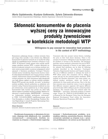 MiR_Marketing w praktyce.qxd 2014-10-03 21:20 Page 27 Marketing w praktyce Marta Sajdakowska, Krystyna Gutkowska, Sylwia Żakowska-Biemans Szkoła Główna Gospodarstwa Wiejskiego, Katedra Organizacji i Ekonomiki Konsumpcji Skłonność konsumentów do płacenia wyższej ceny za innowacyjne produkty żywnościowe w kontekście metodologii WTP Willingness to pay concept for innovative food products in the context of WTP methodology Konsumenci, podejmując decyzję o wyborze żywności, biorą pod uwagę różne czynniki, w tym również cenę. Skłonność konsumentów do płacenia wyższych cen za wyroby lub usługi określa się angielskojęzycznym terminem willingness to pay (WTP). W literaturze zostały opisane różne metody umożliwiające określenie poziomu WTP, a pomiar skłonności nabywców do płacenia wyższych cen za wybrane atrybuty żywności można przeprowadzić za pomocą następujących metod opisanych w literaturze przedmiotu: Contingent Valuation (metoda wyceny warunkowej), Experimental Auctions (metoda aukcji eksperymentalnych) oraz Conjoint Analysis (analiza conjoint). Zastosowanie różnych metod WTP umożliwia oszacowanie poziomów cen, które konsumenci będą akceptowali oraz będą skłonni zapłacić za wybrane atrybuty produktu. Metoda WTP pozwala więc określić, „ile warte” są określone atrybuty produktu, których pozbawione są substytuty tych towarów i usług. Ponieważ konsumencka wrażliwość na cenę jest zróżnicowana, można spodziewać się, że różne segmenty konsumentów będą wyrażać inny poziom cen, które będą skłonni zapłacić za pożądane atrybuty produktu. Badania zrealizowano w ramach projektu „BIOŻYWNOŚĆ — innowacyjne, funkcjonalne produkty pochodzenia zwierzęcego” nr POIG. 01.01.02-014-090/09 współfinansowanego przez Unię Europejską ze środków Europejskiego Funduszu Rozwoju Regionalnego w ramach Programu Operacyjnego Innowacyjna Gospodarka 2007–2013. Consumers take into account various factors, including the price in their food choice decisions. There is the concept of consumers' willingness to pay the higher prices for products or services in the literature. The literature describes various methods to determine the level of WTP. Measurement propensity of buyers to pay higher prices for selected food attributes can be done by following methods described in the literature: Contingent Valuation, Experimental Auctions and Conjoint Analysis. The use of different methods to estimate the levels of WTP allows prices that consumers will be willing to accept and pay for the selected product attributes. WTP method can therefore determine "how many points" are defined product attributes, which are devoid of substitutes for those goods and services. Due to the fact that consumer price sensitivity varies, it can be expected that different consumer segments will express different price levels that will be willing to pay for a desired product attributes. The research study was realized under the "BIOFOOD — innovative, functional products of animal origin" Project No. POIG.01.01.02-014-090/09 that was co-financed by the European Union from the European Regional Development Fund within the Innovative Economy Operational Programme 2007–2013. Słowa kluczowe Keywords konsument, skłonność do płacenia wyższej ceny (WTP). consumer, willingness to pay (WTP). Oczekiwania konsumenta w odniesieniu do żywności, obejmują wiele składowych, tzw. czynników wewnętrznych i zewnętrznych. Atrybuty wewnętrzne są związane z właściwościami organolep- tycznymi i fizykochemicznymi produktu, m.in. smakiem, teksturą, zawartością tłuszczu. Atrybuty zewnętrzne natomiast są związane m.in. z procesem produkcyjnym i nie zawsze są one fizycznie do- MARKETING I RYNEK 10/2014 27 MiR_Marketing w praktyce.qxd 2014-10-03 21:20 Page 28 Marketing w praktyce strzegalne w produkcie końcowym, np. trudno stwierdzić na podstawie wyglądu produktu, czy został on wytworzony metodami ekologicznymi, czy na bazie surowców pochodzących od zwierząt gospodarskich utrzymanych w odpowiednich warunkach z zachowaniem ich dobrostanu (Grunert, Bredahl i Brunso, 2004). Czynniki zewnętrzne odnoszą się też do takich aspektów produktu, jak np. rodzaj sklepu, w którym dokonano zakupu, możliwość egzekwowania roszczeń lub należnych konsumentom praw, cena. W procesie podejmowania decyzji nabywczych cena jest ważną determinantą, a jej ważność zauważa się zwłaszcza w przypadku innowacyjnych produktów żywnościowych (Gutkowska, Żakowska-Biemans i Sajdakowska, 2008). W literaturze termin „skłonność do płacenia wyższej ceny” (willingness to pay, WTP) jest określany jako maksymalna cena, którą dany nabywca jest skłonny zapłacić, aby kupić określoną ilość produktu (Wertenbroch i Skiera, 2002). Koncepcja WTP ma duże znaczenie m.in. w rozwoju i wprowadzaniu nowych produktów na rynek. Metody służące ocenie poziomów WTP stosowano do różnych rodzajów żywności, w tym również do badania postaw konsumentów wobec żywności funkcjonalnej, jak też do innowacyjnych odmian dotychczas istniejących na rynku produktów żywnościowych oraz w przypadku żywności o charakterze luksusowym, np. wina (Combris i in., 2009). Również konsumenci nabywający „żywność o wyjątkowym charakterze” (speciality foods) częściej wskazywali wyższy poziom WTP niż osoby kupujące produkty standardowe (Batte i in., 2007). W celu rozpoznania poziomu skłonności do płacenia wyższych cen za innowacyjne atrybuty żywności — zgodnie z istotą projektu „Biożywność — innowacyjne, funkcjonalne produkty pochodzenia zwierzęcego”, współfinansowanego przez Unię Europejską ze środków Europejskiego Funduszu Rozwoju Regionalnego w ramach programu operacyjnego Innowacyjna Gospodarka — przeprowadzono analizę literatury przedmiotu w zakresie koncepcji oraz wykorzystania technik umożliwiających oszacowanie WT
