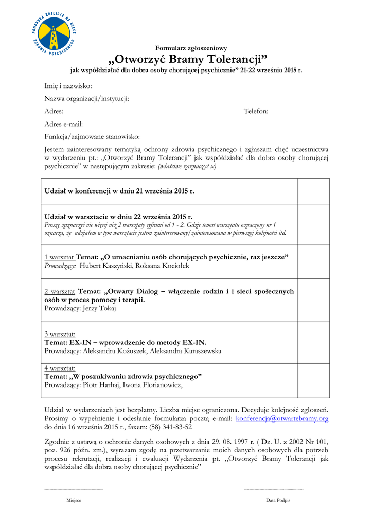 Formularz zgłoszeniowy „Otworzyć Bramy Tolerancji” jak współdziałać dla dobra osoby chorującej psychicznie” 21-22 września 2015 r. Imię i nazwisko: Nazwa organizacji/instytucji: Adres: Telefon: Adres e-mail: Funkcja/zajmowane stanowisko: Jestem zainteresowany tematyką ochrony zdrowia psychicznego i zgłaszam chęć uczestnictwa w wydarzeniu pt.: „Otworzyć Bramy Tolerancji” jak współdziałać dla dobra osoby chorującej psychicznie” w następującym zakresie: (właściwe zaznaczyć x) Udział w konferencji w dniu 21 września 2015 r. Udział w warsztacie w dniu 22 września 2015 r. Proszę zaznaczyć nie więcej niż 2 warsztaty cyframi od 1 - 2. Gdzie temat warsztatu oznaczony nr 1 oznacza, że udziałem w tym warsztacie jestem zainteresowany/zainteresowana w pierwszej kolejności itd. 1 warsztat Temat: „O umacnianiu osób chorujących psychicznie, raz jeszcze” Prowadzący: Hubert Kaszyński, Roksana Kociołek 2 warsztat Temat: „Otwarty Dialog – włączenie rodzin i i sieci społecznych osób w proces pomocy i terapii. Prowadzący: Jerzy Tokaj 3 warsztat: Temat: EX-IN – wprowadzenie do metody EX-IN. Prowadzący: Aleksandra Kożuszek, Aleksandra Karaszewska 4 warsztat: Temat: „W poszukiwaniu zdrowia psychicznego” Prowadzący: Piotr Harhaj, Iwona Florianowicz, Udział w wydarzeniach jest bezpłatny. Liczba miejsc ograniczona. Decyduje kolejność zgłoszeń. Prosimy o wypełnienie i odesłanie formularza pocztą e-mail: [email protected] do dnia 16 września 2015 r., faxem: (58) 341-83-52 Zgodnie z ustawą o ochronie danych osobowych z dnia 29. 08. 1997 r. ( Dz. U. z 2002 Nr 101, poz. 926 późn. zm.), wyrażam zgodę na przetwarzanie moich danych osobowych dla potrzeb procesu rekrutacji, realizacji i ewaluacji Wydarzenia pt. „Otworzyć Bramy Tolerancji jak współdziałać dla dobra osoby chorującej psychicznie” ………………………………………………………….. Miejsce …………………………………............................ Data Podpis