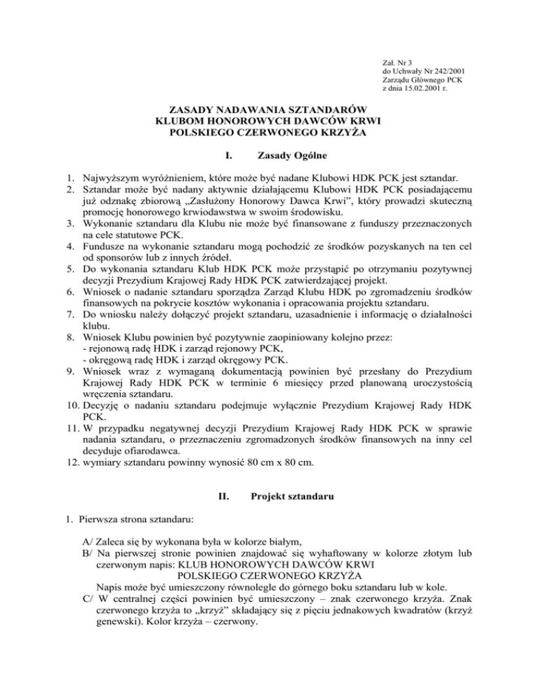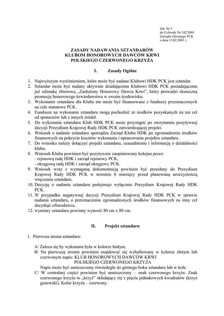 Zał. Nr 3 do Uchwały Nr 242/2001 Zarządu Głównego PCK z dnia 15.02.2001 r. ZASADY NADAWANIA SZTANDARÓW KLUBOM HONOROWYCH DAWCÓW KRWI POLSKIEGO CZERWONEGO KRZYŻA I. Zasady Ogólne 1. Najwyższym wyróżnieniem, które może być nadane Klubowi HDK PCK jest sztandar. 2. Sztandar może być nadany aktywnie działającemu Klubowi HDK PCK posiadającemu już odznakę zbiorową „Zasłużony Honorowy Dawca Krwi”, który prowadzi skuteczną promocję honorowego krwiodawstwa w swoim środowisku. 3. Wykonanie sztandaru dla Klubu nie może być finansowane z funduszy przeznaczonych na cele statutowe PCK. 4. Fundusze na wykonanie sztandaru mogą pochodzić ze środków pozyskanych na ten cel od sponsorów lub z innych źródeł. 5. Do wykonania sztandaru Klub HDK PCK może przystąpić po otrzymaniu pozytywnej decyzji Prezydium Krajowej Rady HDK PCK zatwierdzającej projekt. 6. Wniosek o nadanie sztandaru sporządza Zarząd Klubu HDK po zgromadzeniu środków finansowych na pokrycie kosztów wykonania i opracowania projektu sztandaru. 7. Do wniosku należy dołączyć projekt sztandaru, uzasadnienie i informację o działalności klubu. 8. Wniosek Klubu powinien być pozytywnie zaopiniowany kolejno przez: - rejonową radę HDK i zarząd rejonowy PCK, - okręgową radę HDK i zarząd okręgowy PCK. 9. Wniosek wraz z wymaganą dokumentacją powinien być przesłany do Prezydium Krajowej Rady HDK PCK w terminie 6 miesięcy przed planowaną uroczystością wręczenia sztandaru. 10. Decyzję o nadaniu sztandaru podejmuje wyłącznie Prezydium Krajowej Rady HDK PCK. 11. W przypadku negatywnej decyzji Prezydium Krajowej Rady HDK PCK w sprawie nadania sztandaru, o przeznaczeniu zgromadzonych środków finansowych na inny cel decyduje ofiarodawca. 12. wymiary sztandaru powinny wynosić 80 cm x 80 cm. II. Projekt sztandaru 1. Pierwsza strona sztandaru: A/ Zaleca się by wykonana była w kolorze białym, B/ Na pierwszej stronie powinien znajdować się wyhaftowany w kolorze złotym lub czerwonym napis: KLUB HONOROWYCH DAWCÓW KRWI POLSKIEGO CZERWONEGO KRZYŻA Napis może być umieszczony równolegle do górnego boku sztandaru lub w kole. C/ W centralnej części powinien być umieszczony – znak czerwonego krzyża. Znak czerwonego krzyża to „krzyż” składający się z pięciu jednakowych kwadratów (krzyż genewski). Kolor krzyża – czerwony. D/ W dolnej części na pierwszej stronie należy umieścić napis informujący przy jakiej instytucji, zakładzie pracy, miejscowości działa Klub. Nazwy te muszą być umieszczone w pełnym brzmieniu. W żadnym wypadku nie mogą być umieszczane skróty. 1. Druga strona sztandaru: A/ Druga strona sztandaru może mieć kolory różne lub zestawienie dwóch, trzech kolorów, B/ na drugiej stronie może być wyhaftowane logo klubu, wizerunek patrona klubu, herb miasta lub logo zakładu pracy. Umieszczenie herbu miasta lub logo zakładu pracy wymaga pisemnej zgody władz miasta lub dyrekcji zakładu pracy. Na drugiej stronie Mogą być umieszczone napisy informujące o imieniu Klubu lub hasło promujące honorowe krwiodawstwo. Mogą być umieszczone daty powstania klubu, ufundowania sztandaru itp. 2. Głowica sztandaru: - Głowica sztandaru zwieńczająca drzewce może być wykonana w formie znaku czerwonego krzyża lub logo klubu. - Na drzewcu przy głowicy może być umieszczona, zawiązana na kokardę, szarfa w kolorach białym i czerwonym, na której umieszcza się odznaczenia. Niniejsze zasady wchodzą w życie z dniem ich zatwierdzenia przez Zarząd Główny PCK.