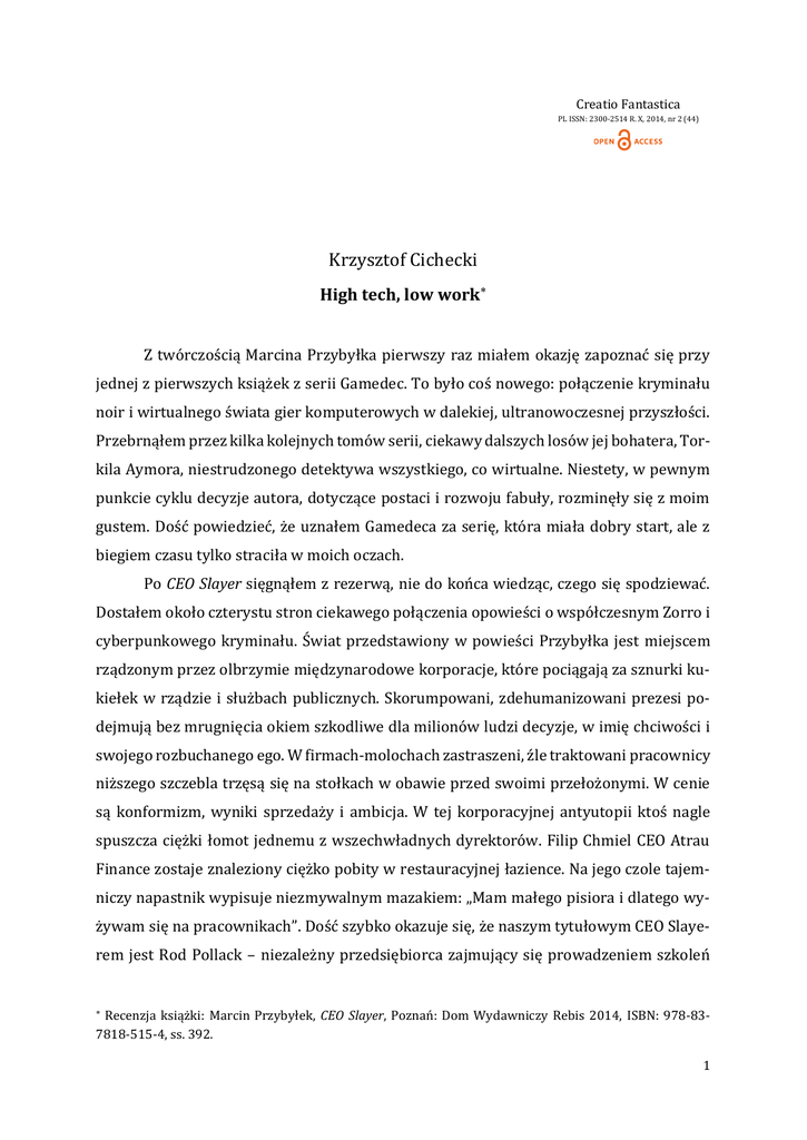 Creatio Fantastica PL ISSN: 2300-2514 R. X, 2014, nr 2 (44) Krzysztof Cichecki High tech, low work Z twórczością Marcina Przybyłka pierwszy raz miałem okazję zapoznać się przy jednej z pierwszych książek z serii Gamedec. To było coś nowego: połączenie kryminału noir i wirtualnego świata gier komputerowych w dalekiej, ultranowoczesnej przyszłości. Przebrnąłem przez kilka kolejnych tomów serii, ciekawy dalszych losów jej bohatera, Torkila Aymora, niestrudzonego detektywa wszystkiego, co wirtualne. Niestety, w pewnym punkcie cyklu decyzje autora, dotyczące postaci i rozwoju fabuły, rozminęły się z moim gustem. Dość powiedzieć, że uznałem Gamedeca za serię, która miała dobry start, ale z biegiem czasu tylko straciła w moich oczach. Po CEO Slayer sięgnąłem z rezerwą, nie do końca wiedząc, czego się spodziewać. Dostałem około czterystu stron ciekawego połączenia opowieści o współczesnym Zorro i cyberpunkowego kryminału. Świat przedstawiony w powieści Przybyłka jest miejscem rządzonym przez olbrzymie międzynarodowe korporacje, które pociągają za sznurki kukiełek w rządzie i służbach publicznych. Skorumpowani, zdehumanizowani prezesi podejmują bez mrugnięcia okiem szkodliwe dla milionów ludzi decyzje, w imię chciwości i swojego rozbuchanego ego. W firmach-molochach zastraszeni, źle traktowani pracownicy niższego szczebla trzęsą się na stołkach w obawie przed swoimi przełożonymi. W cenie są konformizm, wyniki sprzedaży i ambicja. W tej korporacyjnej antyutopii ktoś nagle spuszcza ciężki łomot jednemu z wszechwładnych dyrektorów. Filip Chmiel CEO Atrau Finance zostaje znaleziony ciężko pobity w restauracyjnej łazience. Na jego czole tajemniczy napastnik wypisuje niezmywalnym mazakiem: „Mam małego pisiora i dlatego wyżywam się na pracownikach”. Dość szybko okazuje się, że naszym tytułowym CEO Slayerem jest Rod Pollack – niezależny przedsiębiorca zajmujący się prowadzeniem szkoleń Recenzja książki: Marcin Przybyłek, CEO Slayer, Poznań: Dom Wydawniczy Rebis 2014, ISBN: 978-837818-515-4, ss. 392. 1 dla pracowników dużych firm. Rod jest dziwnym połączeniem profesjonalisty i ideowca. Swoją krucjatę przeciwko skorumpowanemu kierownictwu firm korporacji traktuje jako wymierzanie sprawiedliwości osobom, które w ten lub inny sposób uprzykrzają życie swojemu otoczeniu lub podejmują krzywdzące decyzje, nie zważając na interes słabszych bądź mniej uprzywilejowanych. Z drugiej jednak strony, swoje zamiary egzekwuje z precyzją i przygotowaniem godnym komandosa. Miarka się oczywiście w końcu przebiera. Po piętach Roda zaczynają deptać policja i piękna, wynajęta przez upokorzonych dyrektorów pani detektyw Agnieszka Madey. Książka zrobiła na mnie dobre wrażenie. Czyta się ją płynnie, nie ma w niej przestojów ani momentów mniej ważnych. Czytelnik odnosi wrażenie, że autor zważył każde zdanie i pozostawił tylko te konieczne dla utrzymania sensu i ciągłości powieści. Warstwa futurystyczna jest ciekawa, a technologia nagrywania własnych snów czy niesamowicie zawansowanego interfejsu, nakładanego – nomen omen – na twarz użytkownika, daje wrażenie świata przyszłości, który jest jednocześnie bliski i daleki od naszego. CEO Slayer jest drugą książką z serii wydawniczej Horyzont Zdarzeń. Gorąco ją polecam wszystkim fanom twórczości Marcina Przybyłka oraz fanom trochę niedowartościowanego w Polsce gatunku, jakim jest cyberpunk. 2