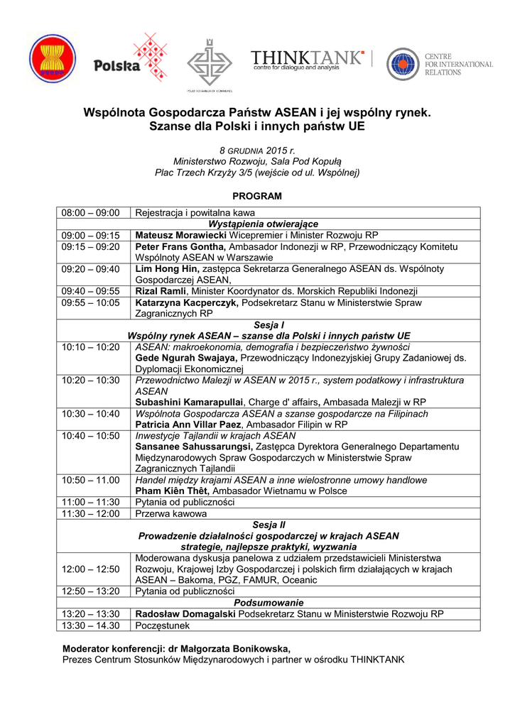 Wspólnota Gospodarcza Państw ASEAN i jej wspólny rynek. Szanse dla Polski i innych państw UE 8 GRUDNIA 2015 r. Ministerstwo Rozwoju, Sala Pod Kopułą Plac Trzech Krzyży 3/5 (wejście od ul. Wspólnej) PROGRAM 08:00 – 09:00 09:00 – 09:15 09:15 – 09:20 09:20 – 09:40 09:40 – 09:55 09:55 – 10:05 10:10 – 10:20 10:20 – 10:30 10:30 – 10:40 10:40 – 10:50 10:50 – 11.00 11:00 – 11:30 11:30 – 12:00 12:00 – 12:50 12:50 – 13:20 13:20 – 13:30 13:30 – 14.30 Rejestracja i powitalna kawa Wystąpienia otwierające Mateusz Morawiecki Wicepremier i Minister Rozwoju RP Peter Frans Gontha, Ambasador Indonezji w RP, Przewodniczący Komitetu Wspólnoty ASEAN w Warszawie Lim Hong Hin, zastępca Sekretarza Generalnego ASEAN ds. Wspólnoty Gospodarczej ASEAN, Rizal Ramli, Minister Koordynator ds. Morskich Republiki Indonezji Katarzyna Kacperczyk, Podsekretarz Stanu w Ministerstwie Spraw Zagranicznych RP Sesja I Wspólny rynek ASEAN – szanse dla Polski i innych państw UE ASEAN: makroekonomia, demografia i bezpieczeństwo żywności Gede Ngurah Swajaya, Przewodniczący Indonezyjskiej Grupy Zadaniowej ds. Dyplomacji Ekonomicznej Przewodnictwo Malezji w ASEAN w 2015 r., system podatkowy i infrastruktura ASEAN Subashini Kamarapullai, Charge d' affairs, Ambasada Malezji w RP Wspólnota Gospodarcza ASEAN a szanse gospodarcze na Filipinach Patricia Ann Villar Paez, Ambasador Filipin w RP Inwestycje Tajlandii w krajach ASEAN Sansanee Sahussarungsi, Zastępca Dyrektora Generalnego Departamentu Międzynarodowych Spraw Gospodarczych w Ministerstwie Spraw Zagranicznych Tajlandii Handel między krajami ASEAN a inne wielostronne umowy handlowe Pham Kiên Thêt, Ambasador Wietnamu w Polsce Pytania od publiczności Przerwa kawowa Sesja II Prowadzenie działalności gospodarczej w krajach ASEAN strategie, najlepsze praktyki, wyzwania Moderowana dyskusja panelowa z udziałem przedstawicieli Ministerstwa Rozwoju, Krajowej Izby Gospodarczej i polskich firm działających w krajach ASEAN – Bakoma, PGZ, FAMUR, Oceanic Pytania od publiczności Podsumowanie Radosław Domagalski Podsekretarz Stanu w Ministerstwie Rozwoju RP Poczęstunek Moderator konferencji: dr Małgorzata Bonikowska, Prezes Centrum Stosunków Międzynarodowych i partner w ośrodku THINKTANK