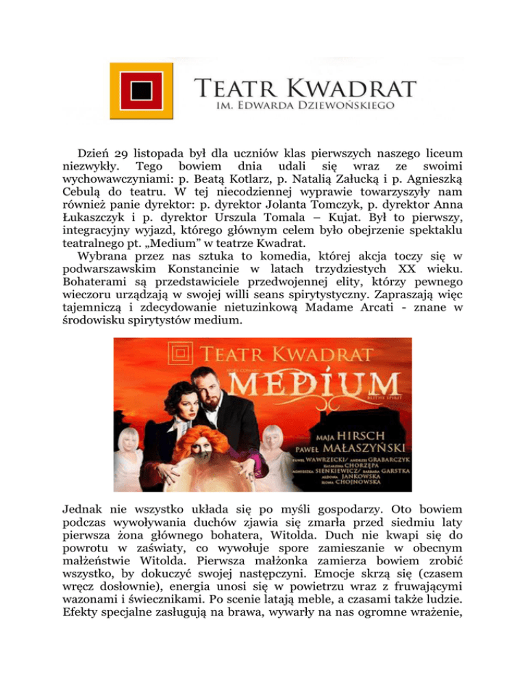 Dzień 29 listopada był dla uczniów klas pierwszych naszego liceum niezwykły. Tego bowiem dnia udali się wraz ze swoimi wychowawczyniami: p. Beatą Kotlarz, p. Natalią Załucką i p. Agnieszką Cebulą do teatru. W tej niecodziennej wyprawie towarzyszyły nam również panie dyrektor: p. dyrektor Jolanta Tomczyk, p. dyrektor Anna Łukaszczyk i p. dyrektor Urszula Tomala – Kujat. Był to pierwszy, integracyjny wyjazd, którego głównym celem było obejrzenie spektaklu teatralnego pt. „Medium” w teatrze Kwadrat. Wybrana przez nas sztuka to komedia, której akcja toczy się w podwarszawskim Konstancinie w latach trzydziestych XX wieku. Bohaterami są przedstawiciele przedwojennej elity, którzy pewnego wieczoru urządzają w swojej willi seans spirytystyczny. Zapraszają więc tajemniczą i zdecydowanie nietuzinkową Madame Arcati - znane w środowisku spirytystów medium. Jednak nie wszystko układa się po myśli gospodarzy. Oto bowiem podczas wywoływania duchów zjawia się zmarła przed siedmiu laty pierwsza żona głównego bohatera, Witolda. Duch nie kwapi się do powrotu w zaświaty, co wywołuje spore zamieszanie w obecnym małżeństwie Witolda. Pierwsza małżonka zamierza bowiem zrobić wszystko, by dokuczyć swojej następczyni. Emocje skrzą się (czasem wręcz dosłownie), energia unosi się w powietrzu wraz z fruwającymi wazonami i świecznikami. Po scenie latają meble, a czasami także ludzie. Efekty specjalne zasługują na brawa, wywarły na nas ogromne wrażenie, a nawet przestraszyły (w końcu był to spektakl o duchach). Mieliśmy także okazję podziwiać znakomitą grę aktorską Pawła Małaszyńskiego, Mai Hirsch czy Andrzeja Grabarczyka – aktorów znanych z ekranów telewizyjnych i kinowych, których mogliśmy zobaczyć na żywo. Niezwykłego smaku dodały przedstawieniu projekcje fragmentów przedwojennych filmów i dokumentów, z cudownymi piosenkami w tle. Wszystkie te elementy sprawiły, że spektakl był interesujący, tajemniczy, śmieszny a miejscami straszny. W teatrze spędziliśmy naprawdę niezwykły wieczór z duchami. W drodze powrotnej wstąpiliśmy jeszcze do Mc Donaldsa, gdzie zjedliśmy późną kolację. Następnie w doskonałych humorach wróciliśmy do Mogielnicy, tam oczekiwali już na nas rodzice. Uczniowie i wychowawcy klas pierwszych LO