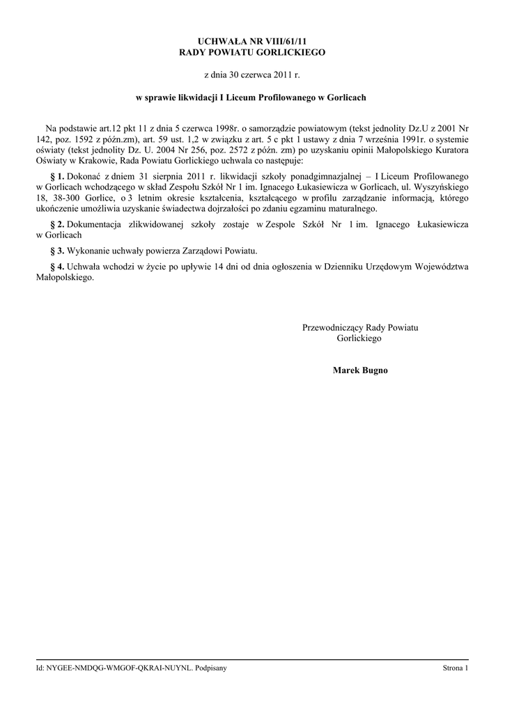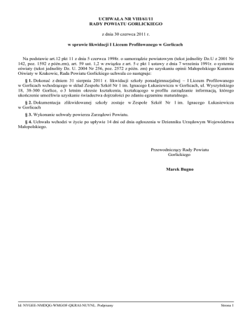 UCHWAŁA NR VIII/61/11 RADY POWIATU GORLICKIEGO z dnia 30 czerwca 2011 r. w sprawie likwidacji I Liceum Profilowanego w Gorlicach Na podstawie art.12 pkt 11 z dnia 5 czerwca 1998r. o samorządzie powiatowym (tekst jednolity Dz.U z 2001 Nr 142, poz. 1592 z późn.zm), art. 59 ust. 1,2 w związku z art. 5 c pkt 1 ustawy z dnia 7 września 1991r. o systemie oświaty (tekst jednolity Dz. U. 2004 Nr 256, poz. 2572 z późn. zm) po uzyskaniu opinii Małopolskiego Kuratora Oświaty w Krakowie, Rada Powiatu Gorlickiego uchwala co następuje: § 1. Dokonać z dniem 31 sierpnia 2011 r. likwidacji szkoły ponadgimnazjalnej – I Liceum Profilowanego w Gorlicach wchodzącego w skład Zespołu Szkół Nr 1 im. Ignacego Łukasiewicza w Gorlicach, ul. Wyszyńskiego 18, 38-300 Gorlice, o 3 letnim okresie kształcenia, kształcącego w profilu zarządzanie informacją, którego ukończenie umożliwia uzyskanie świadectwa dojrzałości po zdaniu egzaminu maturalnego. § 2. Dokumentacja zlikwidowanej szkoły zostaje w Zespole Szkół Nr 1 im. Ignacego Łukasiewicza w Gorlicach § 3. Wykonanie uchwały powierza Zarządowi Powiatu. § 4. Uchwała wchodzi w życie po upływie 14 dni od dnia ogłoszenia w Dzienniku Urzędowym Województwa Małopolskiego. Przewodniczący Rady Powiatu Gorlickiego Marek Bugno Id: NYGEE-NMDQG-WMGOF-QKRAI-NUYNL. Podpisany Strona 1
