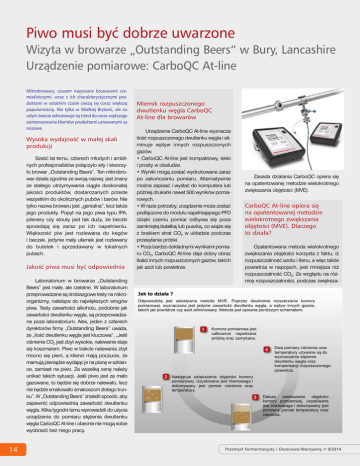 ::: Customer Portrait Piwo musi być dobrze uwarzone Wizyta w browarzeZasada Outstanding Beers“ w Bury, Lancashire działania CarboQC opiera się na opatentowanej metodzie “ ::: Customer Portrait wielokrotnego zwiększania objętości Urządzenie pomiarowe: CarboQC At-line (MVE). Mikrobrowary, czasem nazywane browarami rzeCarboQC At-line opiera się na mieślniczymi, wraz z ich charakterystycznymi proopatentowanej metodzie duktami w ostatnim czasie cieszą się coraz większą Miernik rozpuszczonego wielokrotnego zwiększania popularnością. Nie tylko w Wielkiej Brytanii, ale na dwutlenku węgla CarboQC objętości (MVE). Dlaczego to całym świecie odnotowuje się trend do coraz większego At-line dla browarów dziala ? Wizyta w browarze “Outstanding Beers“ w Bury, zainteresowania klientów produktami uznawanymi za Lancashire Opatentowana metoda niszowe. Urządzeniezwiększania CarboQC At-line wyznacza wielokrotnego objętości ilość rozpuszczonego dwutlenku węgla i elikorzysta z faktu, iż rozpuszczalność Wysoka wydajność w małej skali Urządzenie pomiarowe: minuje wpływ innych rozpuszczonych azotu i tlenu, a więc także powietrza produkcji gazów. w napojach jest niższa niż CarboQC At-line Sześć lat temu, czterech młodych i ambit- rozpuszczalność • CarboQC At-lineCO jest2.kompaktowy, lekki nych profesjonalistów połączyło siły i stworzy- Zei prosty w obsłudze. względu na różnicę ło browar „Outstanding Beers”. Ten mikrobro- rozpuszczalności, • Wyniki mogą zostać wydrukowane zaraz podczas Zasada działania CarboQC opiera się war działa zgodnie ze swoją nazwą: jest znany po zakończeniu Alternatywnie typu IPA,pomiaru. pilsnery czy stouty jest tak pieniądze wydając je na pianę w Mikrobrowary, czasem nazywane zwiększania objętości komory na opatentowanej metodzie wielokrotnego duży, że beczki sprzedają się zaraz po szklance zamiast na piwo. Powinno browarami rzemieślniczymi wraz z ich Małe browary dają większą ciśnienie ze stałego utrzymywania ciągle doskonałej pomiarowej, można zapisać i wysłać powietrza do komputera lub ich napełnieniu. się za wszelką cenę unikać takich charakterystycznymi produktami w zwiększania objętości (MVE). elastyczność zmniejsza się znacznie niż jakości produktów, dostarczanych przede później drukarki nawet 500bardziej wyników pomiasytuacji. Jeśli piwo jest za mało ostatnim czasie cieszą się coraz Większość piwa jest rozlewana do COrowych. . gazowane to będzie się je dobrze większa popularnością. Nie tylko wszystkim do okolicznych pubów i barów. Nie 2w Spośród piw produkowanych przez kegów i beczek, jedynie mały ułamek nalewało,At-line lecz nieopiera będzie smakowało Wielkiej Brytanii, ale na całym świecie jest rozlewany do butelek i “Outstanding Beers“ znajdziemy takie tylko nazwa browaru jest „genialna”, lecz także Różnica • W raziepomiędzy potrzeby, urządzenie może zostać CarboQC się ciśnieniem smakoszom złotego trunku." odnotowuje się trend do coraz sprzedawany w lokalnych pubach. „3.9“ 3.9 % extra pale, Czerwone jego produkty. Popyt na jego piwa typu IPA, klientów podłączonei do modułu napełniającego opatentowanej metodzie równowagi wynikami temperaturyPFD jakna większego zainteresowania “Outstanding znalazło sposób Jakość piwa musi byćsię odpowiednia 4.4wielokrotnego %, Blond 4.5Beers“ %,White 5 %, IPA, produktami za niszowe. jestdzięki mierzona dla dwóch objętości pilsnery czy stouty jest tak uznawanymi duży, że beczki czemu pomiar odbywa poza zwiększania aby zapewnić odpowiednią zawartość Laboratorium w browarze “Outstanding stout, Imperial IPA, Pilsner i Four 4 %. pomiarowej. Jest ona wiąże się Wysoka w małejkomory skali dwutlenku węgla.Dlaczego Kilka tygodni temu, sprzedają się zaraz powydajność ich napełnieniu. zamkniętą butelką lub puszką, co objętości (MVE). Beers“ jest małe, ale porządne. W Nic dziwnego, produkcji wprowadziliże do ilość użyciaróżnorodnych urządzenie do używana do określania ilości Większość piw jest rozlewana do kegów z brakiemlaboratorium strat CO2 w przeprowadzane układzie podczas to pomiaru działa? stężenia dwutlenku węgla są produkowanych piw zmienia się w Sześć lat temu, czterech młodych i rozpuszczonego powietrza drobiazgowe testy naoraz mikroorganizmy, i beczek, jedynie ambitnych mały ułamek jest rozlewany przesyłania próbki. CarboQC At-line i obecnie nie mogą profesjonalistów połączyło od zapotrzebowania rynku. przeliczana i wyrównana. jedne z największych wrogów piwa.zależności sobie wyobrazićmetoda pracy bez niego. do butelek i sprzedawany lokalnych • Poza bardzo dokładnymi wynikami pomiaOpatentowana wielokrotnego siły i stworzyło w browar “Outstanding Testy zawartości alkoholu podobnie jak Możliwe jest również sezonowe Beers“. Ten mikrobrowar działa Wynikiem jest wartość stężenia CO pubach. ru CO2, CarboQC At-line daje dobry obraz zwiększania objętości z faktu, iż zawartości dwutlenku węgla są 2 za to zaspokajanie potrzebkorzysta klientów, jak na zgodnie ze swoją nazwą: Jestwon przeprowadzane laboratorium. Miernik rozpuszczonego napoju niezależna od poza ilości innych rozpuszczonych gazów, takich rozpuszczalność azotu i tlenu, a więc także przykład piwo Halloween łączące znany z utrzymywania ciągle, dwutlenku węgla CarboQC At-line Alex, jeden z czterech firmy azotu, tlenudyrektorów lub doskonałej jakości produktówrozpuszczonego Jakość piwa musi być odpowiednia jak azot lub powietrze. powietrza w napojach, jest mniejsza niż uwielbianą jakość “Outstanding Beers“ dla browarów “Outstanding Beers“ uważa, że "Ilość powietrza. dostarczanych przede wszystkim do dwutlenku węgla jest kluczowa". "Jeśli z nutą cynamonu, melasy i imbiru. rozpuszczalność CO . Ze względu na róż2 Urządzenie CarboQC At-line okolicznych pubów i barów. Nie 