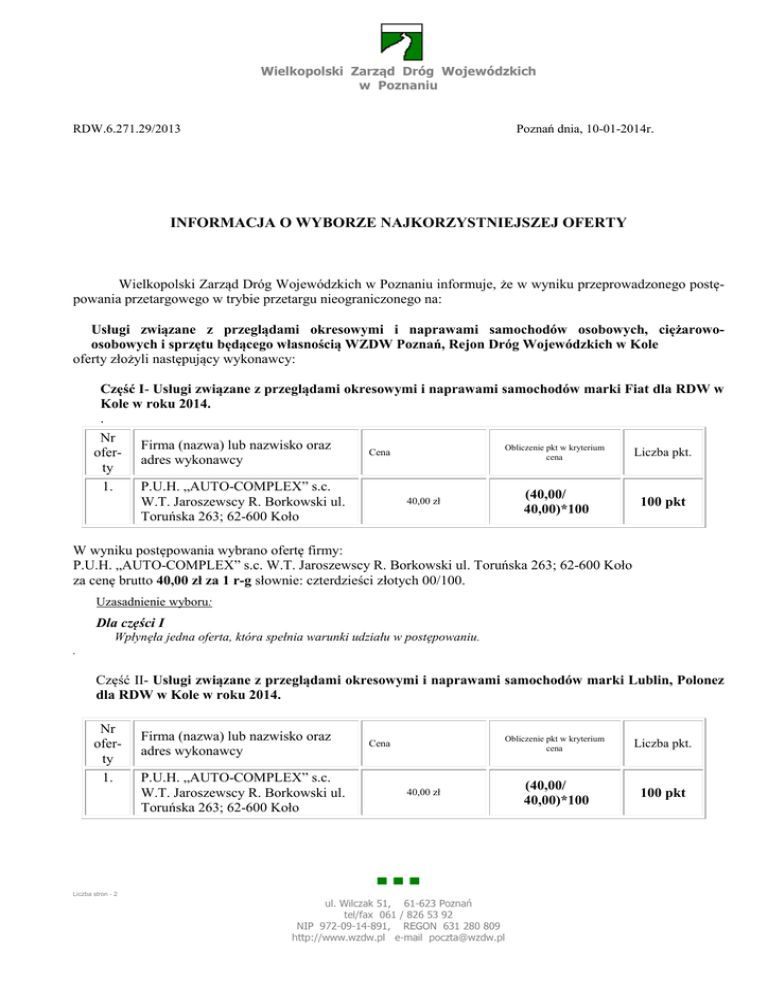 Wielkopolski Zarząd Dróg Wojewódzkich w Poznaniu RDW.6.271.29/2013 Poznań dnia, 10-01-2014r. INFORMACJA O WYBORZE NAJKORZYSTNIEJSZEJ OFERTY Wielkopolski Zarząd Dróg Wojewódzkich w Poznaniu informuje, że w wyniku przeprowadzonego postępowania przetargowego w trybie przetargu nieograniczonego na: Usługi związane z przeglądami okresowymi i naprawami samochodów osobowych, ciężarowoosobowych i sprzętu będącego własnością WZDW Poznań, Rejon Dróg Wojewódzkich w Kole oferty złożyli następujący wykonawcy: Część I- Usługi związane z przeglądami okresowymi i naprawami samochodów marki Fiat dla RDW w Kole w roku 2014. . Nr Firma (nazwa) lub nazwisko oraz Obliczenie pkt w kryterium Cena Liczba pkt. ofercena adres wykonawcy ty 1. P.U.H. „AUTO-COMPLEX” s.c. (40,00/ 40,00 zł W.T. Jaroszewscy R. Borkowski ul. 100 pkt 40,00)*100 Toruńska 263; 62-600 Koło W wyniku postępowania wybrano ofertę firmy: P.U.H. „AUTO-COMPLEX” s.c. W.T. Jaroszewscy R. Borkowski ul. Toruńska 263; 62-600 Koło za cenę brutto 40,00 zł za 1 r-g słownie: czterdzieści złotych 00/100. Uzasadnienie wyboru: Dla części I Wpłynęła jedna oferta, która spełnia warunki udziału w postępowaniu. . Część II- Usługi związane z przeglądami okresowymi i naprawami samochodów marki Lublin, Polonez dla RDW w Kole w roku 2014. Nr oferty 1. Liczba stron - 2 Firma (nazwa) lub nazwisko oraz adres wykonawcy P.U.H. „AUTO-COMPLEX” s.c. W.T. Jaroszewscy R. Borkowski ul. Toruńska 263; 62-600 Koło Cena 40,00 zł ▀ ▀ ▀ ul. Wilczak 51, 61-623 Poznań tel/fax 061 / 826 53 92 NIP 972-09-14-891, REGON 631 280 809 http://www.wzdw.pl e-mail [email protected] Obliczenie pkt w kryterium cena Liczba pkt. (40,00/ 40,00)*100 100 pkt 2 W wyniku postępowania wybrano ofertę firmy: P.U.H. „AUTO-COMPLEX” s.c. W.T. Jaroszewscy R. Borkowski ul. Toruńska 263; 62-600 Koło za cenę brutto 40,00 zł za 1 r-g słownie: czterdzieści złotych 00/100. Uzasadnienie wyboru: Dla części II Wpłynęła jedna oferta, która spełnia warunki udziału w postępowaniu. Część III- Usługi związane z przeglądami okresowymi i naprawami sprzętu RDW w Kole w roku 2014. Nie wpłynęła żadna oferta. Uzasadnienie: Postępowanie w cz. III unieważnia się na podst. Art. 93 pkt.1 ppkt.1) Ustawy Prawo Zamówień Publicznych Część IV- Usługi związane z przeglądami okresowymi i naprawami sprzętu innego w RDW w Kole w roku 2014. Nr oferty 2. 3. Firma (nazwa) lub nazwisko oraz adres wykonawcy SPRZEDAZ-SERWIS STHIL ul. Mickiewicza 7 62-700 Turek SKLEP FIRMY STHIL Józef Łukaszewski ul. Kochanowskiego 14; 62600 Koło. Obliczenie pkt w kryterium cena Liczba pkt. 123,00 zł (43,05/ 123,00)*100 35 pkt 43,05 zł (43,05/ 43,05)*100 100 pkt Cena W wyniku postępowania wybrano ofertę firmy: SKLEP FIRMY STHIL Józef Łukaszewski ul. Kochanowskiego 14; 62-600 Koło. za cenę brutto 43,05 zł za 1 r-g słownie: czterdzieści trzy złotych 05/100. Uzasadnienie wyboru: Dla części IV Wykonawca złożył najkorzystniejszą cenowo ofertę i spełnia warunki udziału w postępowaniu. DYREKTOR Marek Kmiecik ▀ ▀ ▀ ul. Wilczak 51, 61-623 Poznań tel/fax 061 / 826 53 92 NIP 972-09-14-891, REGON 631 280 809 http://www.wzdw.pl e-mail [email protected]