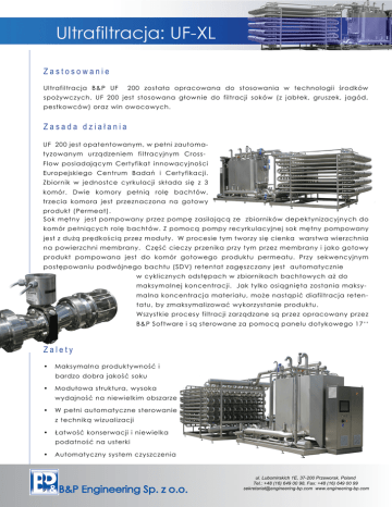 Ultrafiltracja: UF-XL Zastosowanie Ultrafiltracja B&P UF 200 została opracowana do stosowania w technologii środków spożywczych. UF 200 jest stosowana głownie do filtracji soków (z jabłek, gruszek, jagód, pestkowców) oraz win owocowych. Zasada działania UF 200 jest opatentowanym, w pełni zautomatyzowanym urządzeniem filtracyjnym CrossFlow posiadającym Certyfikat innowacyjności Europejskiego Centrum Badań i Certyfikacji. Zbiornik w jednostce cyrkulacji składa się z 3 komór. Dwie komory pełnią rolę bachtów, trzecia komora jest przeznaczona na gotowy produkt (Permeat). Sok mętny jest pompowany przez pompę zasilającą ze zbiorników depektynizacyjnych do komór pełniących rolę bachtów. Z pomocą pompy recyrkulacyjnej sok mętny pompowany jest z dużą prędkością przez moduły. W procesie tym tworzy się cienka warstwa wierzchnia na powierzchni membrany. Część cieczy przenika przy tym przez membrany i jako gotowy produkt pompowana jest do komór gotowego produktu permeatu. Przy sekwencyjnym postępowaniu podwójnego bachtu (SDV) retentat zagęszczany jest automatycznie w cyklicznych odstępach w zbiornikach bachtowych aż do maksymalnej koncentracji. Jak tylko osiągnięta zostania maksymalna koncentracja materiału, może nastąpić diafiltracja retentatu, by zmaksymalizować wykorzystanie produktu. Wszystkie procesy filtracji zarządzane są przez opracowany przez B&P Software i są sterowane za pomocą panelu dotykowego 17‘‘ Zalety • Maksymalna produktywność i bardzo dobra jakość soku • Modułowa struktura, wysoka wydajność na niewielkim obszarze • W pełni automatyczne sterowanie z techniką wizualizacji • Łatwość konserwacji i niewielka podatność na usterki • Automatyczny system czyszczenia B&P Engineering Sp. z o.o. ul. Lubomirskich 1E, 37-200 Przeworsk, Poland Tel.: +48 (16) 649 00 98, Fax: +48 (16) 649 00 99 [email protected] www.engineering-bp.com Ultrafiltracja: UF-XL Dane techniczne Wydajność 10 m 3 /h - 40m 3 /h Moduły membrany PCI A 19 PVDV Typ FPA 10/20 Długość modułu 3660 mm (12 stóp) / 3000 mm (10 stóp) Ilość membran w module 19 Powierzchnia filtracji 100-300 m 2 Zakres temperatury 10-55 o C Zakres pH 1,5-10,5 Maksymalne ciśnienie pracy 7 bar Materiały Części produktu: stal szlachetna AISI 316/304 Konstrukcja ram: stal szlachetna AISI 316/304 Uszczelnienia: EPDM (FDA) Zakres dostawy Pompy i zbiorniki są montowane wraz z szafą sterowniczą na ramach, jednostką modułu filtra, w pełni automatycznym sterowaniem Siemens SP7 z panelem dotykowym 17‘‘. Opcje • Zbiornik wody o pojemności 20 m³, wyposażony w automatyczny system do podgrzewania wody • Zbiornik osadowy o objętości 20 m³ • Zbiornik na resztki chemikaliów i resztki produkcyjne o pojemności 20 m³ . B&P Engineering Sp. z o.o. ul. Lubomirskich 1E, 37-200 Przeworsk, Poland Tel.: +48 (16) 649 00 98, Fax: +48 (16) 649 00 99 [email protected] www.engineering-bp.com
