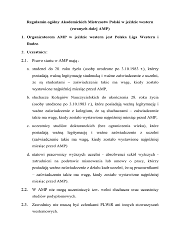 Regulamin ogólny Akademickich Mistrzostw Polski w jeździe western (zwanych dalej AMP) 1. Organizatorem AMP w jeździe western jest Polska Liga Western i Rodeo 2. Uczestnicy: 2.1. Prawo startu w AMP mają : a. studenci do 28. roku życia (osoby urodzone po 3.10.1983 r.), którzy posiadają ważną legitymację studencką i ważne zaświadczenie z uczelni, że są studentami – zaświadczenie takie ma wagę, kiedy zostało wystawione najpóźniej miesiąc przed AMP, b. słuchacze Kolegiów Nauczycielskich do ukończenia 28. roku życia (osoby urodzone po 3.10.1983 r.), które posiadają ważną legitymację i ważne zaświadczenie z kolegium, że są słuchaczami – zaświadczenie takie ma wagę, kiedy zostało wystawione najpóźniej miesiąc przed AMP, c. uczestnicy studiów doktoranckich (bez ograniczenia wieku), które posiadają ważną legitymację i ważne zaświadczenie z uczelni (zaświadczenie takie ma wagę, kiedy zostało wystawione najpóźniej miesiąc przed AMP) d. etatowi pracownicy wyższych uczelni - absolwenci szkół wyższych zatrudnieni na podstawie mianowania lub umowy o pracę, którzy posiadają ważne zaświadczenie z działu kadr uczelni, że są pracownikami – zaświadczenie takie ma wagę, kiedy zostało wystawione najpóźniej miesiąc przed AMP). 2.2. W AMP nie mogą uczestniczyć tzw. wolni słuchacze oraz uczestnicy studiów podyplomowych. 2.3. Zawodnicy nie muszą być członkami PLWiR ani innych stowarzyszeń westernowych. 3. Klasy i konkurencje 3.1. Klasy konkursów: a. Profi (zawodnicy, którzy posiadają uprawnienia zawodowe z jazdy western, bądź są jeźdźcami czerpiącymi korzyści finansowe z treningu koni westernowych, bądź są trenerami, instruktorami czerpiącymi korzyści finansowe z nauczania jeździectwa westernowego, treningu koni lub są właścicielami lub współwłaścicielami westernowych ośrodków jeździeckich, są to także zawodnicy, którzy startowali w Mistrzostwach Polski PLWiR, PLQHA, PZJ (western) oraz innych organizacji westernowych na świecie w latach 2008-2011). b. Amator (pozostali - osoby amatorsko uprawiające jazdę western) 3.2. Rywalizacja o tytuł Akademickiego Mistrza Polski w jeździe western przebiega w następujących konkurencjach: a. barrel racing (Amator i Profi) b. western pleasure (Amator i Profi) c. trail (Amator i Profi) d. western horsemanship (tylko klasa Amator) e. reining (tylko klasa Profi) 3.3. Organizator może podjąć decyzję, że nie zostanie rozegrana konkurencja, do której zgłosi się mniej niż 3 zawodników. 4. Zasady uczestnictwa 4.1. Podczas AMP zawodnik reprezentuje uczelnię a nie klub, do którego należy. 4.2. Podczas trwania zawodów (także poza przejazdami) zawodników obowiązuje zachowanie godne studenta - reprezentanta swojej uczelnia a także postawa zgodna z normami zachowania społecznego. 4.3. Zawodnicy startujący nie mogą być pod wpływem alkoholu lub innych środków odurzających (Uchwała Zarządu PLWiR 23/10) 4.4. Do startu zostaną dopuszczeni zawodnicy, którzy zgłoszą się w terminie do zawodów (nie przewiduje się systemu kwalifikacji do AMP). 4.5. Zawodnicy dopuszczeni zostaną do zawodów po przedłożeniu zaświadczenia lekarskiego o braku przeciwwskazań do startu w zawodach jeździeckich. 4.6. Zawodnik ma prawo zapisania się do konkurencji tylko w jednej klasie. 4.7. Amator może zapisać się do konkurencji w klasie Profi. Profi nie może zapisać się do klasy Amator. 4.8. Konkursy przeprowadzane są bez podziału na kategorie wiekowe koni. 4.9. W klasie Amator jeden koń może wystartować w konkurencji dwa razy pod dwoma różnymi jeźdźcami (oprócz konkurencji western pleasure i western horsemanship). 4.10. Dwa przejazdy w barrel racing traktowane są jako jeden start konia. 4.11. Koń startujący w AMP musi posiadać paszport wraz z aktualnymi wpisami (szczepienia). 4.12. Obowiązują przepisy PLWiR. Wyjątek w klasie Amator tylko dla osób, które nigdy nie startowały w zawodach ogólnopolskich lub zawodach międzynarodowych organizowanych jako kwalifikacje do mistrzostw Polski ani w zawodach ogólnopolskich lub międzynarodowych innych stowarzyszeń westernowych (oświadczenie zawodnika na druku przygotowanym przez organizatora) - any bit/two hands: każdy koń, niezależnie od wieku, może być prowadzony za pomocą snaffle bit (wędzidła) lub curb-bit (czanki); jeździec prowadzący konia jedną ręką musi wykonać w ten sposób cały przejazd; jeździec prowadzący konia oburącz musi wykonać w ten sposób cały przejazd. 4.13. Zawodnicy są zobowiązani posiadać swoje numery startowe jeżeli są członkami PLWiR. Zawodnicy z innych stowarzyszeń westernowych i niezrzeszeni otrzymają numery startowe od organizatora. 4.14. Zawodnik ma prawo zapisać się do wszystkich konkurencji w odpowiedniej klasie, musi jednak wziąć pod uwagę przepis, iż koń w ciągu jednego dnia może wystartować maksymalnie 4 razy (Uchwała nr 6/2010 Walnego Zebrania Polskiej Ligi Western i Rodeo z dnia 20 marca 2010 r.). 5. Opłaty: 5.1. Opłata wpisowa: 50 zł 5.2. Opłata startowa: 10 zł od konkurencji. 6. Nagrody: 6.1. Puchary dla pierwszych trzech zawodników 6.2. Dyplomy, flot’s.