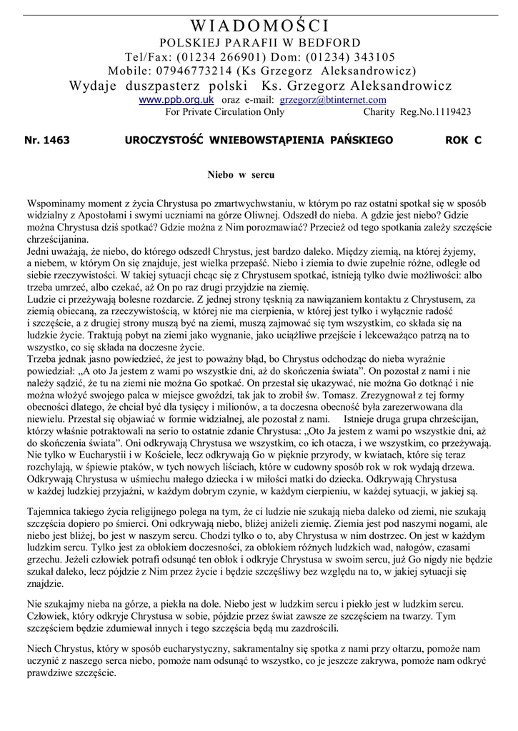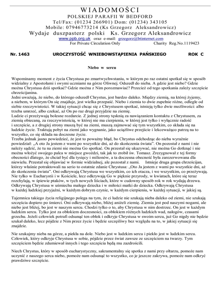 WIADOMOŚCI POLSKIEJ PARAFII W BEDFORD Tel/Fax: (01234 266901) Dom: (01234) 343105 Mobile: 07946773214 (Ks Grzegorz Aleksandrowicz) Wydaje duszpasterz polski Ks. Grzegorz Aleksandrowicz www.ppb.org.uk oraz e-mail: [email protected] For Private Circulation Only Charity Reg.No.1119423 Nr. 1463 UROCZYSTOŚĆ WNIEBOWSTĄPIENIA PAŃSKIEGO ROK C Niebo w sercu Wspominamy moment z życia Chrystusa po zmartwychwstaniu, w którym po raz ostatni spotkał się w sposób widzialny z Apostołami i swymi uczniami na górze Oliwnej. Odszedł do nieba. A gdzie jest niebo? Gdzie można Chrystusa dziś spotkać? Gdzie można z Nim porozmawiać? Przecież od tego spotkania zależy szczęście chrześcijanina. Jedni uważają, że niebo, do którego odszedł Chrystus, jest bardzo daleko. Między ziemią, na której żyjemy, a niebem, w którym On się znajduje, jest wielka przepaść. Niebo i ziemia to dwie zupełnie różne, odległe od siebie rzeczywistości. W takiej sytuacji chcąc się z Chrystusem spotkać, istnieją tylko dwie możliwości: albo trzeba umrzeć, albo czekać, aż On po raz drugi przyjdzie na ziemię. Ludzie ci przeżywają bolesne rozdarcie. Z jednej strony tęsknią za nawiązaniem kontaktu z Chrystusem, za ziemią obiecaną, za rzeczywistością, w której nie ma cierpienia, w której jest tylko i wyłącznie radość i szczęście, a z drugiej strony muszą być na ziemi, muszą zajmować się tym wszystkim, co składa się na ludzkie życie. Traktują pobyt na ziemi jako wygnanie, jako uciążliwe przejście i lekceważąco patrzą na to wszystko, co się składa na doczesne życie. Trzeba jednak jasno powiedzieć, że jest to poważny błąd, bo Chrystus odchodząc do nieba wyraźnie powiedział: „A oto Ja jestem z wami po wszystkie dni, aż do skończenia świata”. On pozostał z nami i nie należy sądzić, że tu na ziemi nie można Go spotkać. On przestał się ukazywać, nie można Go dotknąć i nie można włożyć swojego palca w miejsce gwoździ, tak jak to zrobił św. Tomasz. Zrezygnował z tej formy obecności dlatego, że chciał być dla tysięcy i milionów, a ta doczesna obecność była zarezerwowana dla niewielu. Przestał się objawiać w formie widzialnej, ale pozostał z nami. Istnieje druga grupa chrześcijan, którzy właśnie potraktowali na serio to ostatnie zdanie Chrystusa: „Oto Ja jestem z wami po wszystkie dni, aż do skończenia świata”. Oni odkrywają Chrystusa we wszystkim, co ich otacza, i we wszystkim, co przeżywają. Nie tylko w Eucharystii i w Kościele, lecz odkrywają Go w pięknie przyrody, w kwiatach, które się teraz rozchylają, w śpiewie ptaków, w tych nowych liściach, które w cudowny sposób rok w rok wydają drzewa. Odkrywają Chrystusa w uśmiechu małego dziecka i w miłości matki do dziecka. Odkrywają Chrystusa w każdej ludzkiej przyjaźni, w każdym dobrym czynie, w każdym cierpieniu, w każdej sytuacji, w jakiej są. Tajemnica takiego życia religijnego polega na tym, że ci ludzie nie szukają nieba daleko od ziemi, nie szukają szczęścia dopiero po śmierci. Oni odkrywają niebo, bliżej aniżeli ziemię. Ziemia jest pod naszymi nogami, ale niebo jest bliżej, bo jest w naszym sercu. Chodzi tylko o to, aby Chrystusa w nim dostrzec. On jest w każdym ludzkim sercu. Tylko jest za obłokiem doczesności, za obłokiem różnych ludzkich wad, nałogów, czasami grzechu. Jeżeli człowiek potrafi odsunąć ten obłok i odkryje Chrystusa w swoim sercu, już Go nigdy nie będzie szukał daleko, lecz pójdzie z Nim przez życie i będzie szczęśliwy bez względu na to, w jakiej sytuacji się znajdzie. Nie szukajmy nieba na górze, a piekła na dole. Niebo jest w ludzkim sercu i piekło jest w ludzkim sercu. Człowiek, który odkryje Chrystusa w sobie, pójdzie przez świat zawsze ze szczęściem na twarzy. Tym szczęściem będzie zdumiewał innych i tego szczęścia będą mu zazdrościli. Niech Chrystus, który w sposób eucharystyczny, sakramentalny się spotka z nami przy ołtarzu, pomoże nam uczynić z naszego serca niebo, pomoże nam odsunąć to wszystko, co je jeszcze zakrywa, pomoże nam odkryć prawdziwe szczęście. UROCZYSTOŚĆ WNIEBOWSTĄPIENIA PAŃSKIEGO Rok C Godz. 9.00 - W intencji dzieci Komunijnych. Godz.11.30 - W intencji dzieci Komunijnych. Godz.19.00 O zdrowie i błog.Boże dla Dawida Wodeckiego z ok.7-ych urodzin–int. rodziców. Poniedziałek,9.5.201 - UROCZYSTOŚĆ ŚW. STANISŁAWA, BISKUPA I MĘCZENNIKA BIAŁY TYDZIEŃ Godz. 9.30 -O łaskę wiary dla Justin za wstawiennictwem św.Stanisława - int. P. Ewy Allan. Dzieci Komunijnych Godz.19.00 -za dusze ś.p. Józefy Sieńko w 4-ta rocznicę śmierci - int. syna. Wtorek, 10.5.2016 Godz. 9.30 - za dusze ś.p. Anny Chalcarz - int. Pani Anny Kołodziej. Godz.19.00 - Intencja wolna. Środa, 11.5.2016 Godz. 9.30 - Intencja wolna. Godz.19.00 - Intencja wolna. NABOŻEŃSTWO MAJOWE. Niedziela, 8.5.2016 Czwartek,12.5.2016 Godz. 9.30 Godz.19.00 Piątek, 13.5.2016 Godz. 15.00 M.Bożej Fatimskiej Godz. 19.00 za dusze ś.p.Władysława Bortkiewicz i Krystyny Kulesz - int.rodziny Guzińskich. - Intencja wolna. - za dusze ś.p. Bronisława Guzińskiego w 11-tą rocznicę śmierci - int. rodziny - Intencja wolna. Koronka do Miłosierdzia Bożego. Sobota, 14.5.2016 Godz. 9.30 - za dusze ś.p. Feliksa Romanowskiego i zmarłych z rodziny. Zakończenie Białe- Godz. 10.00 NABOŻEŃSTWO MAJOWE. Spowiedź dzieci Komunijnych ( rocznica ). go Tygodnia: g.9.30 Godz. 19.00 - Intencja wolna. Niedziela, 15.5.2016 Godz. 9.30 Godz.11.00 Godz.19.00 Poniedziałek, 16.5.2016 Godz. 9.30 UROCZYSTOŚĆ ZESŁANIA DUCHA ŚWIĘTEGO Rok C za ś.p.Stanisława i Stanisławy Buźniak i Stanislawa Kulasińskiego–int.córki z rodzin - W intencji dzieci w rocznicę Pierwszej Komunii Świętej. - za dusze ś.p. Marianny Garbowskiej w rocznicę śmierci - int. rodziny. - Intencja wolna. Godz.19.00 - Intencja wolna. Wtorek, 17.5.2016 Godz. 9.30 Godz.19.00 Środa, 18.5.2016 Godz. 9.30 Go