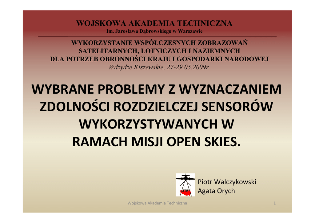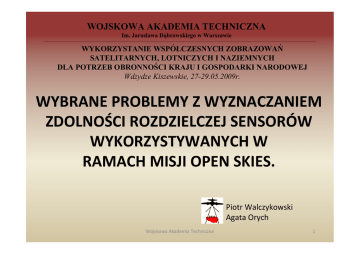 WOJSKOWA AKADEMIA TECH ICZ A Im. Jarosława Dąbrowskiego w Warszawie WYKORZYSTA IE WSPÓŁCZES YCH ZOBRAZOWAŃ SATELITAR YCH, LOT ICZYCH I AZIEM YCH DLA POTRZEB OBRO OŚCI KRAJU I GOSPODARKI ARODOWEJ Wdzydze Kiszewskie, 27-29.05.2009r. WYBRANE PROBLEMY Z WYZNACZANIEM ZDOLNOŚCI ROZDZIELCZEJ SENSORÓW WYKORZYSTYWANYCH W RAMACH MISJI OPEN SKIES. Piotr Walczykowski Agata Orych Wojskowa Akademia Techniczna 1 Wojskowa Akademia Techniczna 2 TRAKTAT OPEN SKIES Wojskowa Akademia Techniczna 3 „Wysokość lotu samolotu obserwacyjnego nad powierzchnią ziemi nie pozwala Stronie obserwującej na przekroczenie ograniczeń rozdzielczości terenowej aparatury obserwacyjnej zgodnie z postanowieniami artykułu IV ustęp 2”, czyli w przypadku sensorów pozyskujących zobrazowania w zakresie widzialnym, „rozdzielczość terenowa nie może przekraczać 30 centymetrów przy najmniejszej wysokości lotu nad poziomem terenu” a w zakresie podczerwonym – 50cm Treaty on Open Skies, Helsinki, 24 marca 1992 r. Wojskowa Akademia Techniczna 4 TERENOWA ZDOLNOŚC RODZIELCZA Terenowa zdolność rozdzielcza definiowana jest jako najmniejsza rozróżnialna wielkość widoczna na zobrazowaniu. W rozpoznaniu obrazowym wyróżnia się 5 podstawowych poziomów jakościowych informacji obrazowej: •Wykrycie – Odkrycie obecności obiektu, jego zlokalizowanie. •Ogólna identyfikacja – Ustalenie klasy obiektu. •Precyzyjna identyfikacja – Dokładne przyporządkowanie obiektu do danego typu. •Opis – Wymiary, wyposażenie, szczegóły konstrukcyjne. •Analiza techniczna – Dokładna analiza specyficznego wyposażenia. Wojskowa Akademia Techniczna 5 Identyfikacja Obiekt Wykrycie Opis Analiza techniczna Ogólna Precyzyjna 6 4.5 1.5 1 0.3 3 1-1.5 0.3 0.15 0.015 6 4.5 3 0.3 0.15 1 0.6 0.15 0.05 0.045 4.5 1.5 1 0.15 0.045 3 1.5 0.6 0.3 0.045 10-30 4.5-6 0.6-1.5 0.3-1 0.3-0.045 Broń atomowa 2.5 1.5 0.3 0.03 0.0015 Pojazdy 1.5 0.6 0.3 0.06 0.0045 Pola minowe 3-9 6 1 0.03 n/a Porty morskie 30 15 6 3 0.3 Infrastruktura kolejowa 15-30 15 6 1.5 0.4 Drogi 10-20 5 1 0.6 0.4 60 30 3-5 1 0.75 Mosty Stacje radiolokacyjne Infrastruktura lotniskowa Rakiety i artyleria Samoloty Wyrzutnie pocisków Okręty i łodzie podwodne Tereny zurbanizowane METODY WYZNACZANIA ROZDZIELCZOŚCI a) Test paskowy do wyznaczania terenowej zdolności rozdzielczej. b) Test paskowy „USAF 1951” do wyznaczania zdolności rozdzielczej układów optycznych i materiałów światłoczułych c) Test kalibracyjny w postaci gwiazdy Siemensa d) Przekoszona krawędźWojskowa Akademia Techniczna 7 ARTEFAKTY NA ZOBRAZOWANIACH •Kadrowe Sensory analogowe •Sensory cyfrowe • Błędy spowodowane interpolacją barw w sensorze wykorzystującym filtr Bayer’a. •Blooming •Aliasing •Skanery liniowe •Sensory termalne Wojskowa Akademia Techniczna 8 CELE KALIBRACYJNE WAT Wojskowa Akademia Techniczna 9 NOWE CELE WAT Gwiazda Siemensa Przekoszona krawędź 6 cztero-sektorowych kwadratów Wojskowa Akademia Techniczna 10 DZIĘKUJĘ ZA UWAGĘ Wojskowa Akademia Techniczna 11