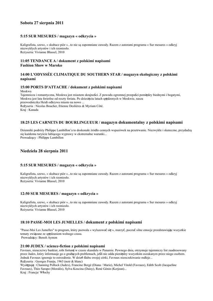 Sobota 27 sierpnia 2011 5:15 SUR MESURES / magazyn « odkrycia » Kaligrafista, szewc, « skubacz piór »...to nie są zapomniane zawody. Razem z autorami programu « Sur mesures » odkryj niezwykłych artystów i ich rzemiosło. Reżyseria: Vivianne Blassel, 2010 11:05 TENDANCE A / dokument z polskimi napisami Fashion Show w Maroko 14:00 L'ODYSSÉE CLIMATIQUE DU SOUTHERN STAR / magazyn ekologiczny z polskimi napisami 15:00 PORTS D'ATTACHE / dokument z polskimi napisami Moskwa Tajemnicza i romantyczna, Moskwa jest miastem skrajności. Z powodu ogromnej przepaści pomiędzy biednymi i bogatymi, Moskwa jest lata świetlne od reszty świata. Po dziesięciu latach spędzonych w Moskwie, nasza przewodniczka Heidi odkrywa miasto na nowo ... Reżyseria : Nicolas Boucher, Etienne Deslières & Myriam Côté. Kraj : Kanada 18:25 LES CARNETS DU BOURLINGUEUR / magazyn dokumentalny z polskimi napisami Dzienniki podróży Philippe Lambillon’a to doskonałe żródło cennych wspazówek na przetrwanie. Niezwykłe i skuteczne, przydadzą się każdemu turyście lubiącego wyprawy w ekstremalne warunki... Prowadzący : Philippe Lambillon Niedziela 28 sierpnia 2011 5:15 SUR MESURES / magazyn « odkrycia » Kaligrafista, szewc, « skubacz piór »...to nie są zapomniane zawody. Razem z autorami programu « Sur mesures » odkryj niezwykłych artystów i ich rzemiosło. Reżyseria: Vivianne Blassel, 2010 12:50 SUR MESURES / magazyn « odkrycia » Kaligrafista, szewc, « skubacz piór »...to nie są zapomniane zawody. Razem z autorami programu « Sur mesures » odkryj niezwykłych artystów i ich rzemiosło. Reżyseria: Vivianne Blassel, 2010 18:10 PASSE-MOI LES JUMELLES / dokument z polskimi napisami "Passe-Moi Les Jumelles" to program, który pozwala « wyluzować się », marzyć, poczuć silne emocje przedstawiając wszystkie tematy związane ze spędzaniem wolnego czasu. Prowadzący: Benoît Aymon 21:00 JUDEX / science-fiction z polskimi napisami Favraux, nieuczciwy bankier, robi fortunę w czasie skandalu w Panamie. Pewnego dnia, otrzymuje tajemniczy list zaadresowany przez Judex, który informauje go o grożących problemach, jeśli nie odda pieniędzy wszystkim oszukanym przez niego osobom. Jednak Favraux ignoruje to ostrzeżenie. W dzień ślubu swojej córki, Favraux nieoczekiwanie mdleje... Reżyseria : Georges Franju, 1963 (noir & blanc) Występują : Channing Pollock (Judex), Francine Bergé (Diana / Marie), Michel Vitold (Favraux), Edith Scob (Jacqueline Favraux), Théo Sarapo (Moralès), Sylva Koscina (Daisy), René Génin (Kerjean)... Kraj : Francja/ Włochy 22:40 SORTIE DE ROUTE / film krótkometrażowy z polskimi napisami 28-letni Saïd spotyka swojego ojca Kaddoura, który po 10 latach więzienia z powodu zabójstwa żony, wychodzi na wolność. Spotkanie jest trudne. Kaddour próbuje odbudować relacje z synem, Saïd ma w głowie zuepłnie inne plany... Reżyseria : Jonathan Hazan, 2010 Występują : Zakariya Gouram (Saïd), Hammou Graïa (Kaddour), Claire Dumas (kelnerka), Hugo Fernandes (chłopiec) Kraj : Francja 23:50 LA SAINTE VICTOIRE / dramat z polskimi napisami Xavier Alvarez jest architektem w Aix-en-Provence. Jego firma rozwija się, ale nie może wygrać przetargu na duże zamówienie publiczne, które pozwoliłoby Xavierowi na spełnienie swoich marzeń o wielkości. Przekonany o korzyściach wynikających ze zwycięstwa pewnego człowieka, decyduje się na wsparcie kampanii na stanowisko burmistrza, Vincent’a Cluzel’a ... Reżyseria : François Favrat, 2008 Występują : Clovis Cornillac (Xavier Alvarez), Christian Clavier (Vincent Cluzel), Sami Bouajila (Yacine Guesmila), Vimala Pons (Anaïs Cluzel), Maryline Canto (Géraldine Wood), Michel Aumont (Robert Richerand), Eric Berger (Tristan de Courson), Marianne Denicourt (Françoise Gleize)... Kraj : Francja 1:35 PORTS D'ATTACHE / magazyn podróżniczy z polskimi napisami Bangkok, smażone insekty o każdej porze Patpong, dzielnica Bangkoku. San Supathanakun odniosła duży sukces : na swojej furmance wystawia do wyboru smażone koniki polne i żuki, sałatki z mrówek, jedwabniki i czarne skorpiony, wysoko cenione dania w Tajlandii. Reżyseria : Matthias Heeder i Monika Hielscher, 2007. Kraj : Niemcy/ Francja Poniedziałek 29 sierpnia 2011 4:55 PASSE-MOI LES JUMELLES / dokument z polskimi napisami "Passe-Moi Les Jumelles" to program, który pozwala « wyluzować się », marzyć, poczuć silne emocje przedstawiając wszystkie tematy związane ze spędzaniem wolnego czasu. Prowadzący: Benoît Aymon 12:30 LES ÉNIGMES DU SPHINX / dokument z polskimi napisami Jeżeli wielkie piramidy w Gizie są chwałą Starożytnego Imperium Egiptu, nic lepiej nie obrazuje ich tajemnic jak Sfinks. Kto zbudował tego wielkiego piaskowego lwa z głową mężczyzny ? Jak i dlaczego ? Dwóch wybitnych egiptologów próbuje odpowiedzieć na pytania nurtujące wielu ludzi... Reżyseria : Christine Le Goff & Gary Glassman, 2010. Kraj : Francja 14:05 DES RACINES & DES AILES / dokument z polskimi napisami Mój raj we Francji 17:05 LE POINT / magazyn informacyjny (z polskimi napisami) prowadzący : Céline Galipeau. Dzięki dziennikarzom rozproszonym po całym świecie, magazyn « Le point » daje nastychmiastowy dostęp do każdego wydarzenia. Jest wiarygodnym źródłem wiedzy na temat tego, co dzieje się w najważniejszych obszarach wszsytkich kontynentów 22:00 L'ODYSSÉE CLIMATIQUE DU SOUTHERN STAR / dokument ekologiczny z polskimi napisami 23:50 LE DERNIER SOUFFLE / / film kryminalny z polskimi napisami Laurent Vaillancourt jest policjantem w Montréalu. Jego świat przewraca się do góry nogami, kiedy podczas śledztwa, w zamordowanym skinheadzie rozpoznaje swojego brata Martina, którego nie widział od dawna. Wyrusza na poszukiwanie morderców... Reżyseria : Richard Ciupka, 1999 Występują : Luc Picard (Laurent Vaillancourt), Julien Poulin (Norman Vaillancourt), Michel Goyette (Martin Vaillancourt), Serge Houde (Mitchum), Lorne Brass