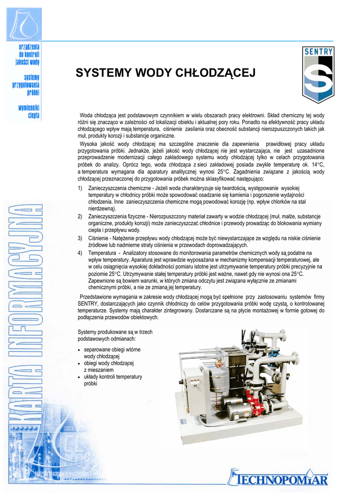 SYSTEMY WODY CHŁODZĄCEJ Woda chłodząca jest podstawowym czynnikiem w wielu obszarach pracy elektrowni. Skład chemiczny tej wody różni się znacząco w zależności od lokalizacji obiektu i aktualnej pory roku. Ponadto na efektywność pracy układu chłodzącego wpływ mają temperatura, ciśnienie zasilania oraz obecność substancji nierozpuszczonych takich jak muł, produkty korozji i substancje organiczne. Wysoka jakość wody chłodzącej ma szczególne znaczenie dla zapewnienia prawidłowej pracy układu przygotowania próbki. Jednakże, jeżeli jakość wody chłodzącej nie jest wystarczająca, nie jest uzasadnione przeprowadzenie modernizacji całego zakładowego systemu wody chłodzącej tylko w celach przygotowania próbek do analizy. Oprócz tego, woda chłodząca z sieci zakładowej posiada zwykle temperaturę ok. 14°C, a temperatura wymagana dla aparatury analitycznej wynosi 25°C. Zagadnienia związane z jakością wody chłodzącej przeznaczonej do przygotowania próbek można sklasyfikować następująco: 1) 2) 3) 4) Zanieczyszczenia chemiczne - Jeżeli woda charakteryzuje się twardością, występowanie wysokiej temperatury w chłodnicy próbki może spowodować osadzanie się kamienia i pogorszenie wydajności chłodzenia. Inne zanieczyszczenia chemiczne mogą powodować korozję (np. wpływ chlorków na stal nierdzewną). Zanieczyszczenia fizyczne - Nierozpuszczony materiał zawarty w wodzie chłodzącej (muł, małże, substancje organiczne, produkty korozji) może zanieczyszczać chłodnice i przewody prowadząc do blokowania wymiany ciepła i przepływu wody. Ciśnienie - Natężenie przepływu wody chłodzącej może być niewystarczające ze względu na niskie ciśnienie źródłowe lub nadmierne straty ciśnienia w przewodach doprowadzających. Temperatura - Analizatory stosowane do monitorowania parametrów chemicznych wody są podatne na wpływ temperatury. Aparatura jest wprawdzie wyposażana w mechanizmy kompensacji temperaturowej, ale w celu osiągnięcia wysokiej dokładności pomiaru istotne jest utrzymywanie temperatury próbki precyzyjnie na poziomie 25°C. Utrzymywanie stałej temperatury próbki jest ważne, nawet gdy nie wynosi ona 25°C. Zapewnione są bowiem warunki, w których zmiana odczytu jest związana wyłącznie ze zmianami chemicznymi próbki, a nie ze zmianą jej temperatury. Przedstawione wymagania w zakresie wody chłodzącej mogą być spełnione przy zastosowaniu systemów firmy SENTRY, dostarczających jako czynnik chłodniczy do celów przygotowania próbki wodę czystą, o kontrolowanej temperaturze. Systemy mają charakter zintegrowany. Dostarczane są na płycie montażowej w formie gotowej do podłączenia przewodów obiektowych. Systemy produkowane są w trzech podstawowych odmianach: • • • separowane obiegi wtórne wody chłodzącej obiegi wody chłodzącej z mieszaniem układy kontroli temperatury próbki Separowany obieg wtórny wody chłodzącej Problem: Zanieczyszczanie chłodnic próbek powoduje spadek wydajności chłodzenia. Sieciowa woda chłodząca charakteryzuje się twardością, zawiera muł, produkty korozji oraz substancje organiczne. Rozwiązanie: Separowany obieg wtórny wody chłodzącej stwarza barierę ochronną pomiędzy sieciową wodą chłodzącą a systemem przygotowania próbki. Opis: Ciepło z chłodnicy próbki jest odbierane za pomocą wody czystej i zmiękczonej. Z kolei woda czysta, krążąca w obiegu zamkniętym, jest chłodzona przez wodę sieciową przy użyciu wymiennika płytowego. Woda sieciowa nie jest narażona na wysokie temperatury występujące w chłodnicy próbki, co zapobiega osadzaniu się kamienia na elementach wymiennika płytowego. Jeżeli wymiennik płytowy zostanie zanieczyszczony mułem lub substancjami organicznymi, można go w prosty sposób wyczyścić. Ponadto, temperatura obiegu zamkniętego utrzymywana jest na stałym poziomie. Zawór rozdzielczy pozwala na przepływ części strumienia ciepłej wody obejściowo względem wymiennika płytowego, a następnie wymieszanie go z wodą schłodzoną. W ten sposób uzyskuje się stałą temperaturę w obiegu. Zwiększa się w ten sposób dokładność wskazań analizatorów, minimalizując wpływ zmian temperatury próbki. Natężenie przepływu wody sieciowej jest utrzymywane na wysokim poziomie w celu zminimalizowania zanieczyszczania układu. 24°C Płytowy wymiennik ciepła Wlot próbki gorącej 39°C Chłodnia kominowa, zbiornik Obieg wody czystej Obieg wody zanieczyszczonej 18°C 19°C Chłodnica próbki 25°C Wylot próbki chłodnej Obieg wody chłodzącej z mieszaniem Problem: Wskazania analizatorów są niedokładne ze względu na zmienną temperaturę próbki. Dostępna jest czysta i schłodzona woda zasilająca. Rozwiązanie: Obieg z mieszaniem utrzymuje stałą temperaturę wody chłodzącej próbkę. Opis: Utrzymywanie stałej temperatury jest uzyskiwane dzięki częściowemu wypuszczaniu z obiegu wody ciepłej, podgrzanej w chłodnicy próbki i zastąpieniu jej zimną wodą zasilającą. Temperatura wody zmieszanej jest precyzyjnie kontrolowana w granicach ±0.5°C od wartości zadanej. Wartość zadana może być ustawiana przez użytkownika, na poziomie wyższym o co najmniej kilka stopni od temperatura wody zasilającej. Jeżeli woda zasilająca jest schłodzona, możliwe jest utrzymywanie temperatury wody chłodzącej próbkę na poziomie 25°C przez cały rok. Poziom ten może być utrzymany tak długo jak temperatura wody zasilającej jest niższa niż 18°C. Obieg z mieszaniem jest standardowo stosowany przy chłodnicach drugiego stopnia w celu uzyskania stałej końcowej temperatury próbki. W takim przypadku, ze względu na niskie temperatury, nie występuje problem osadzania się kamienia. Natomiast w sytuacji współpracy z chłodnicami pierwszego stopnia należy zapewnić zasilanie wodą czystą i zmiękczoną. Wlot próbki gorącej 38°C Wylot wody ciepłej 1 TC 1 TI Chłodnica próbki 1 